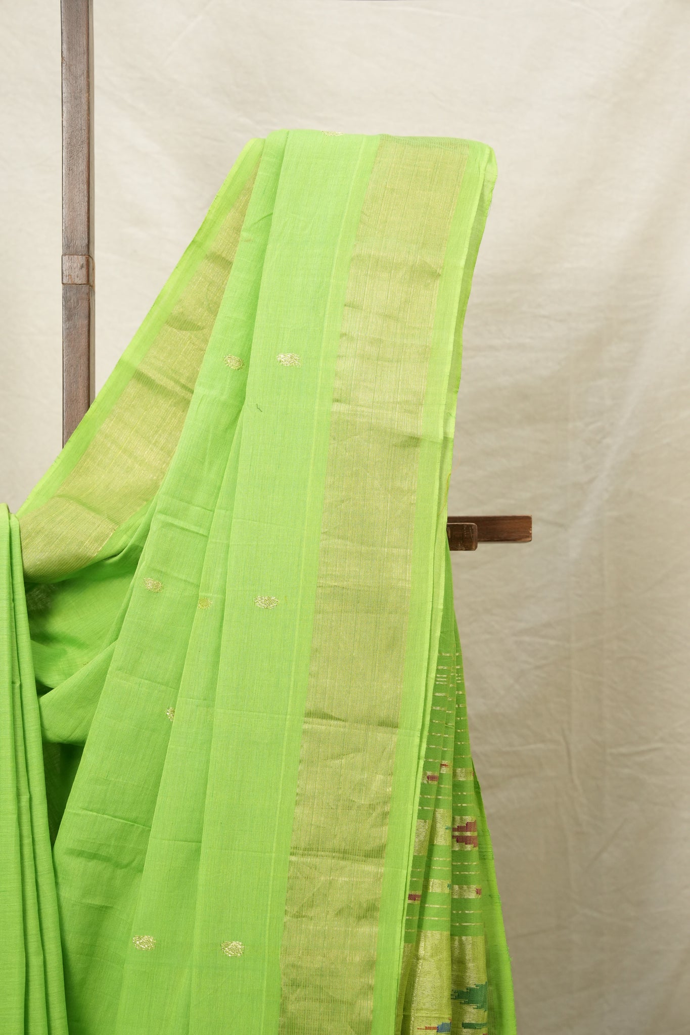 Work - Parrot green cotton paithani saree golden butti with tissue zari border and traditional pallu.