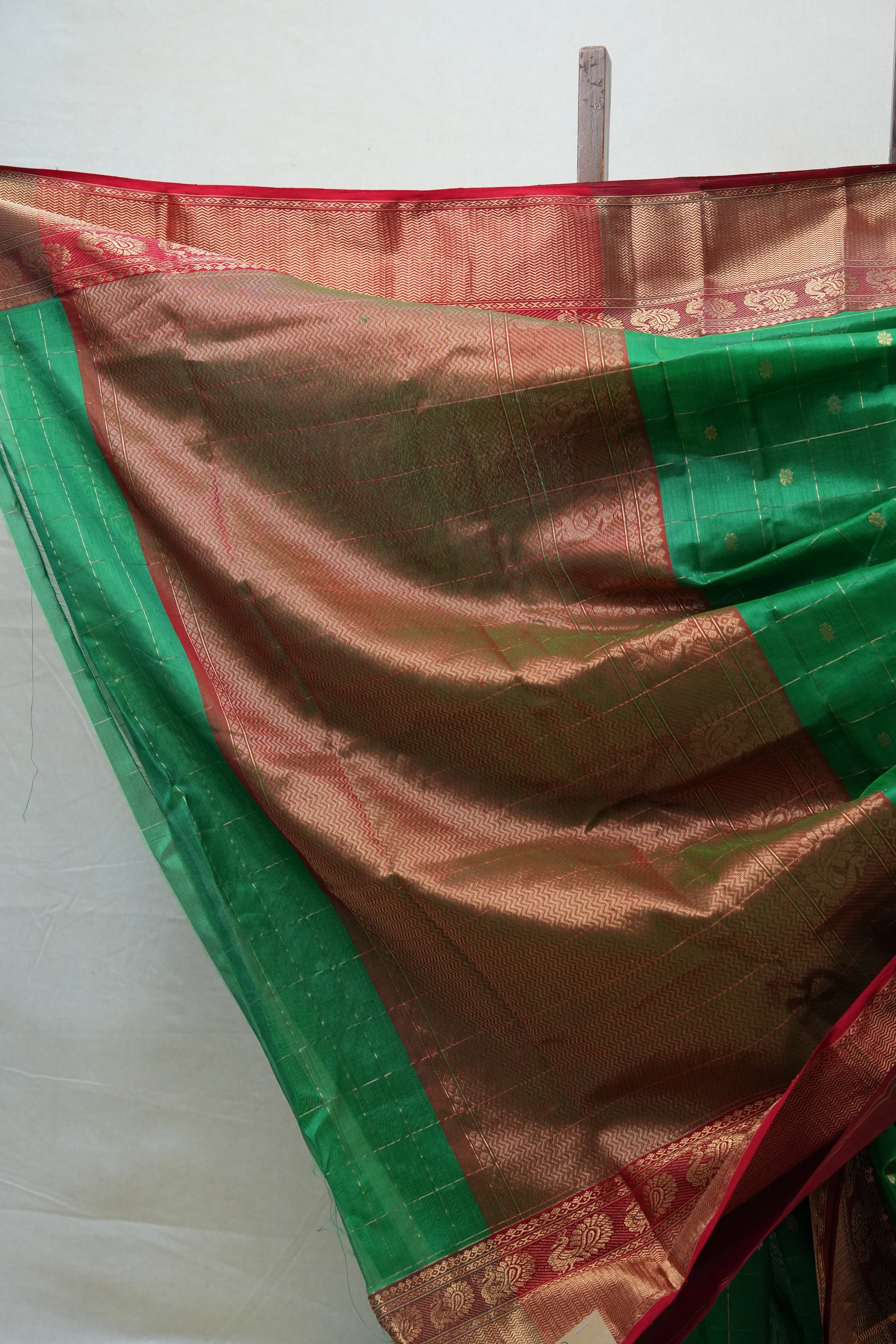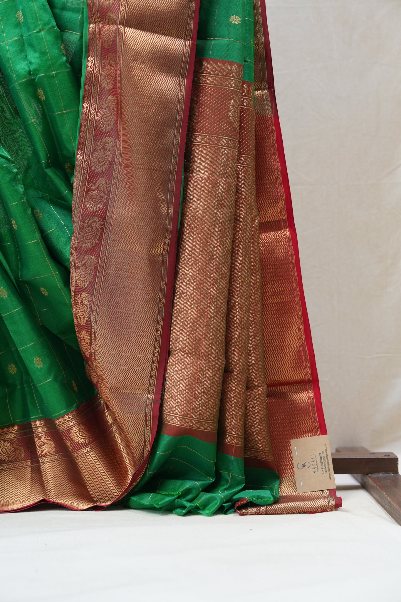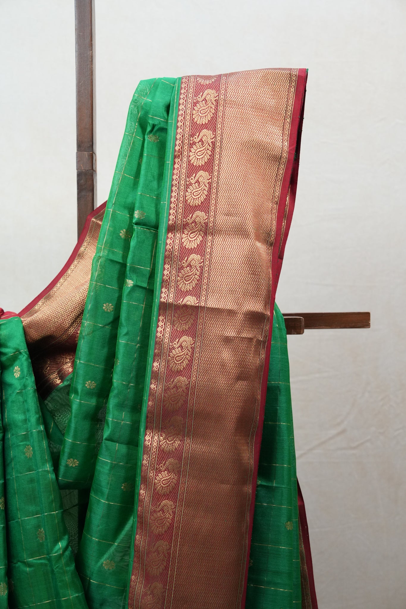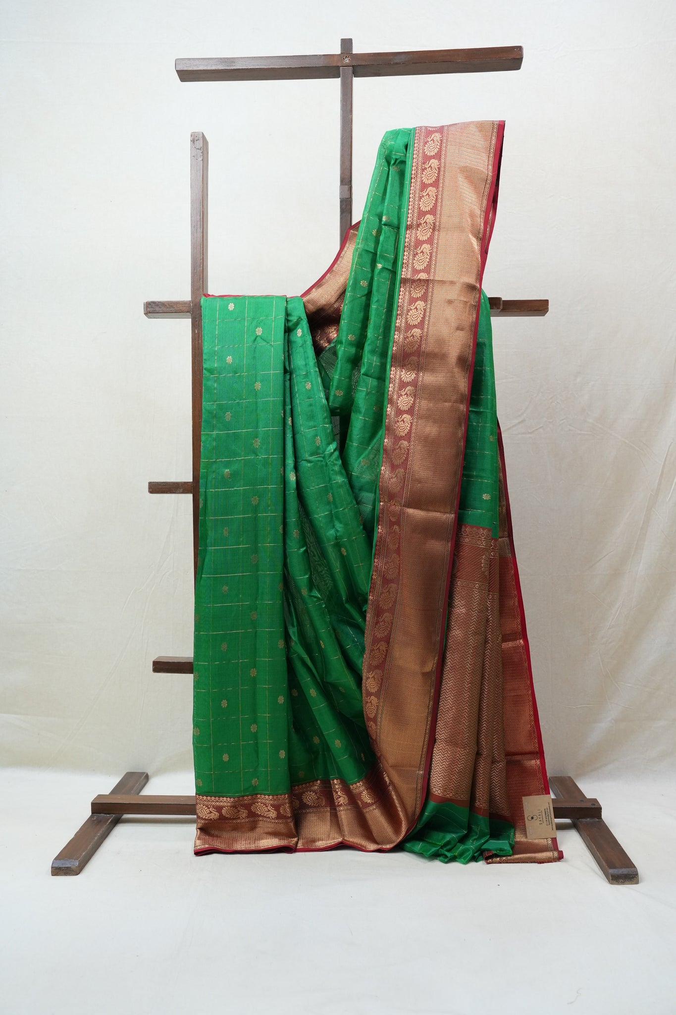 Work - Chanderi silk saree with green checks body, gold buti motifs, and elegant zari border.