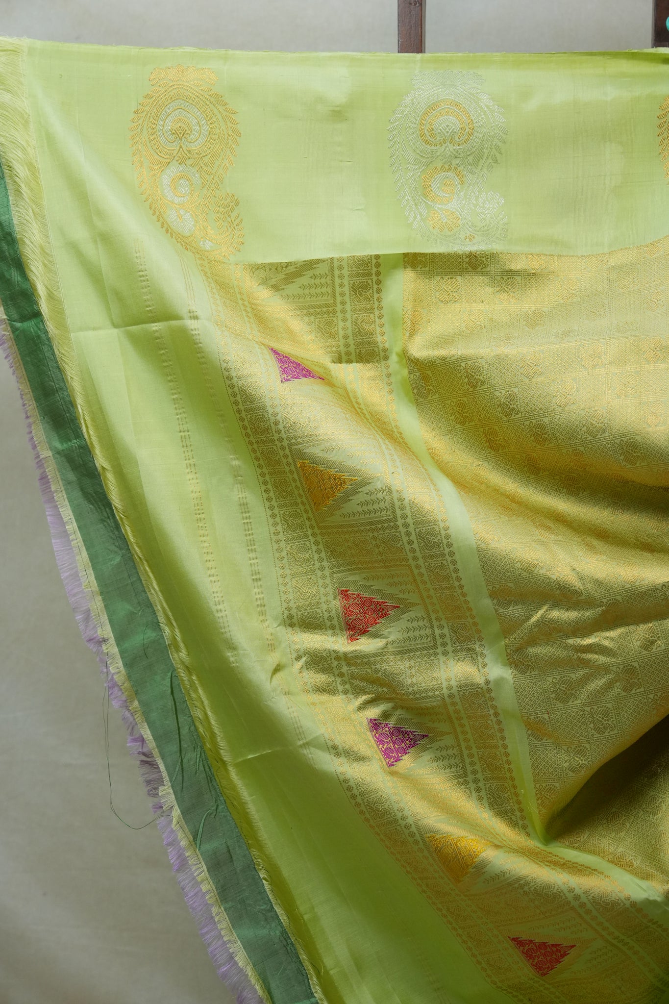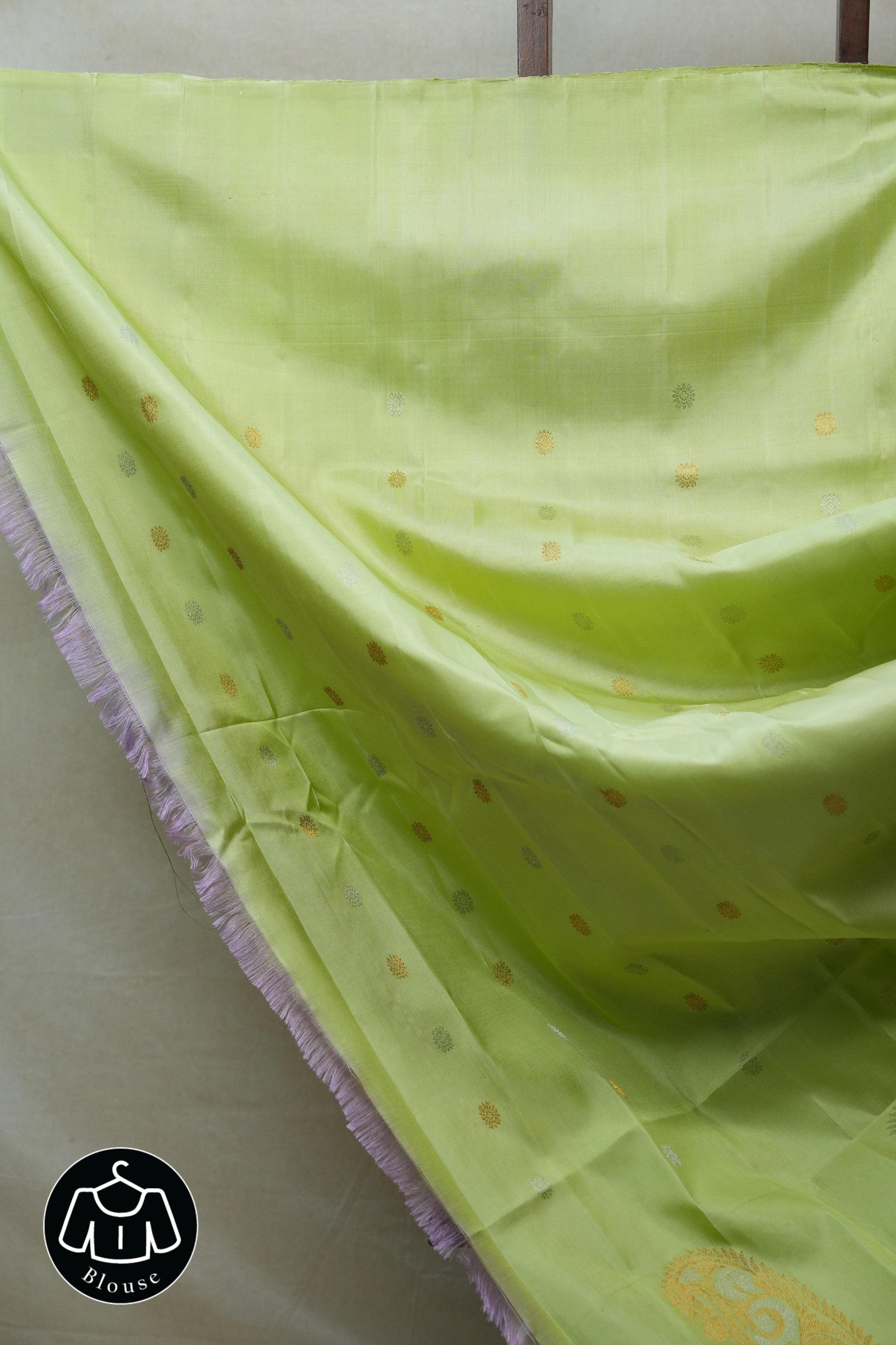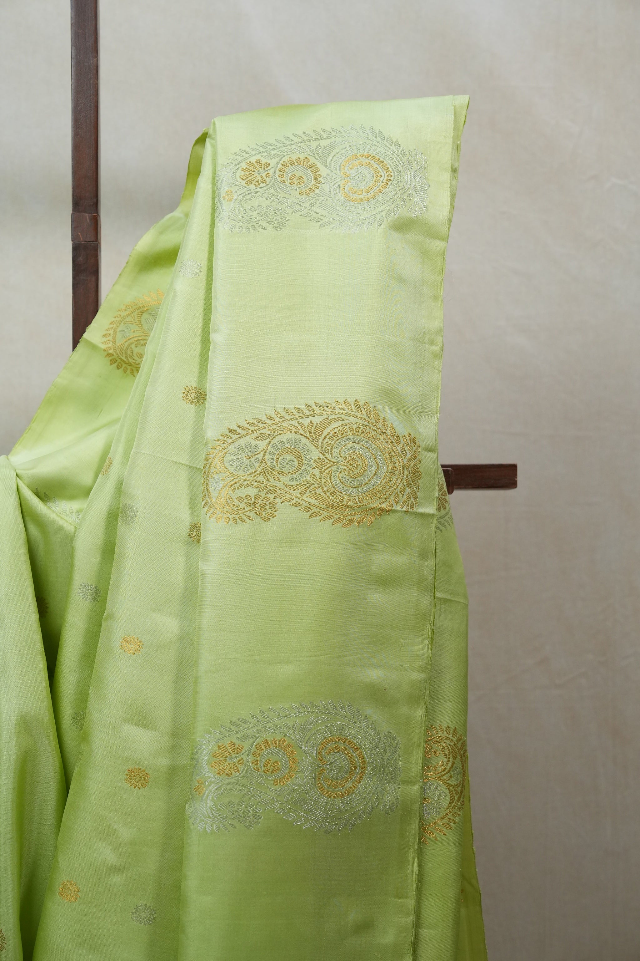 Work - This Gadwal silk saree features a pista green plain body adorned with small golden, silver buttas and a pista green border with pallu.
