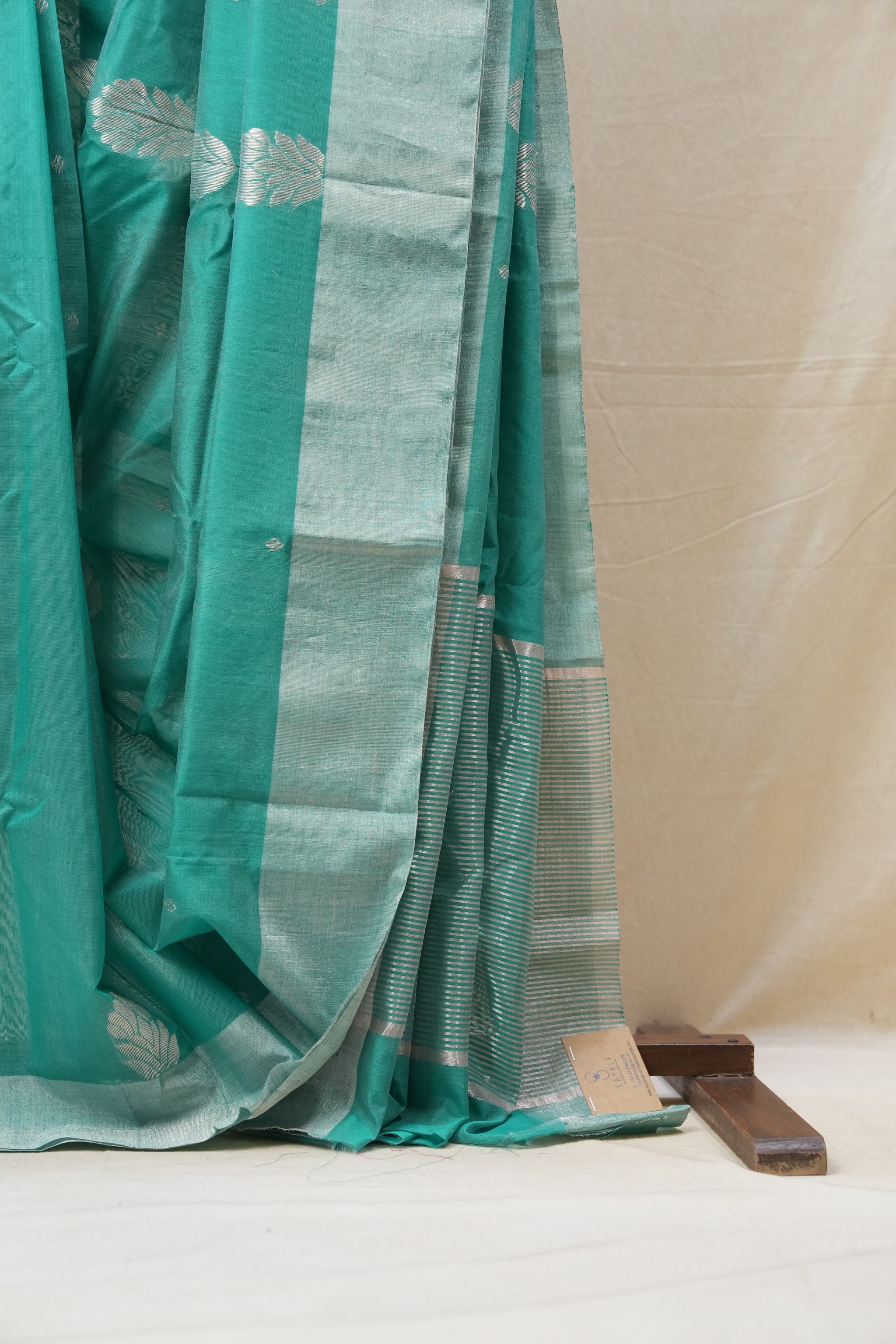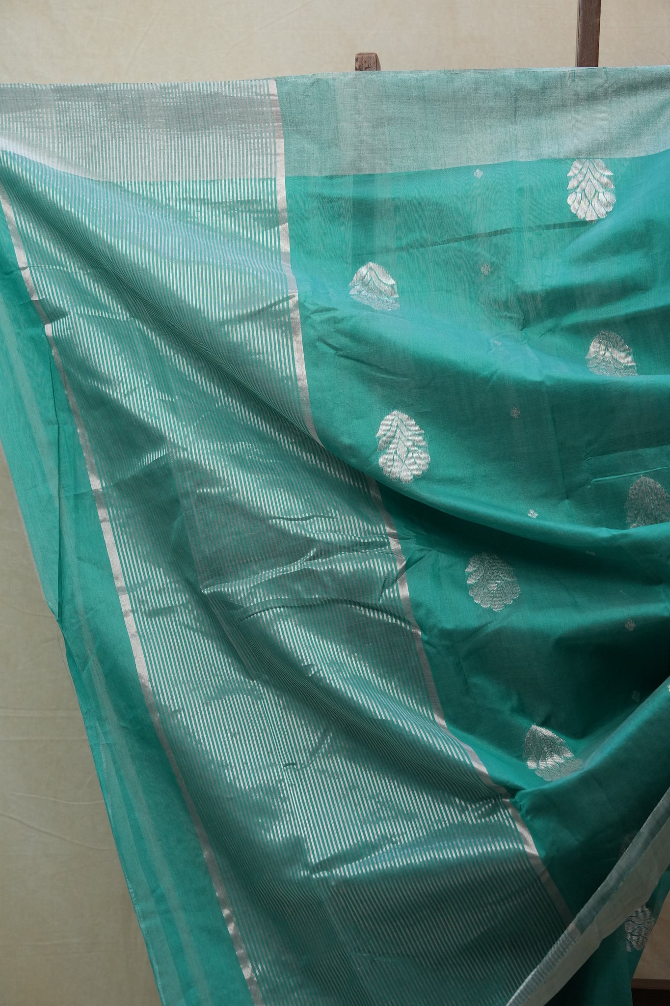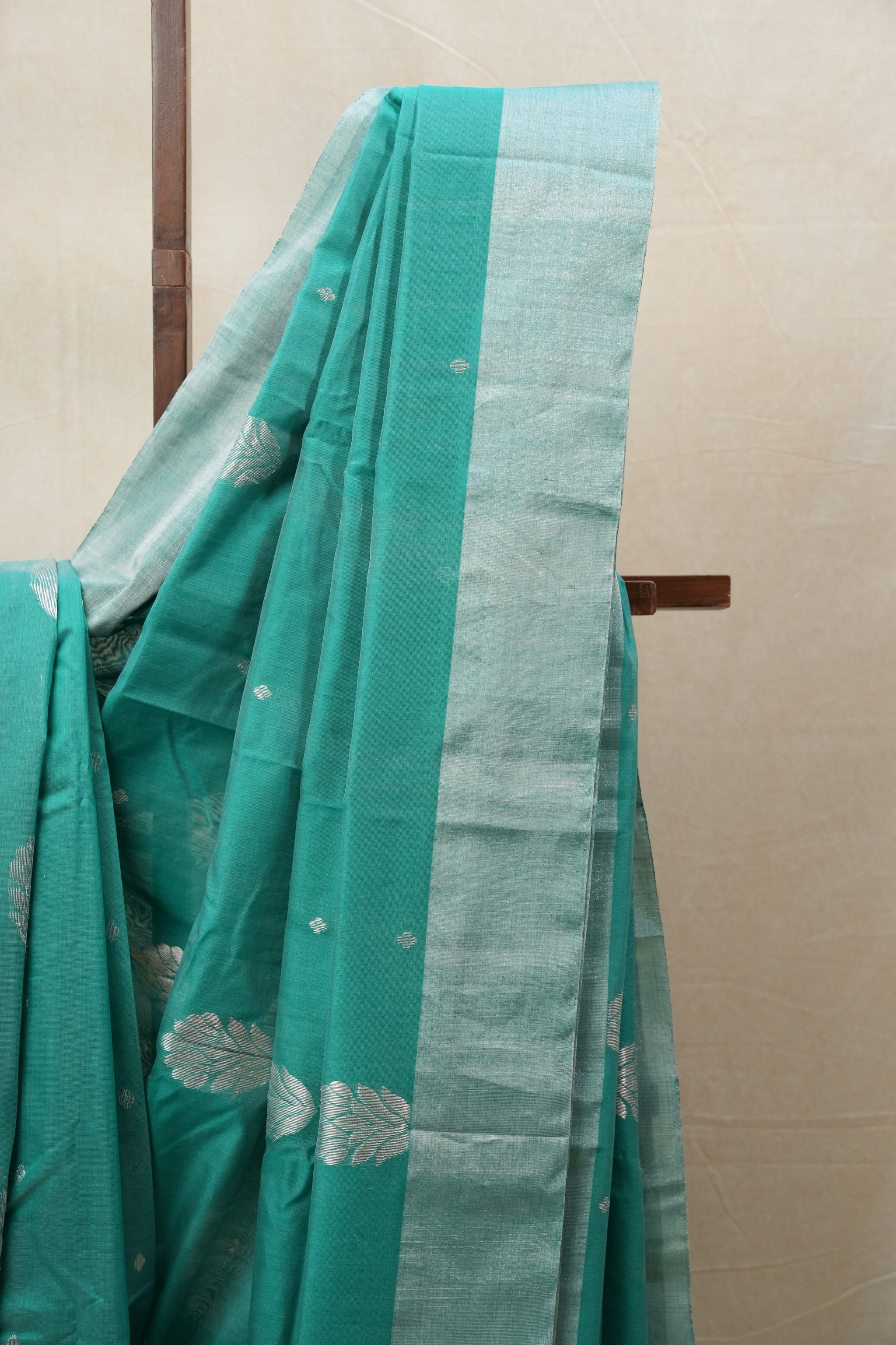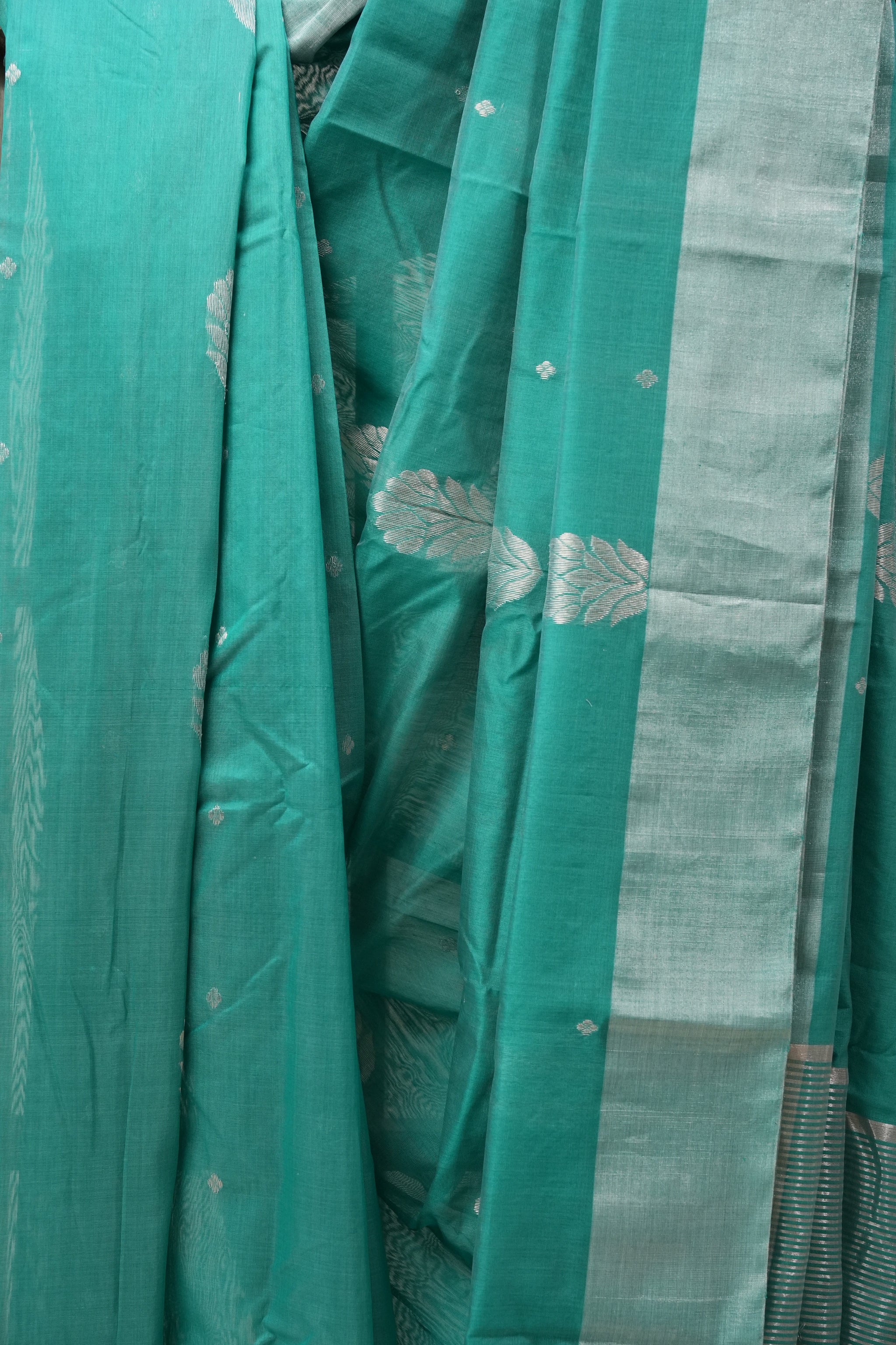 Work - Chanderi cotton silk saree with teal green body, gold buti motifs, and elegant zari border.