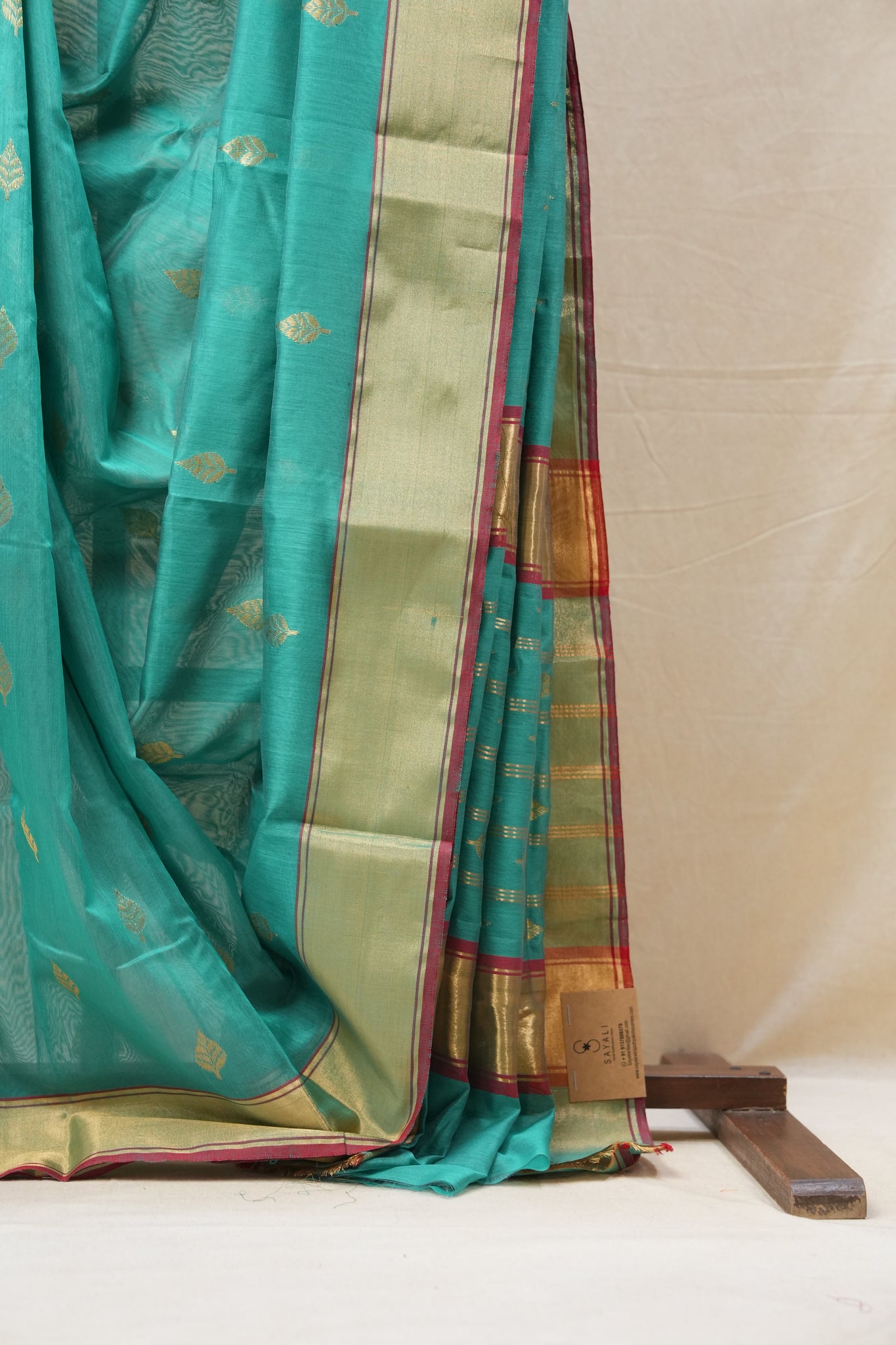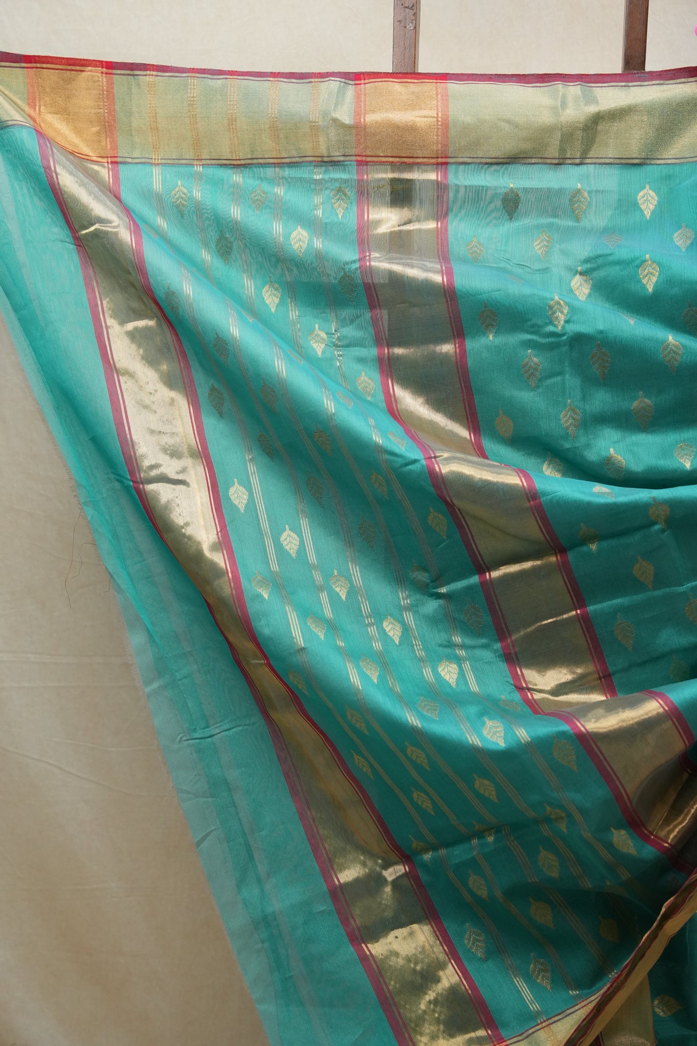 Work - Chanderi cotton silk saree with teal green body, gold buti motifs, and elegant zari border.