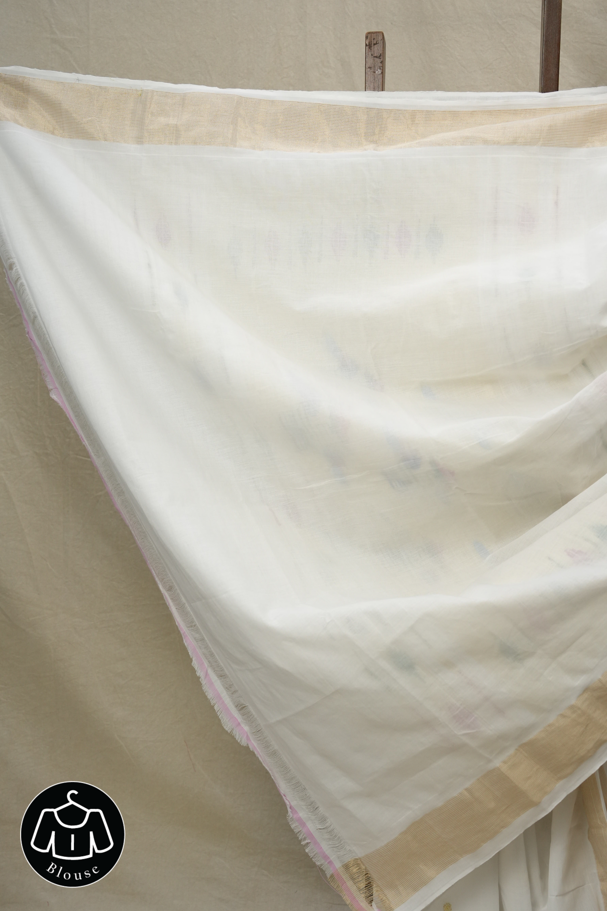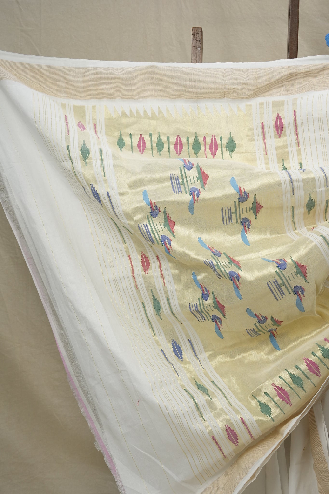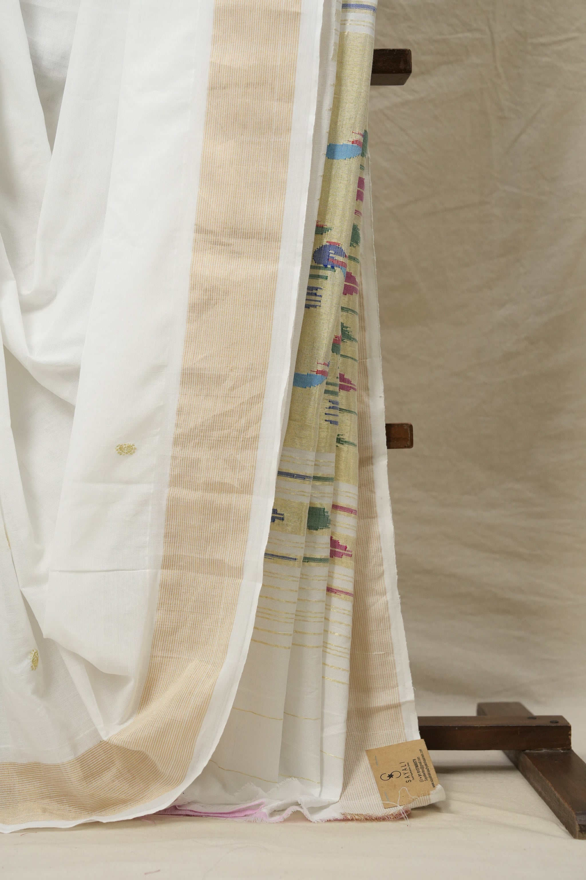 Work - White cotton paithani saree with golden butti and tissue zari border with morbangdi traditional pallu.