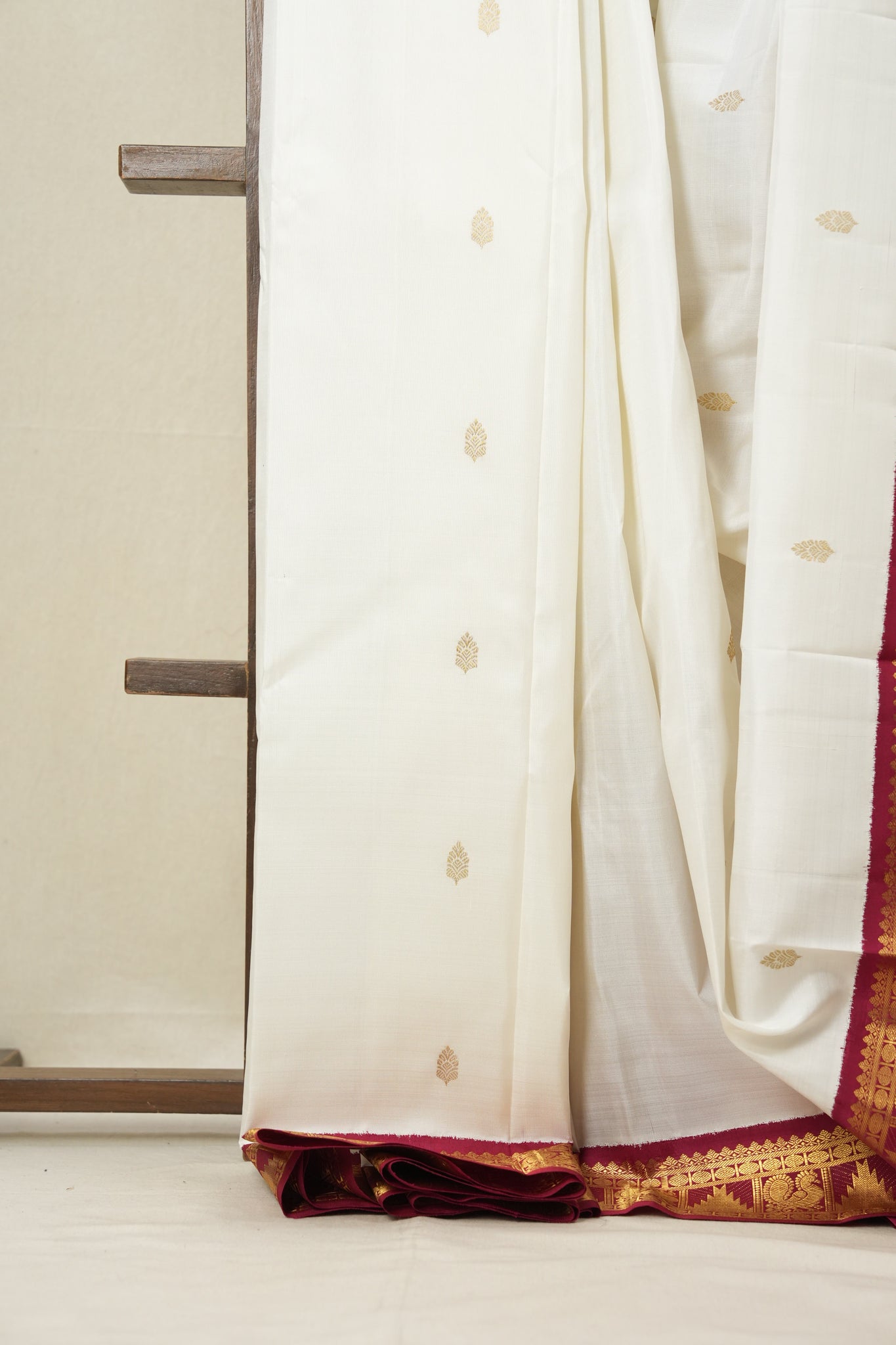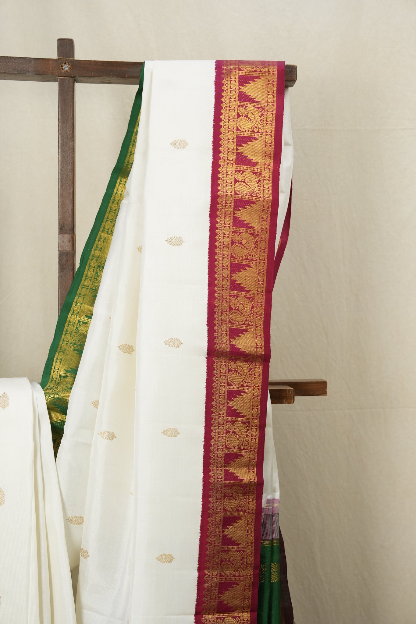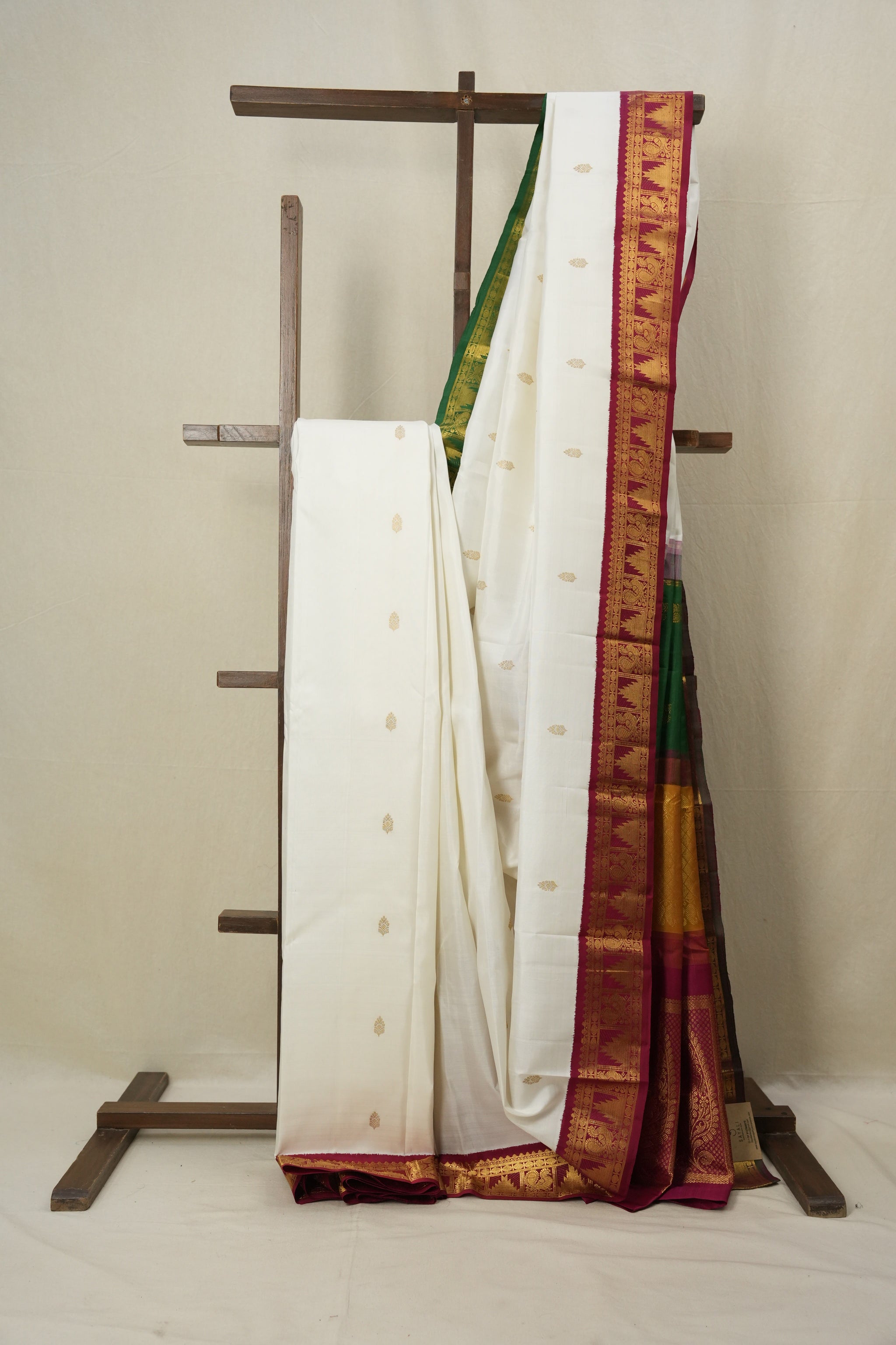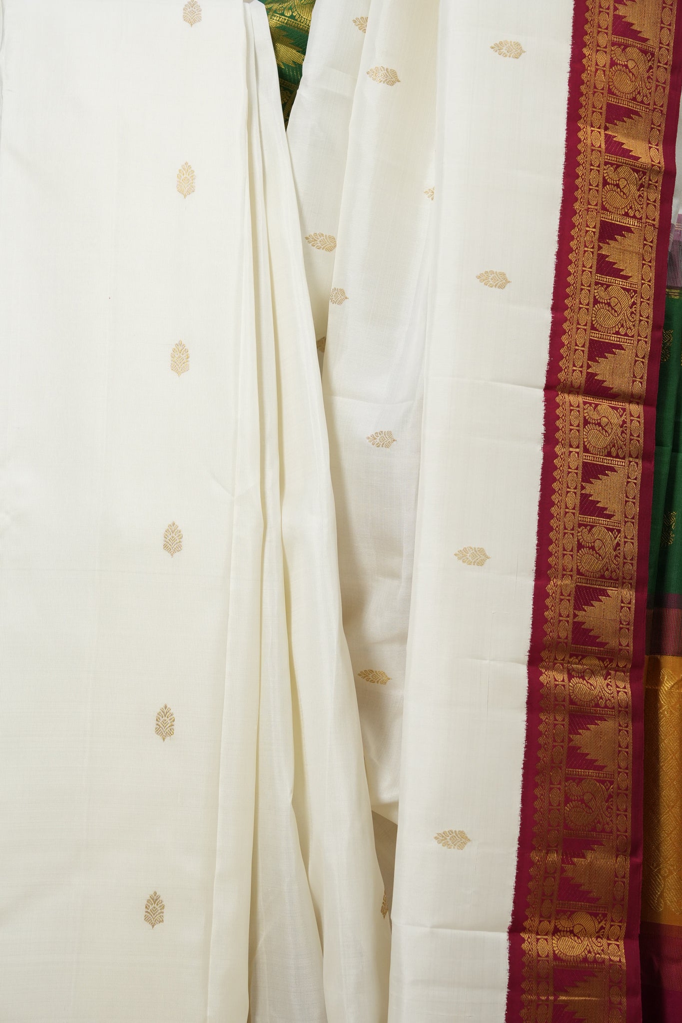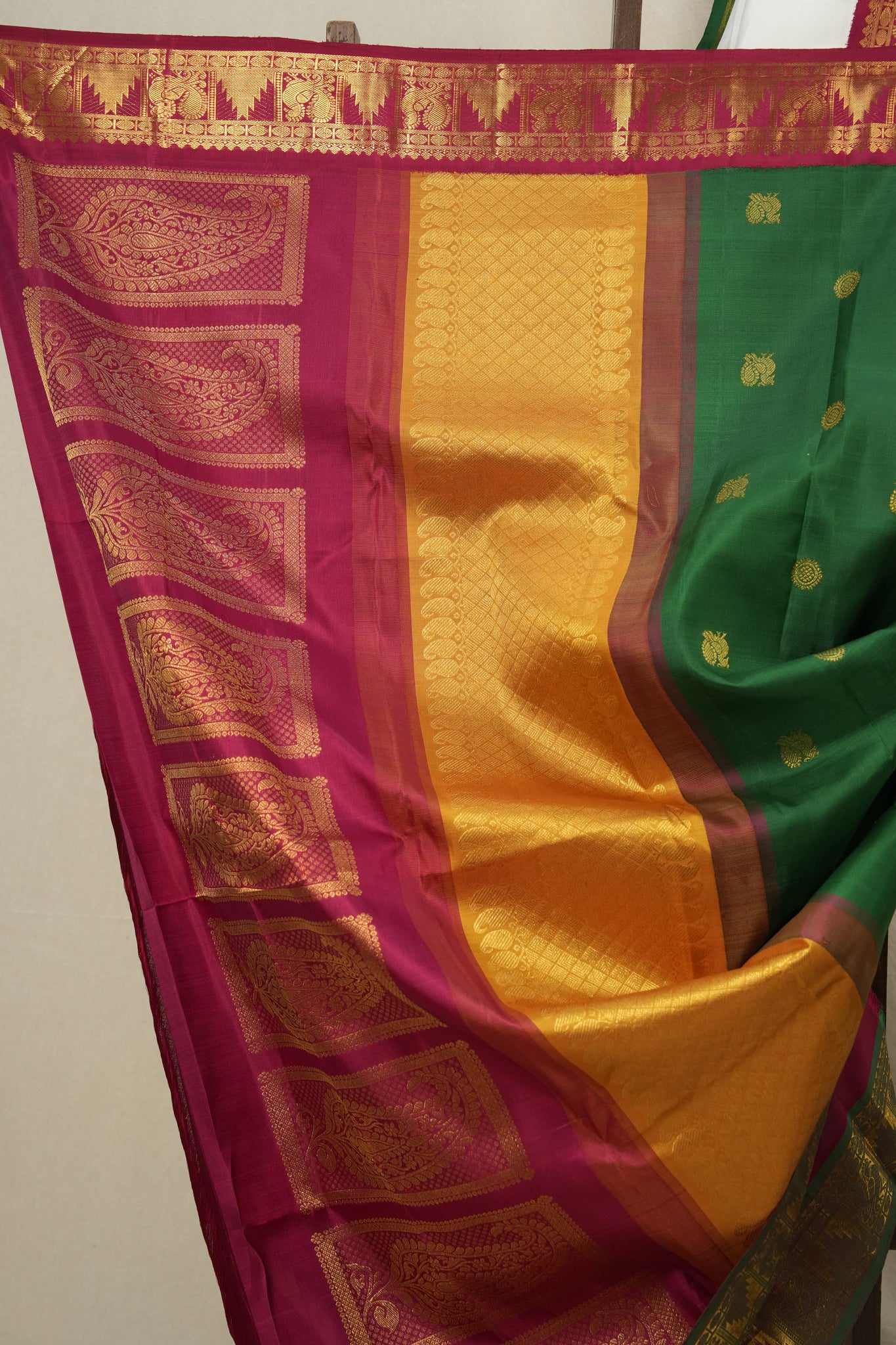 Work - The Kanjivaram saree shown features small butti motif on to the body and is accentuated by a green and maroon colour border and multi colour rich pallu.