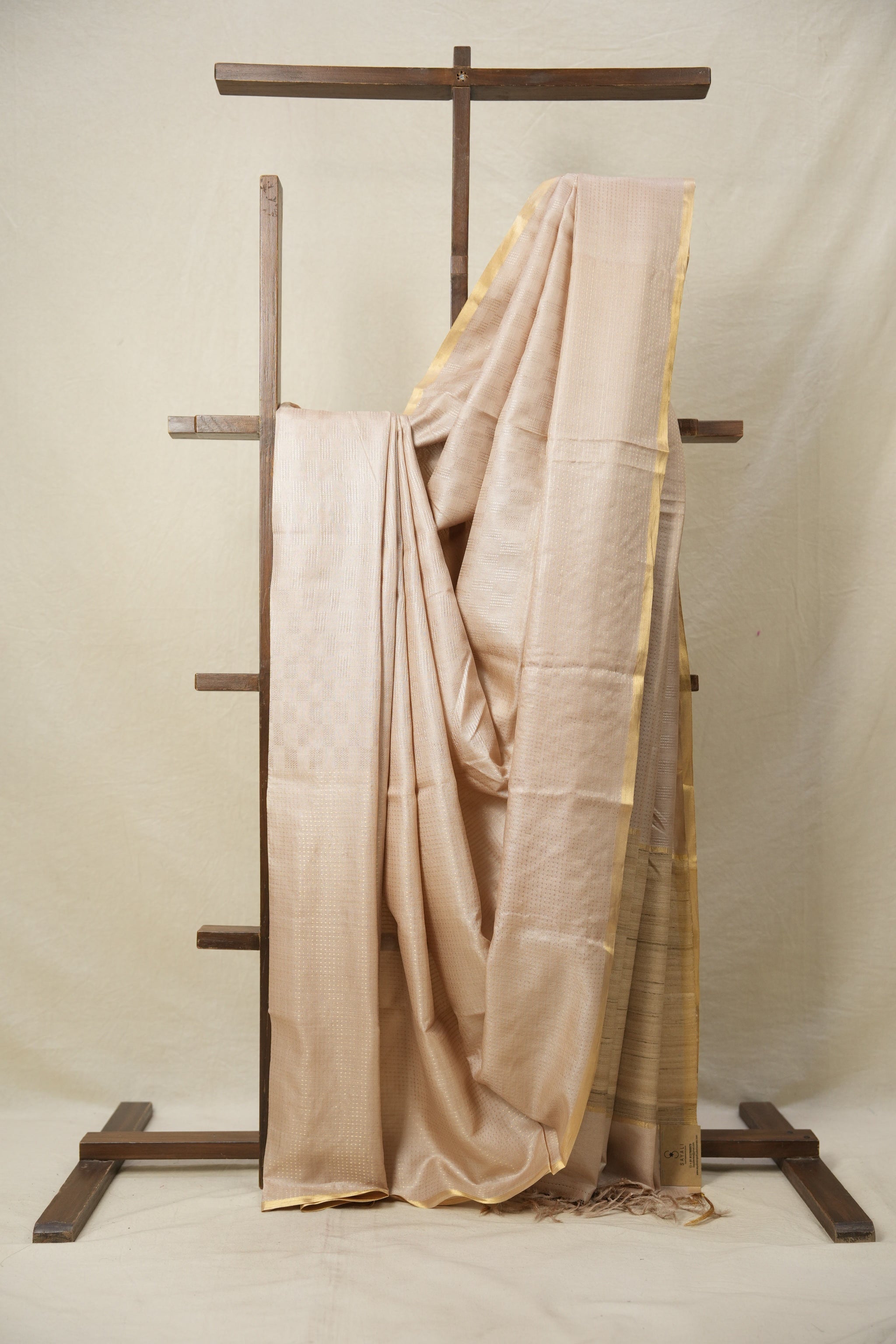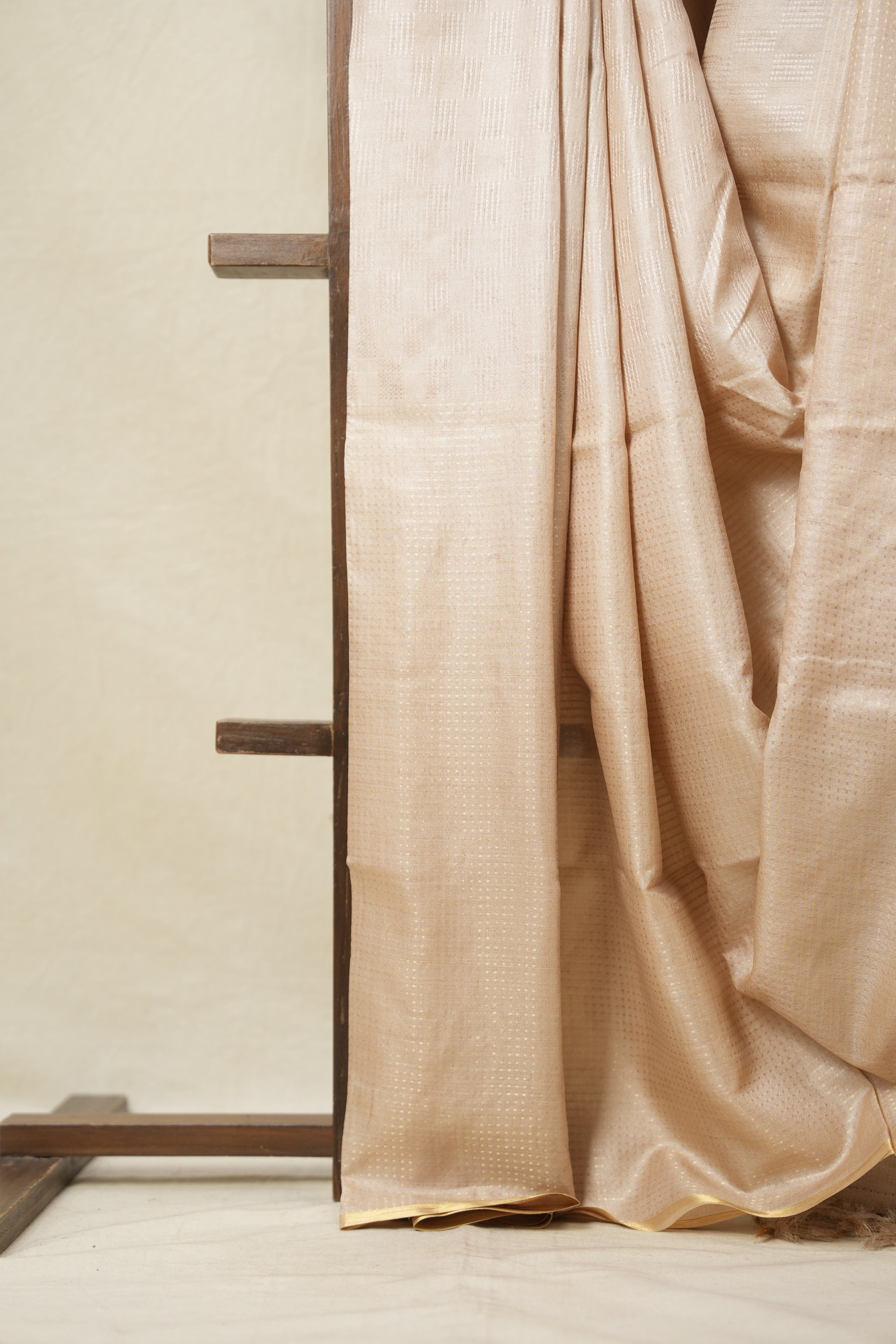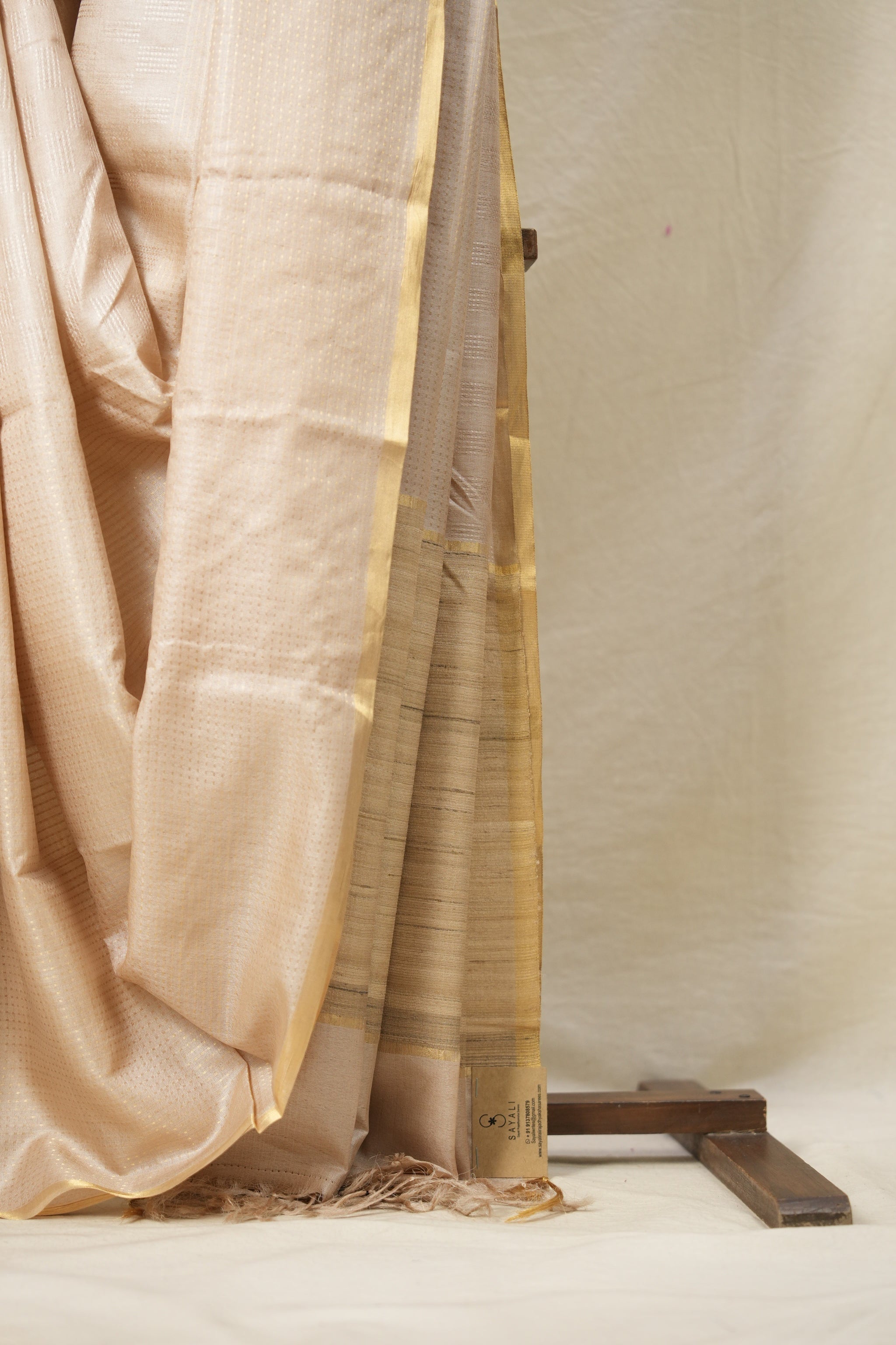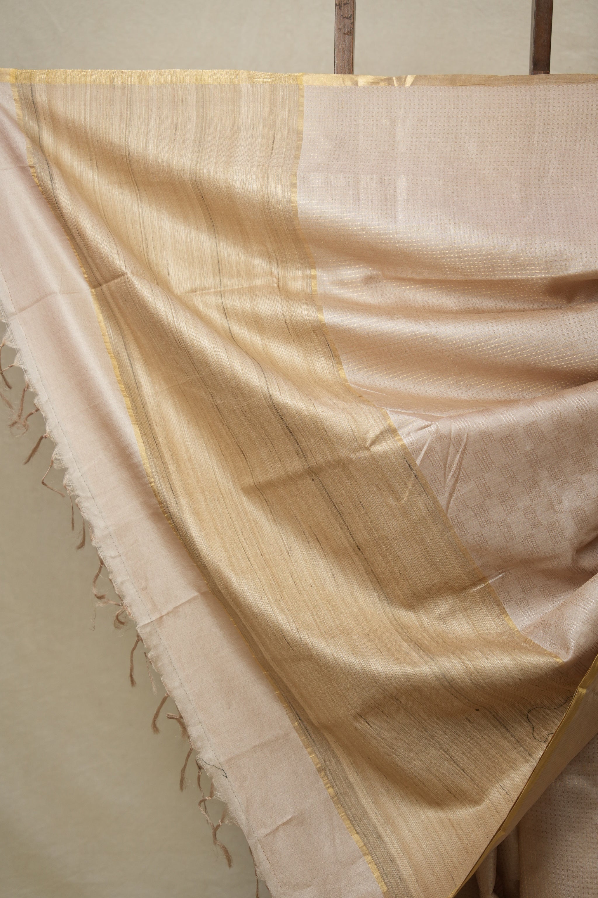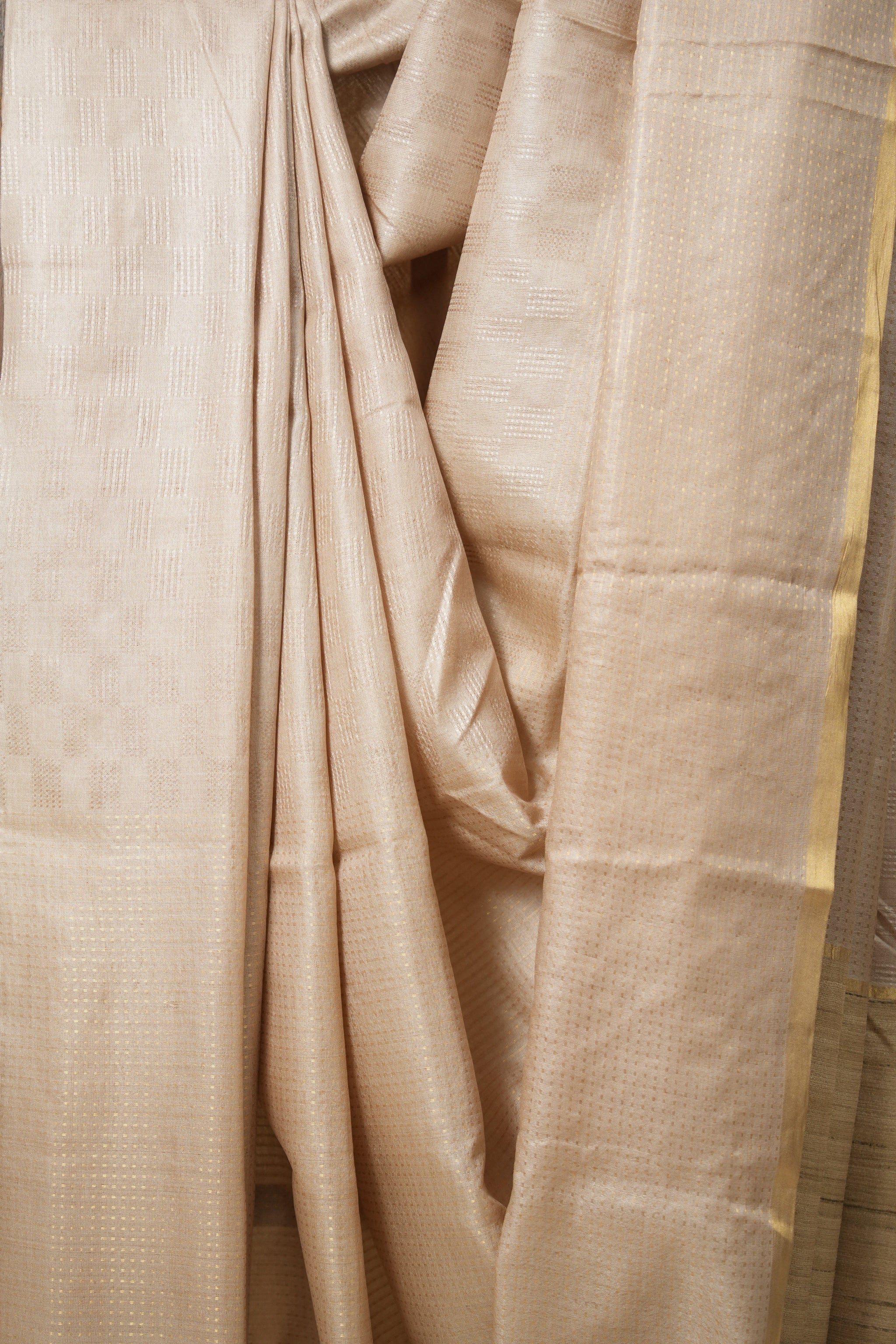 Work -  This is a beige tussar saree with a self-woven or striped pattern and a subtle, ornate border.