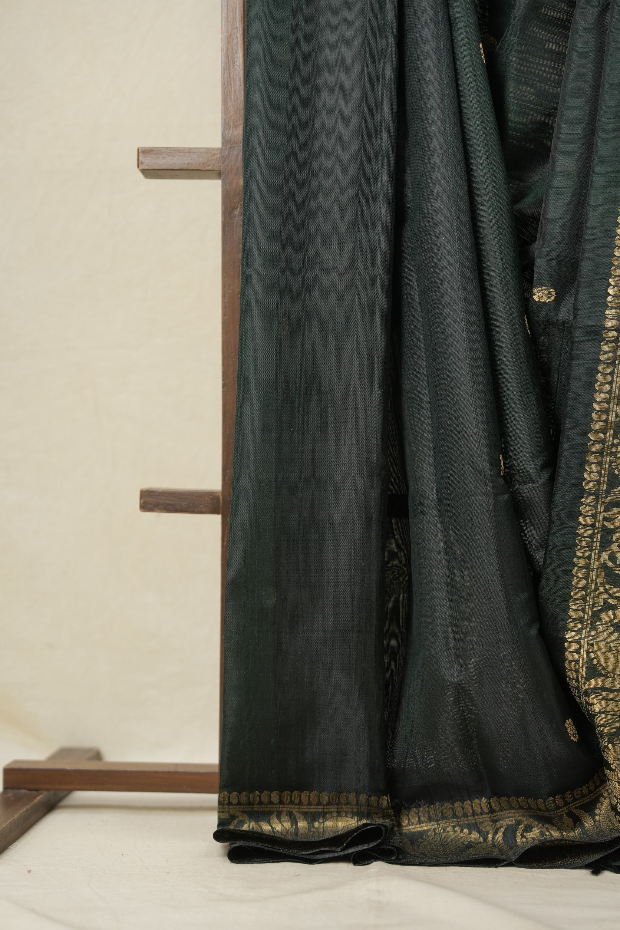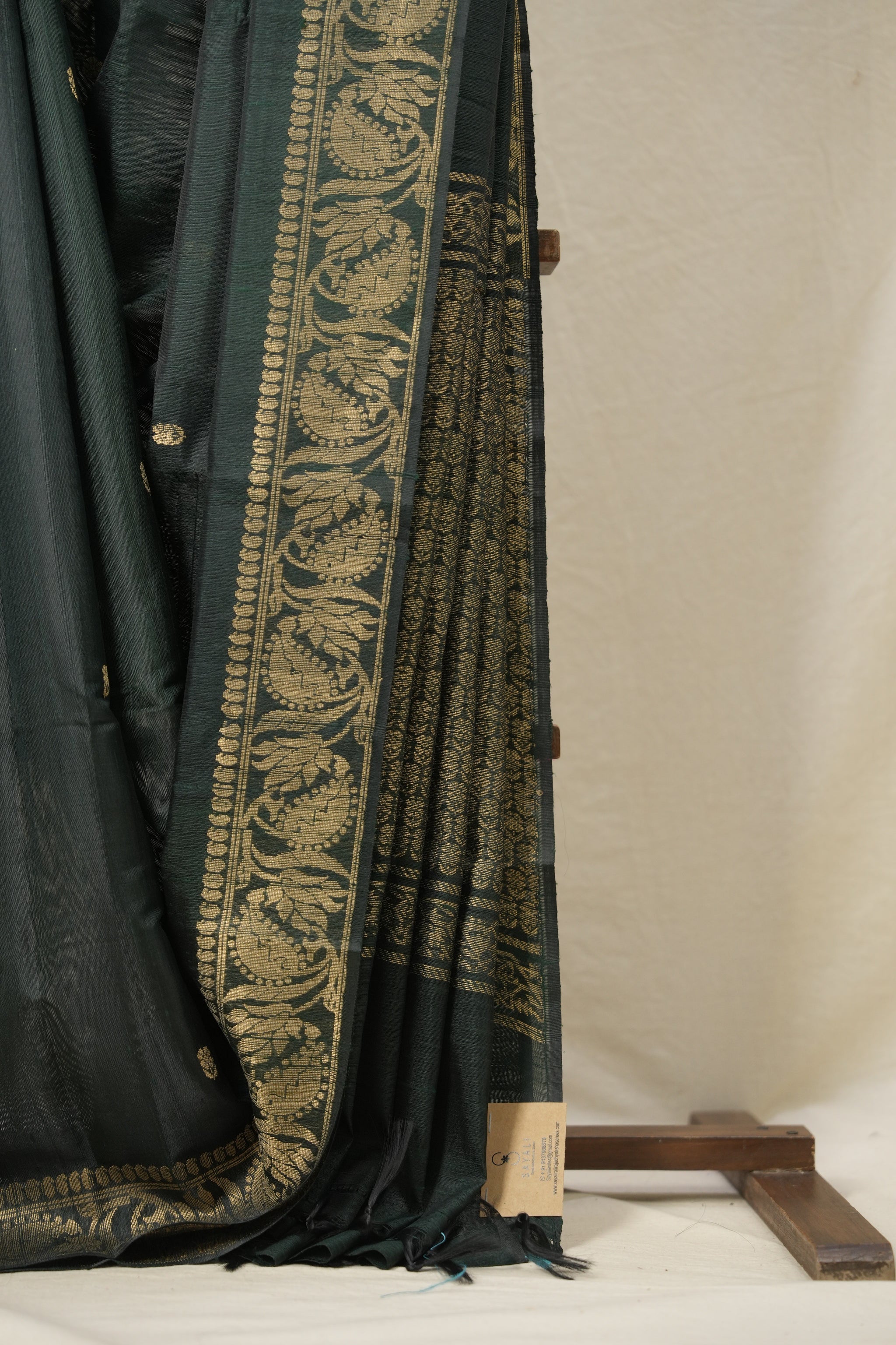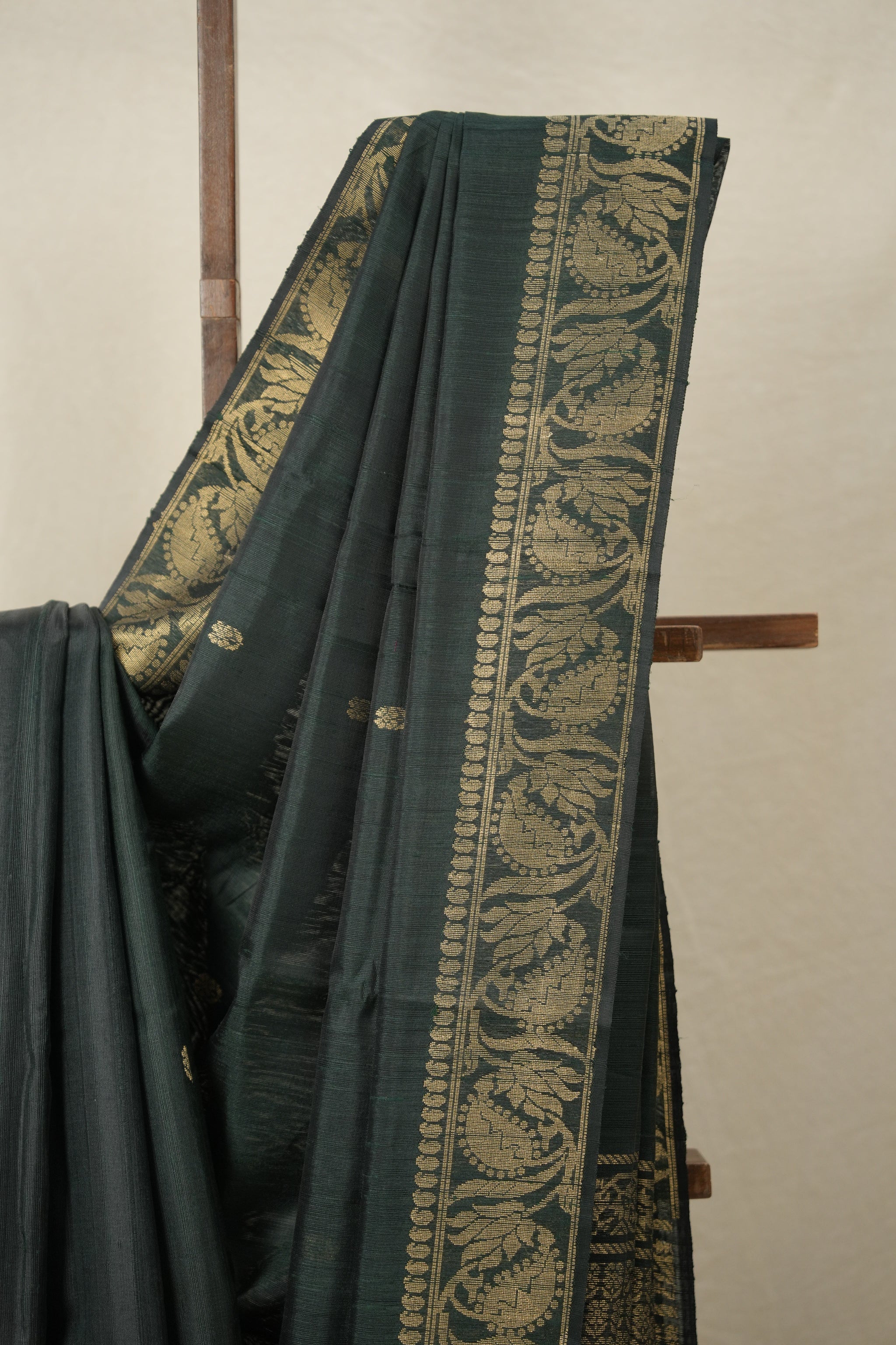 Work - This raw silk saree features a dark green base with gold buttas all over body and a solid border, showcasing a rich and elegant look.