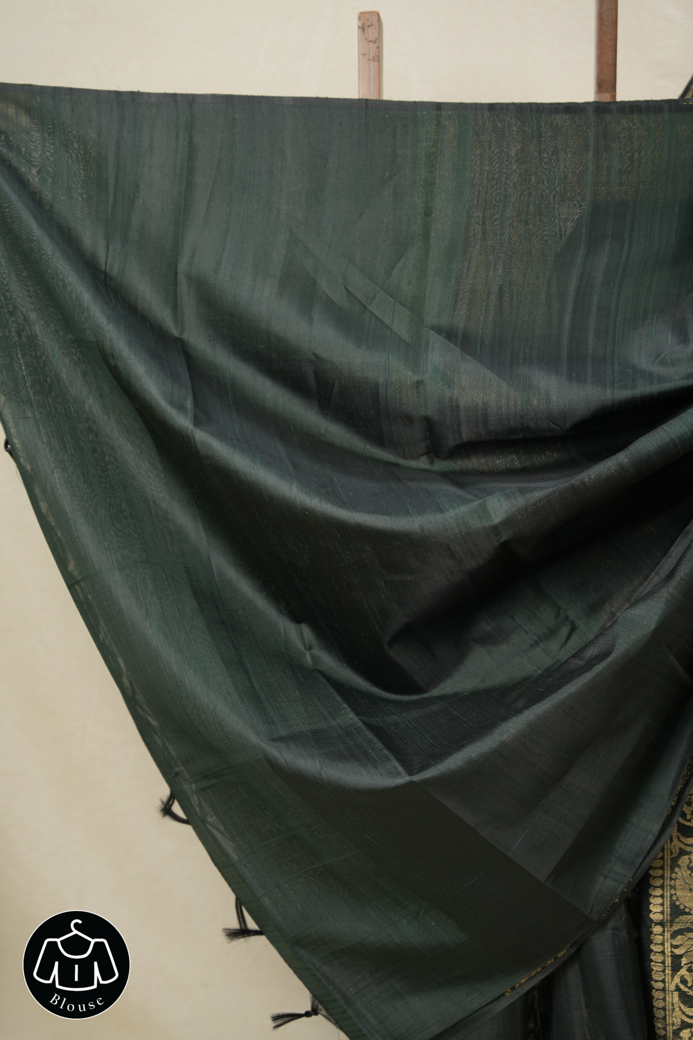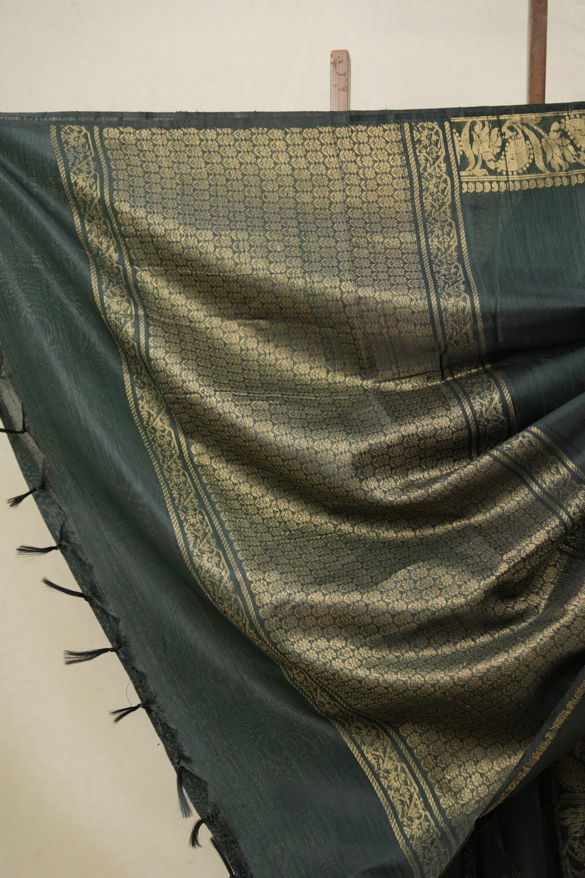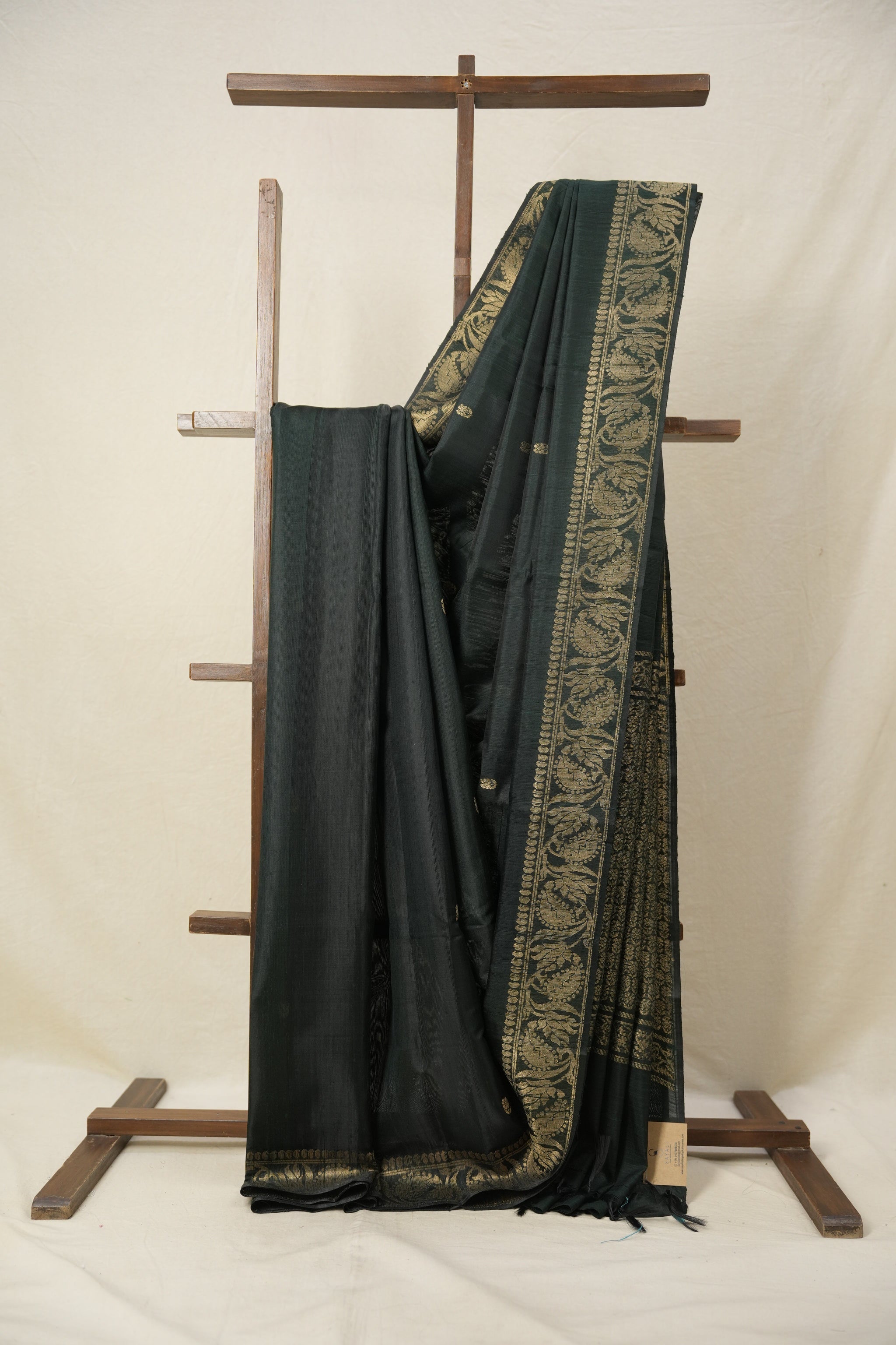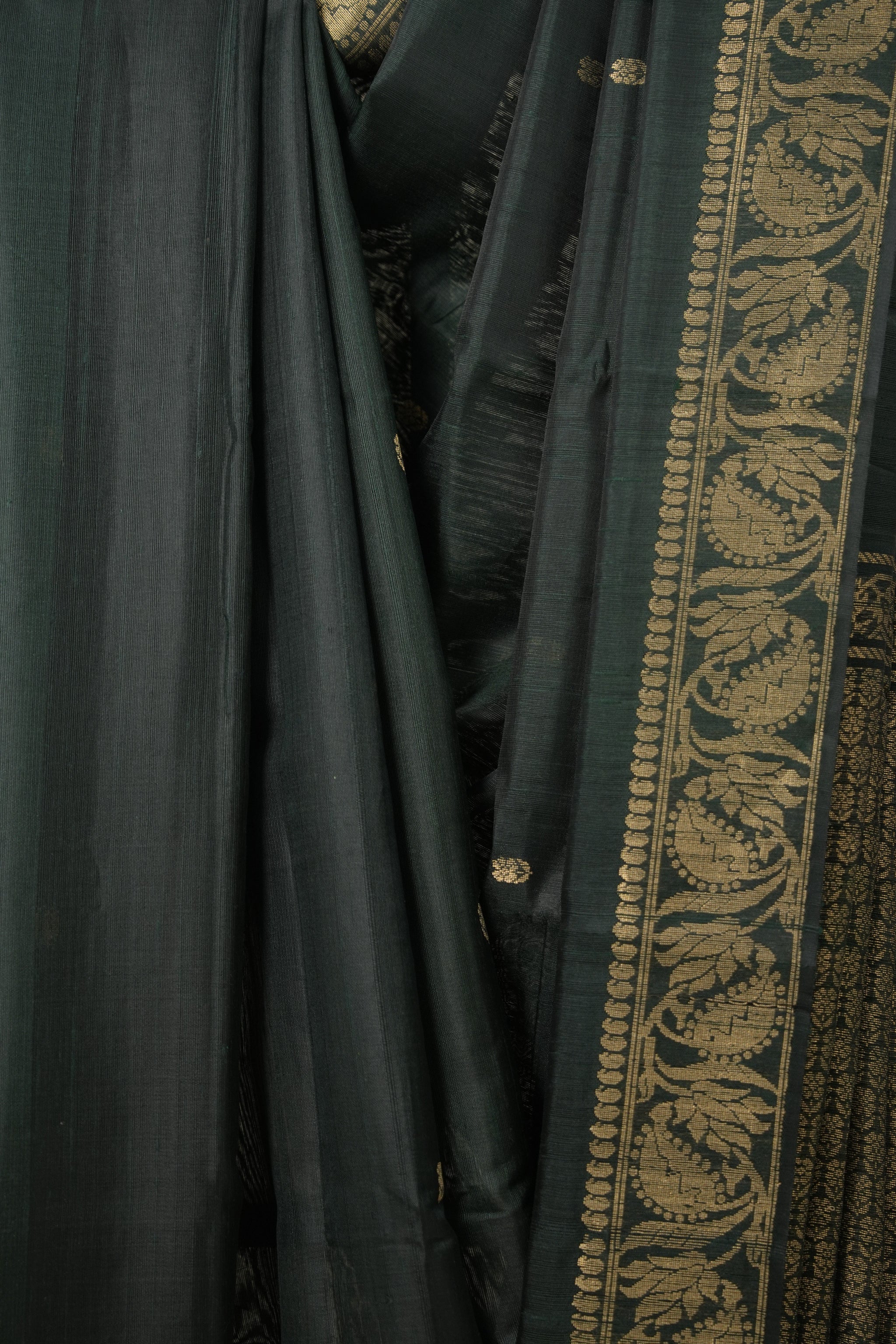 Work - This raw silk saree features a dark green base with gold buttas all over body and a solid border, showcasing a rich and elegant look.