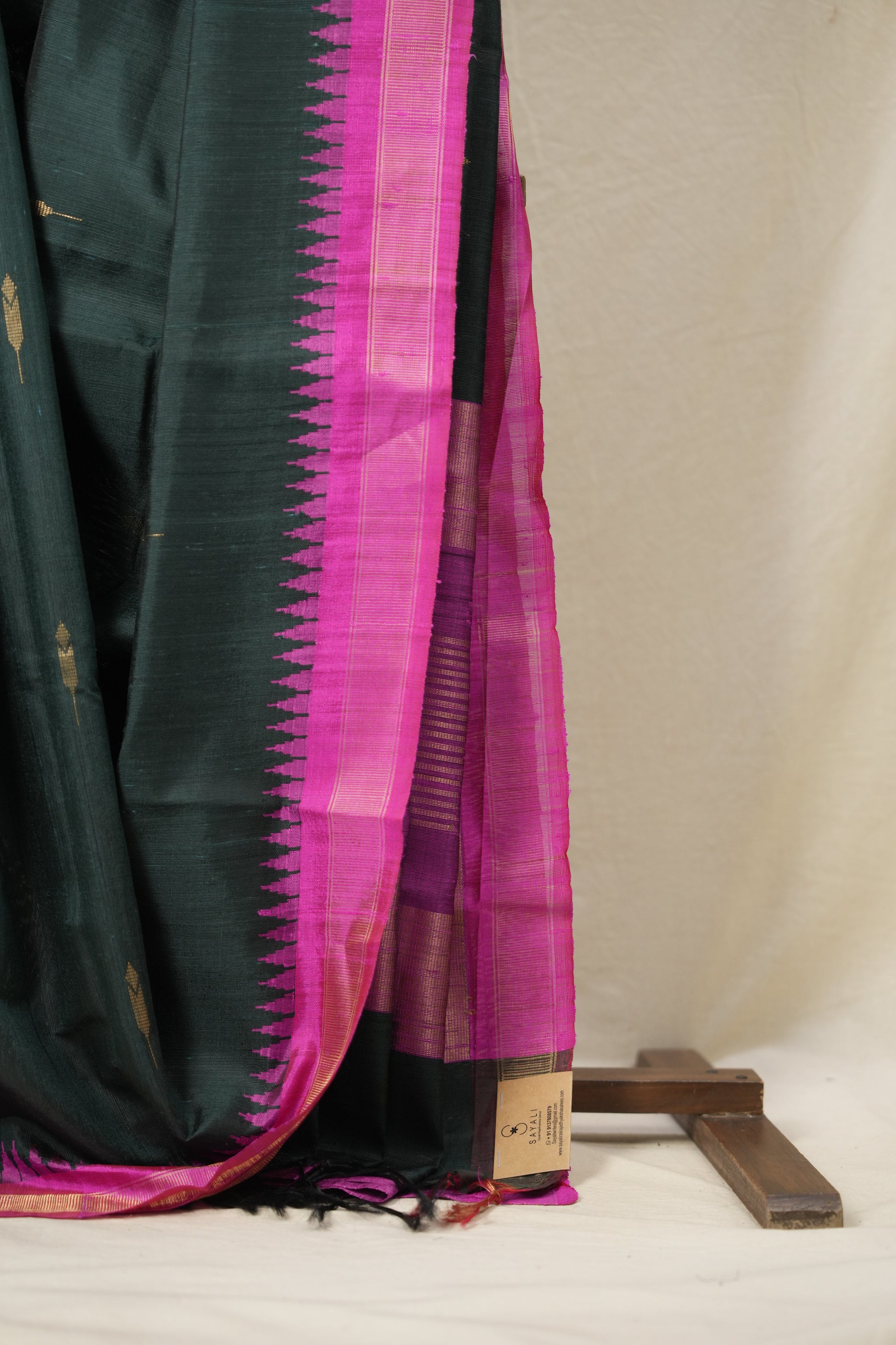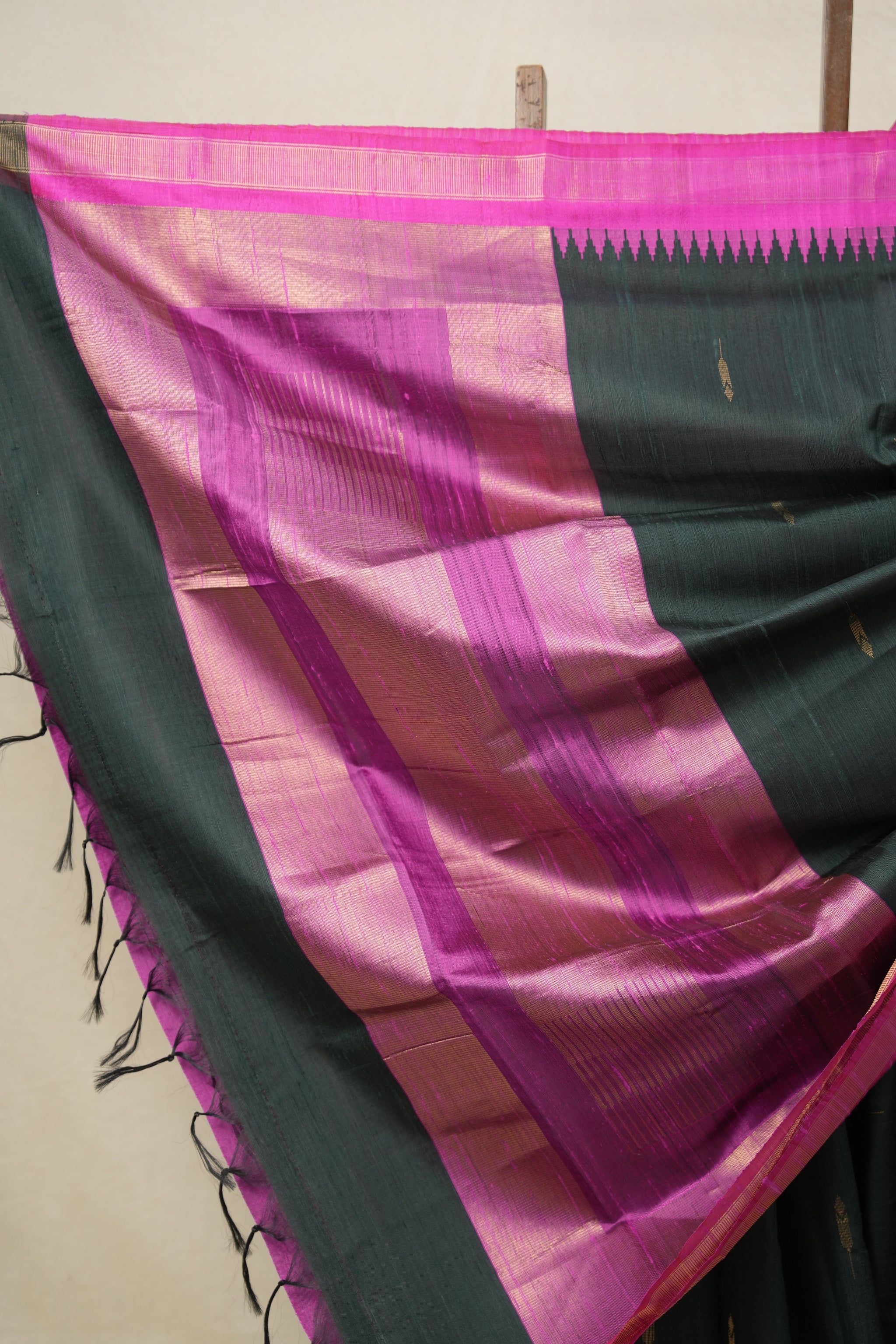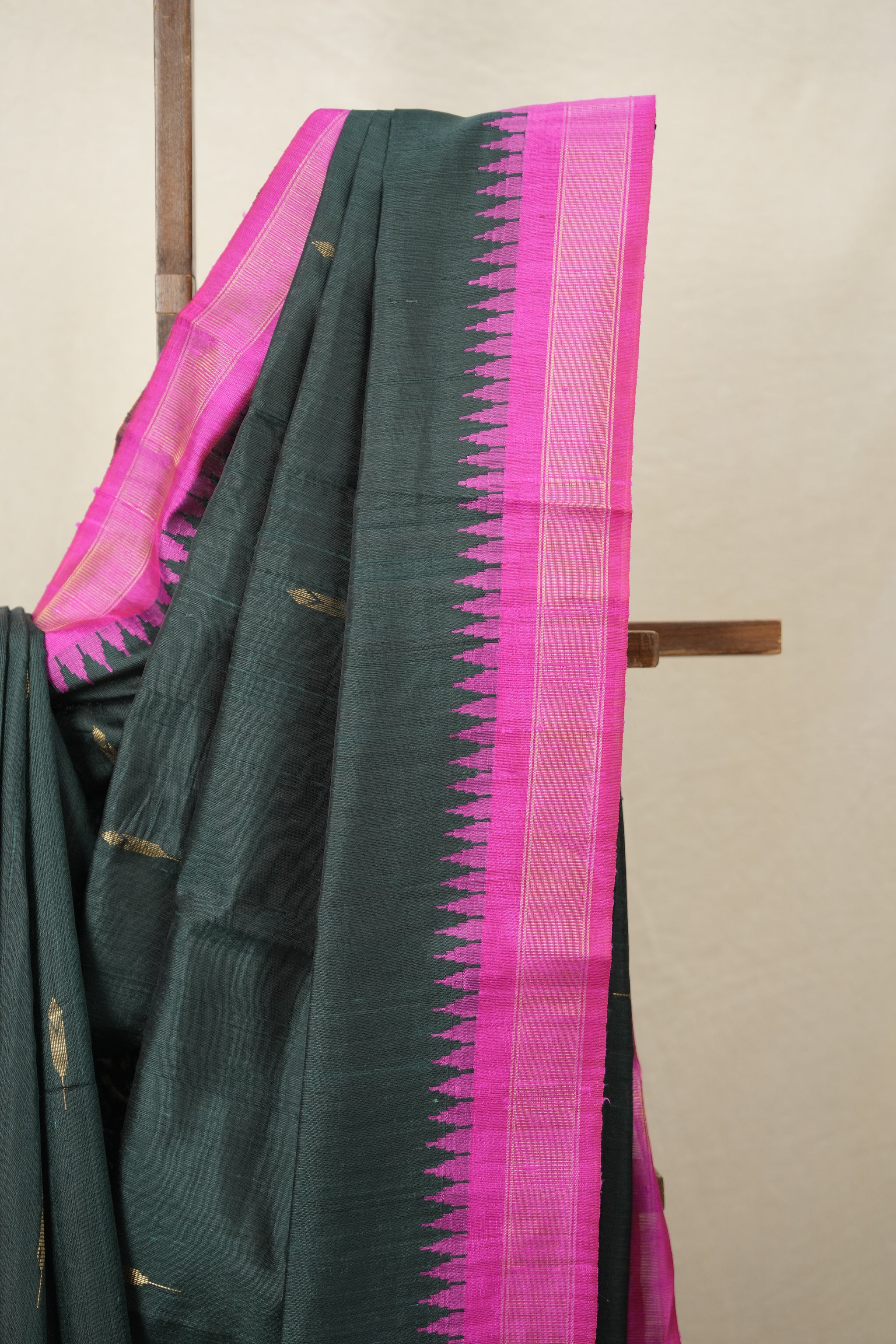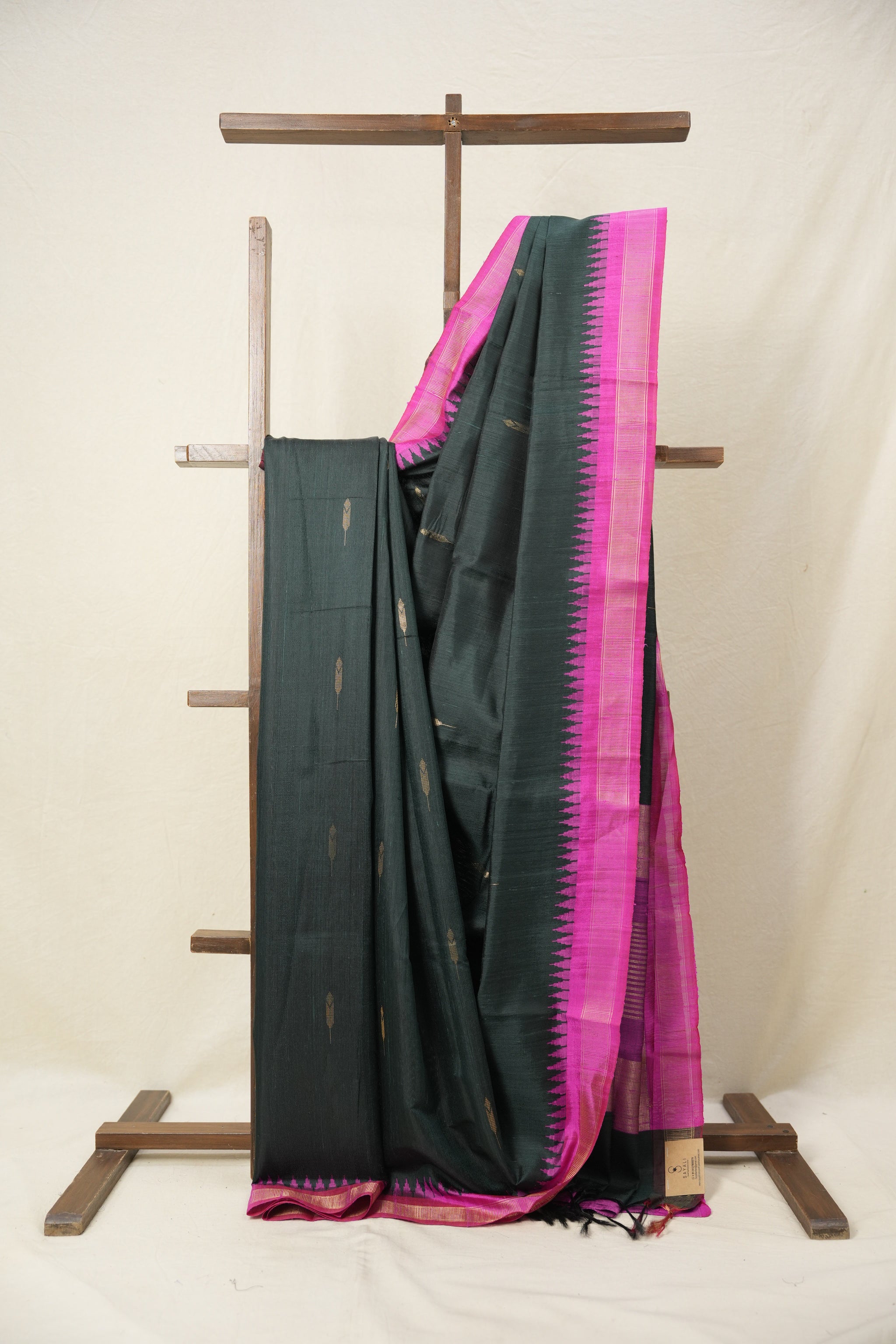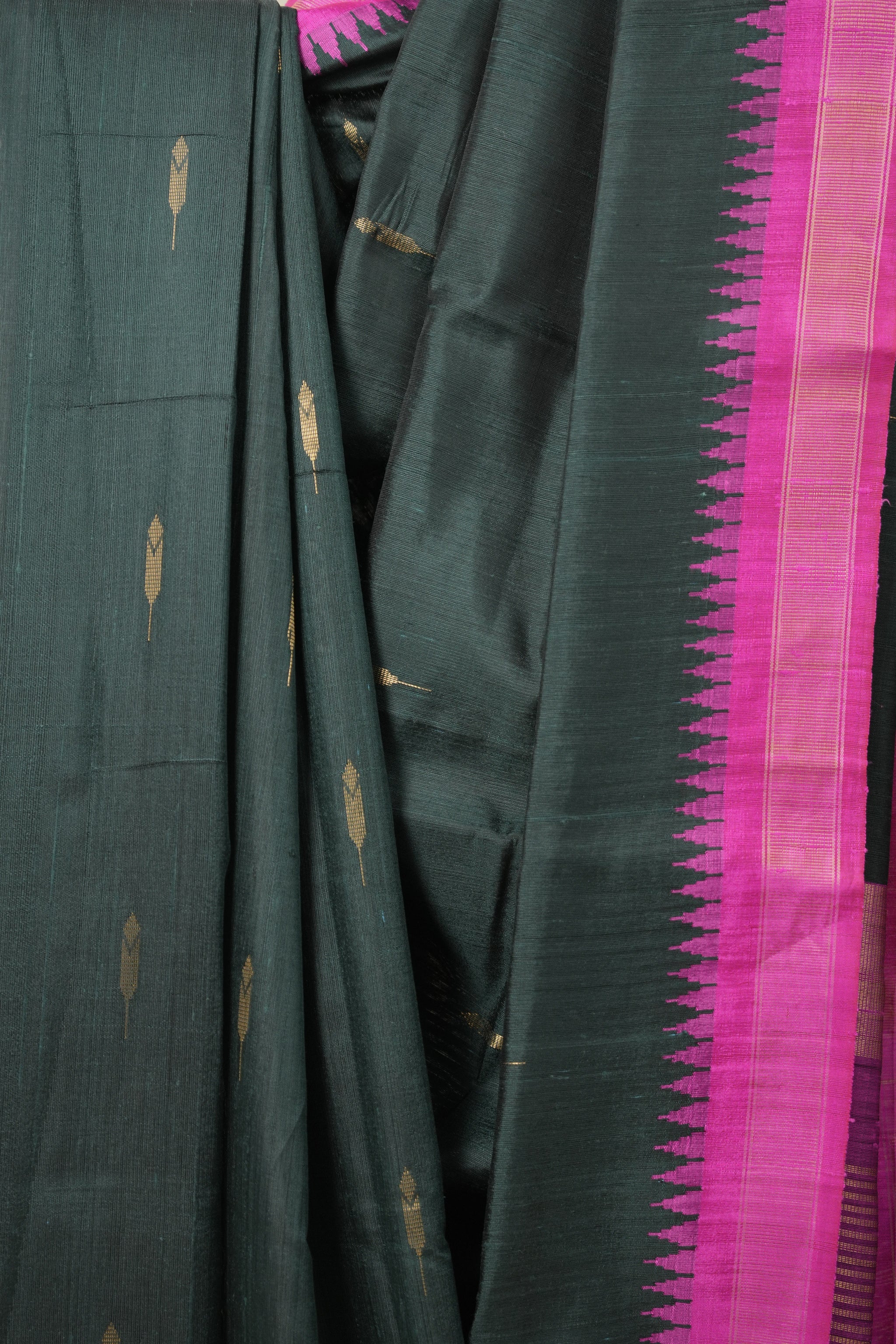 Work - This raw silk saree features a dark green with butti all over body and a solid border, showcasing a rich and elegant look.