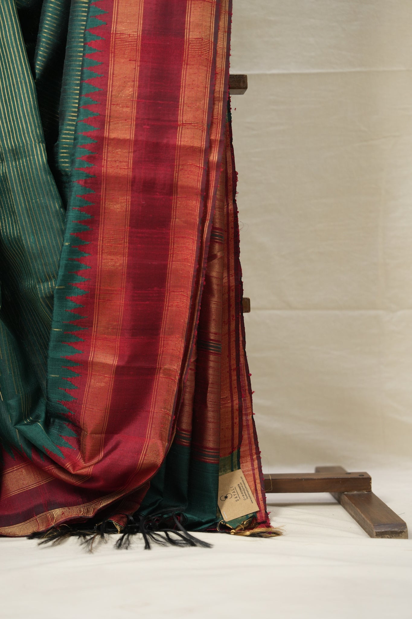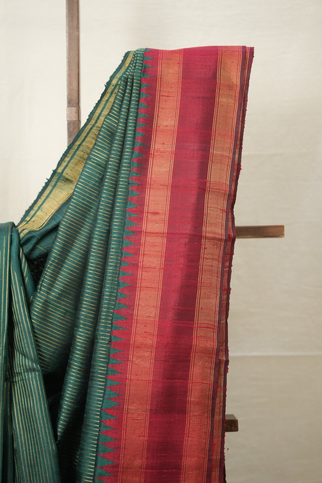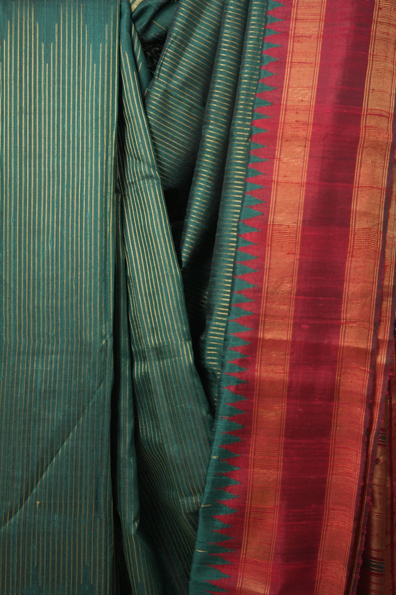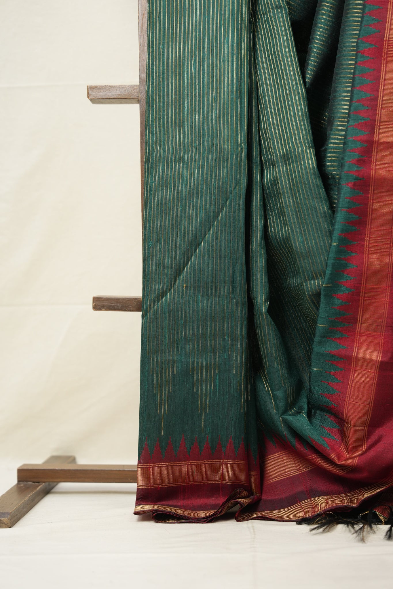 Work - This raw silk saree features a green color with gold stripes design all over body and a zari temple border, showcasing a rich and elegant look.