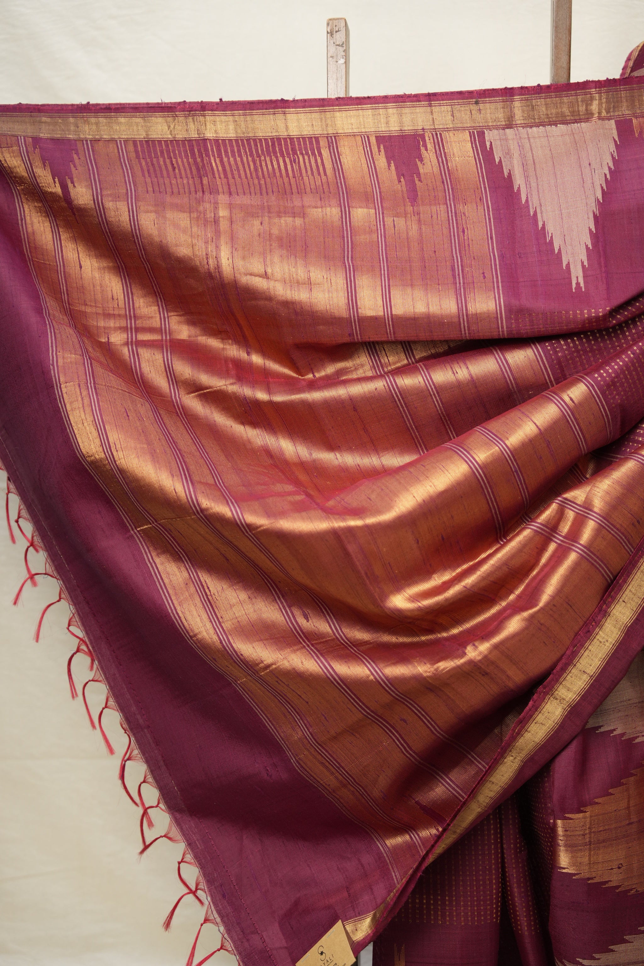 Work - This raw silk saree features a maroon base with stripes and a solid gold border, showcasing a rich and elegant look.