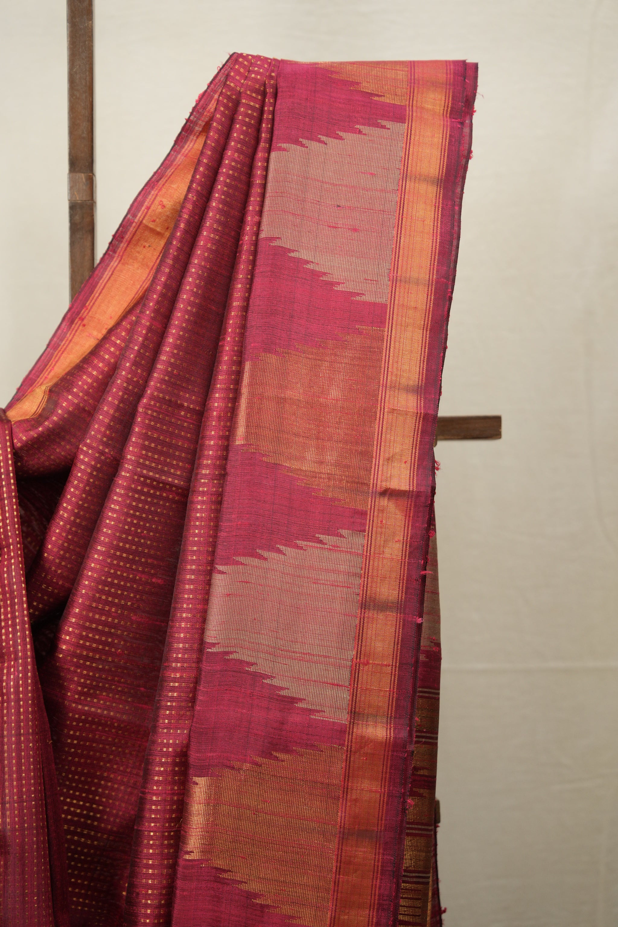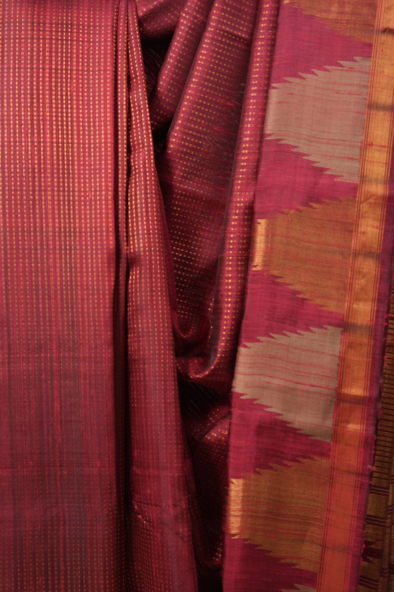 Work - This raw silk saree features a maroon color with stripes design all over body and a zari border, showcasing a rich and elegant look.