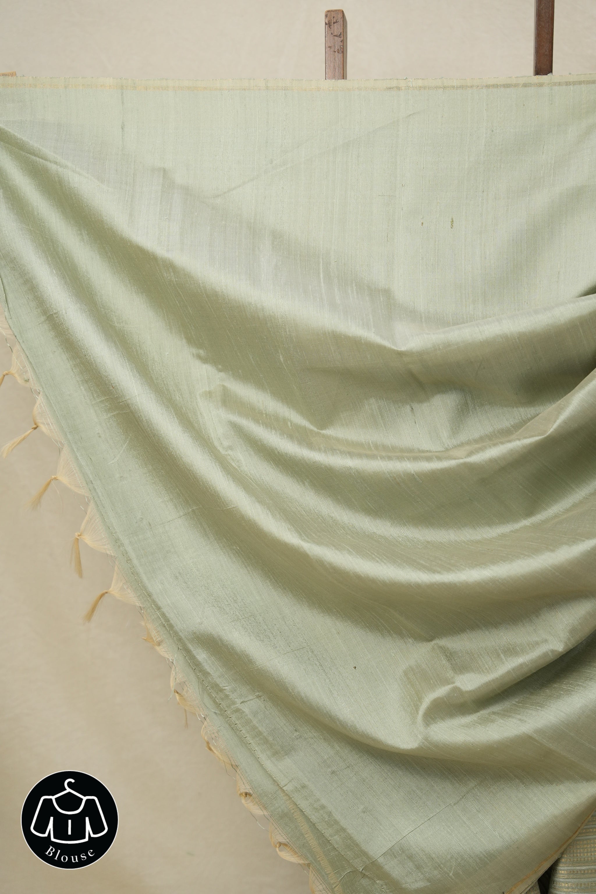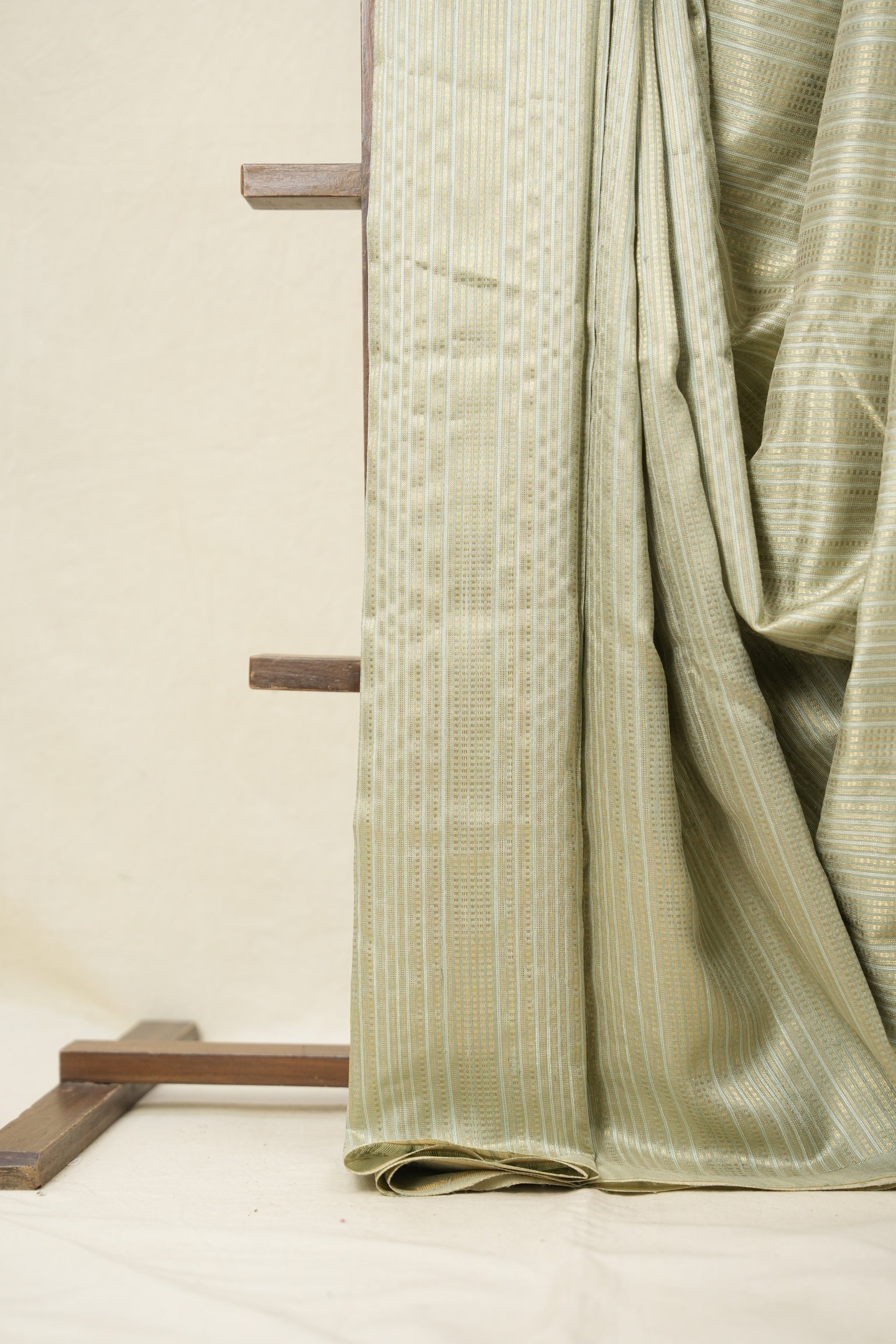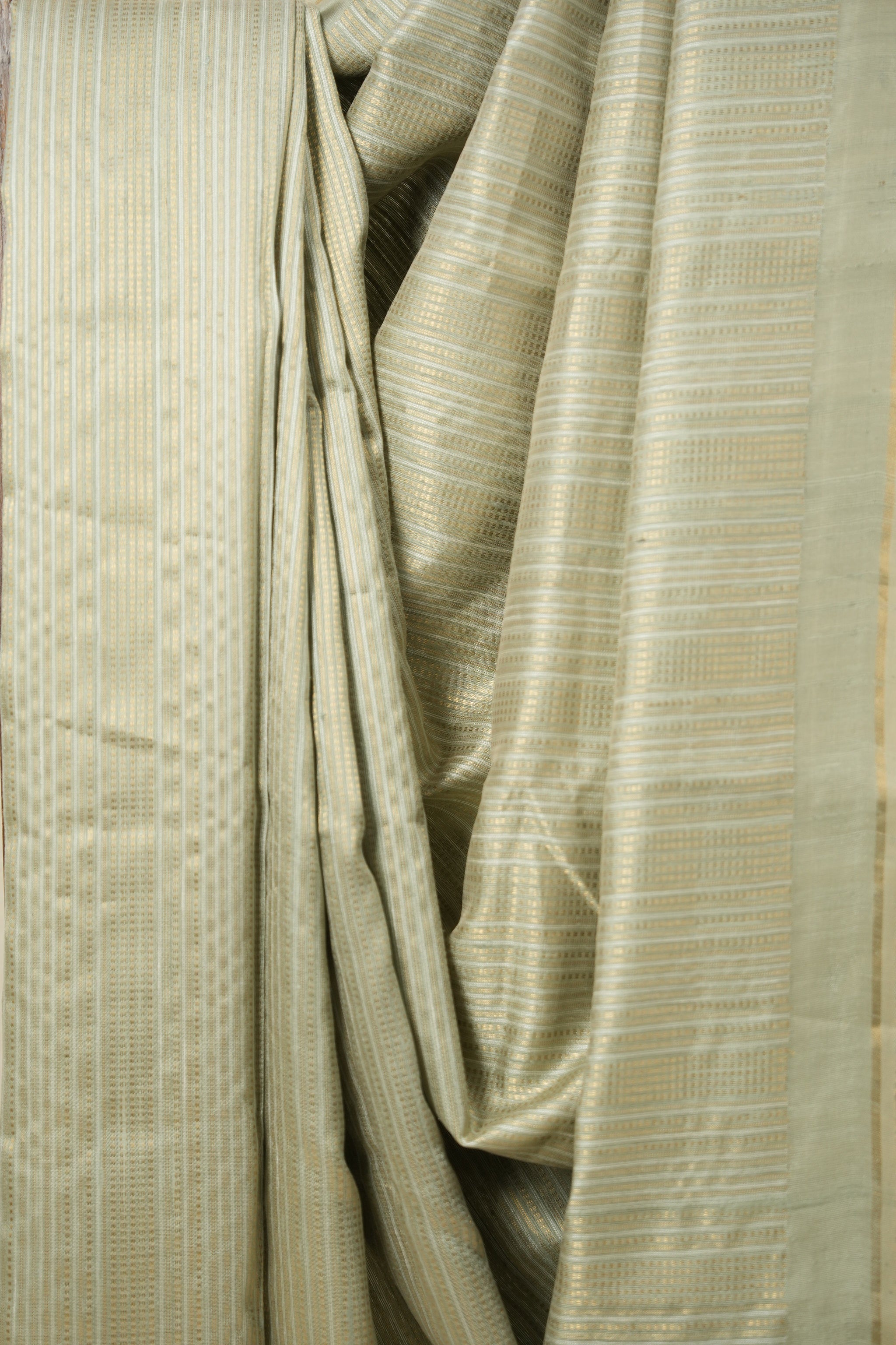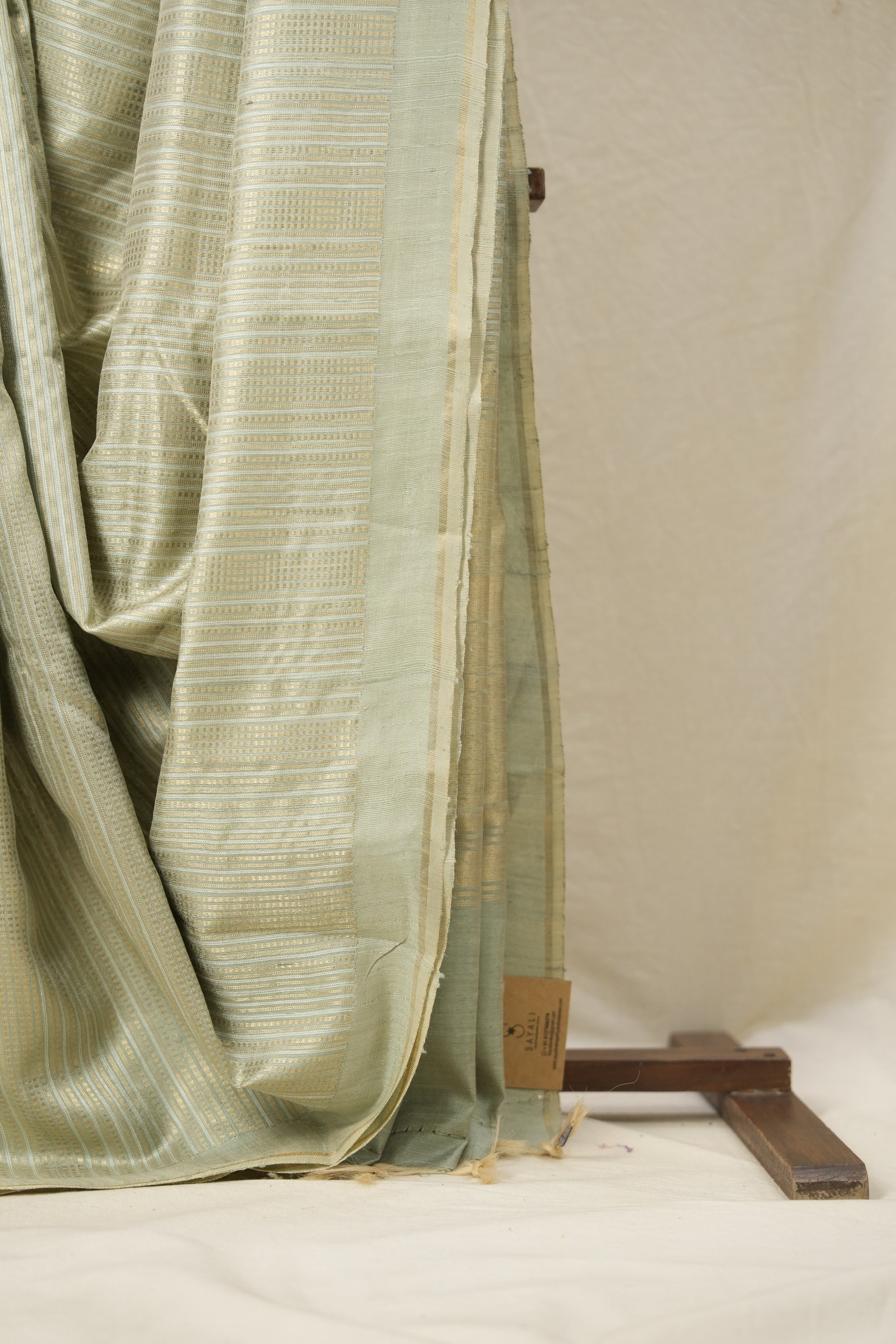 Work - This raw silk saree features a mint green base with stripes design all over body and a solid border, showcasing a rich and elegant look.