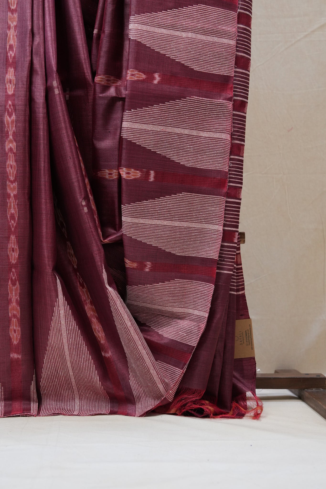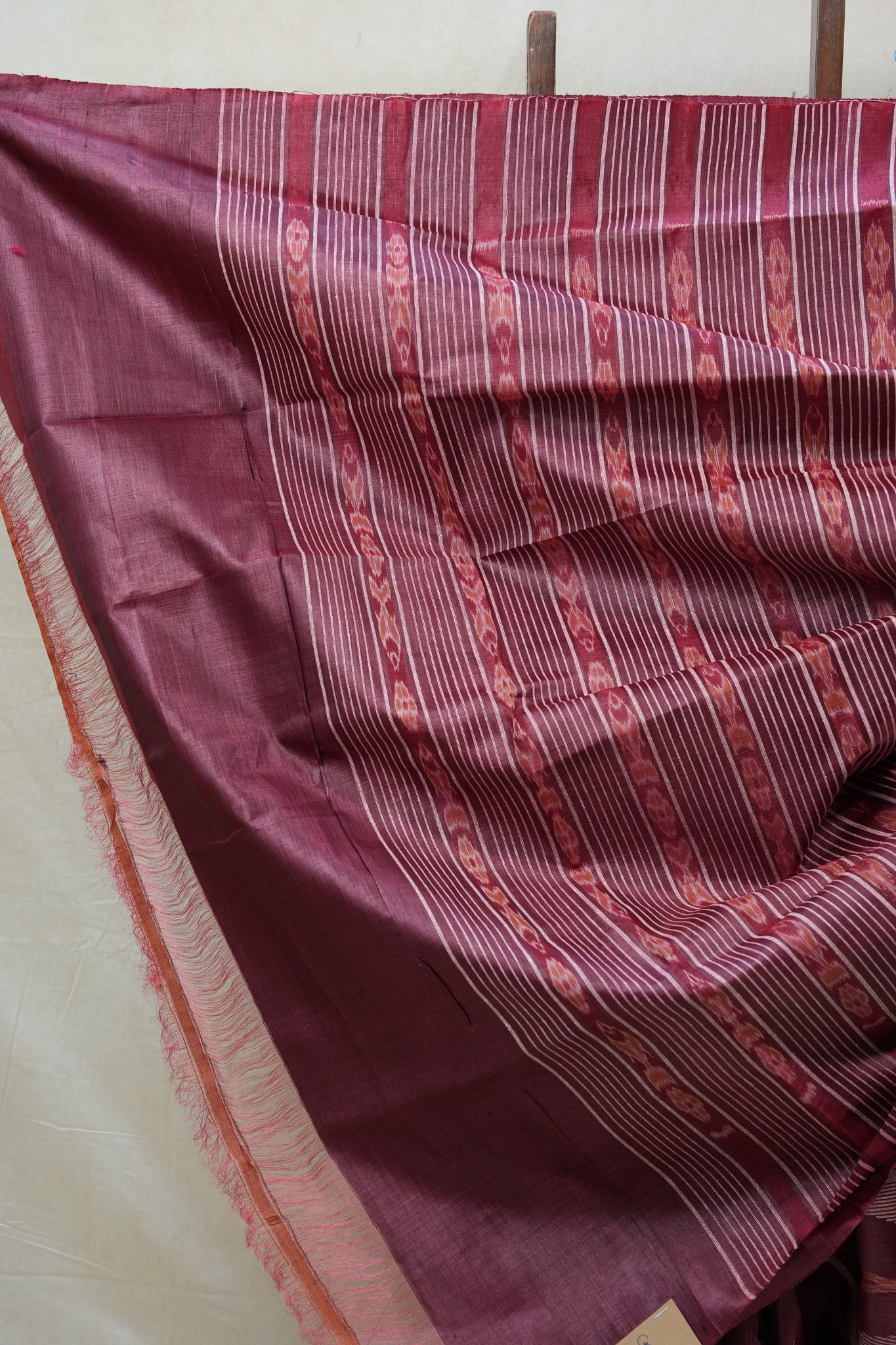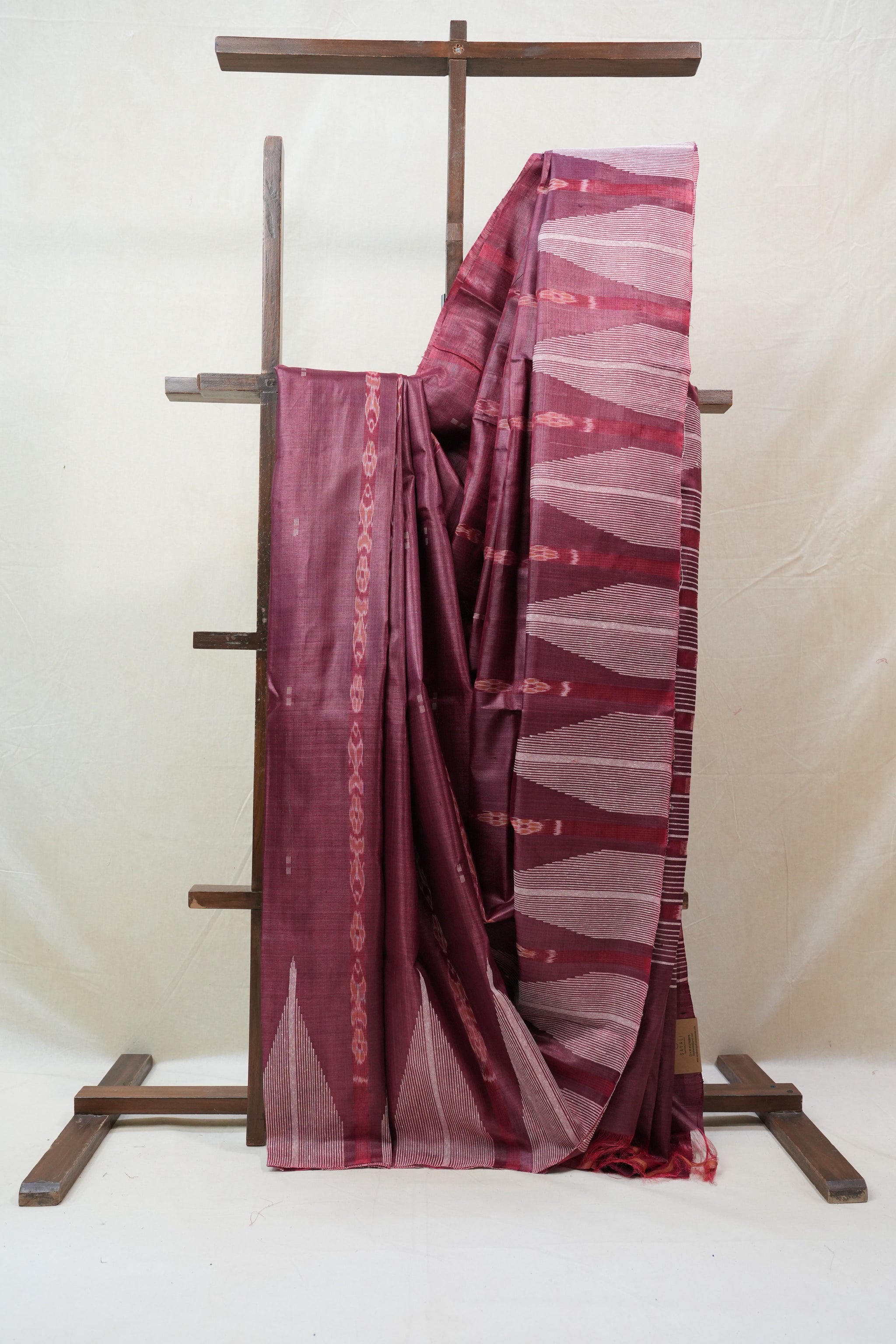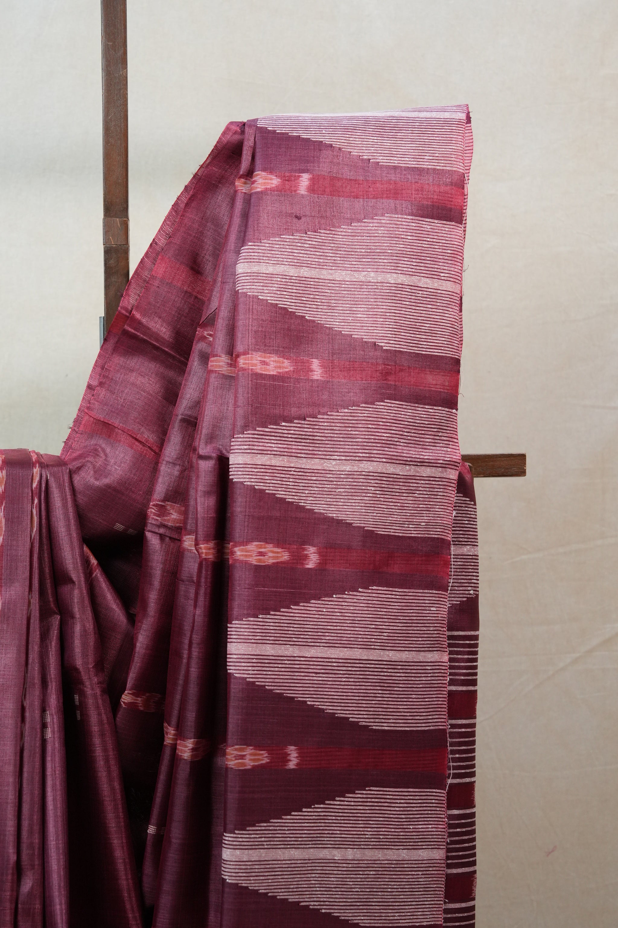 Work - Onion pink saree with geometric pallu patterns and vertical ikat motifs.