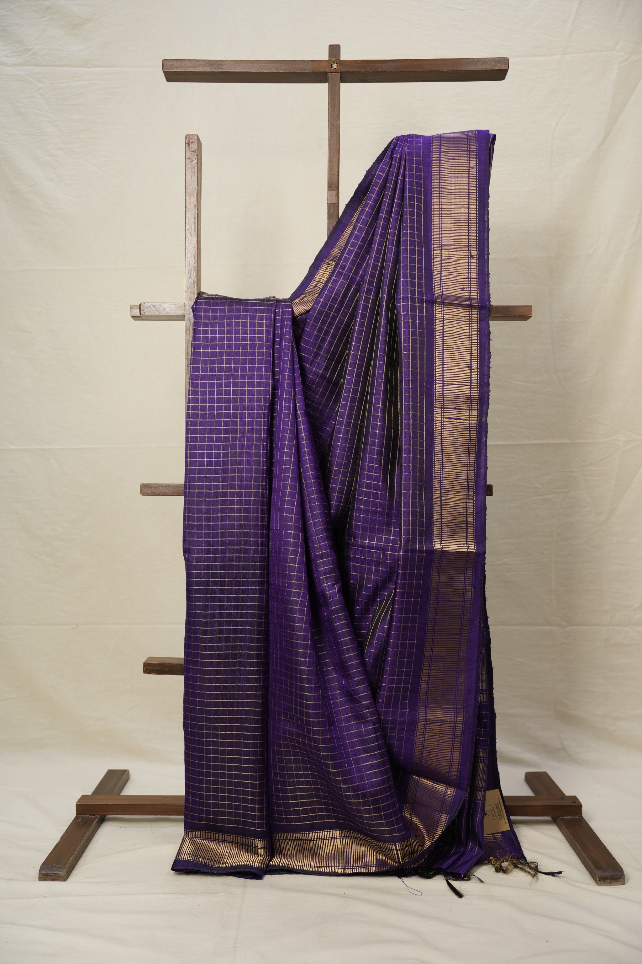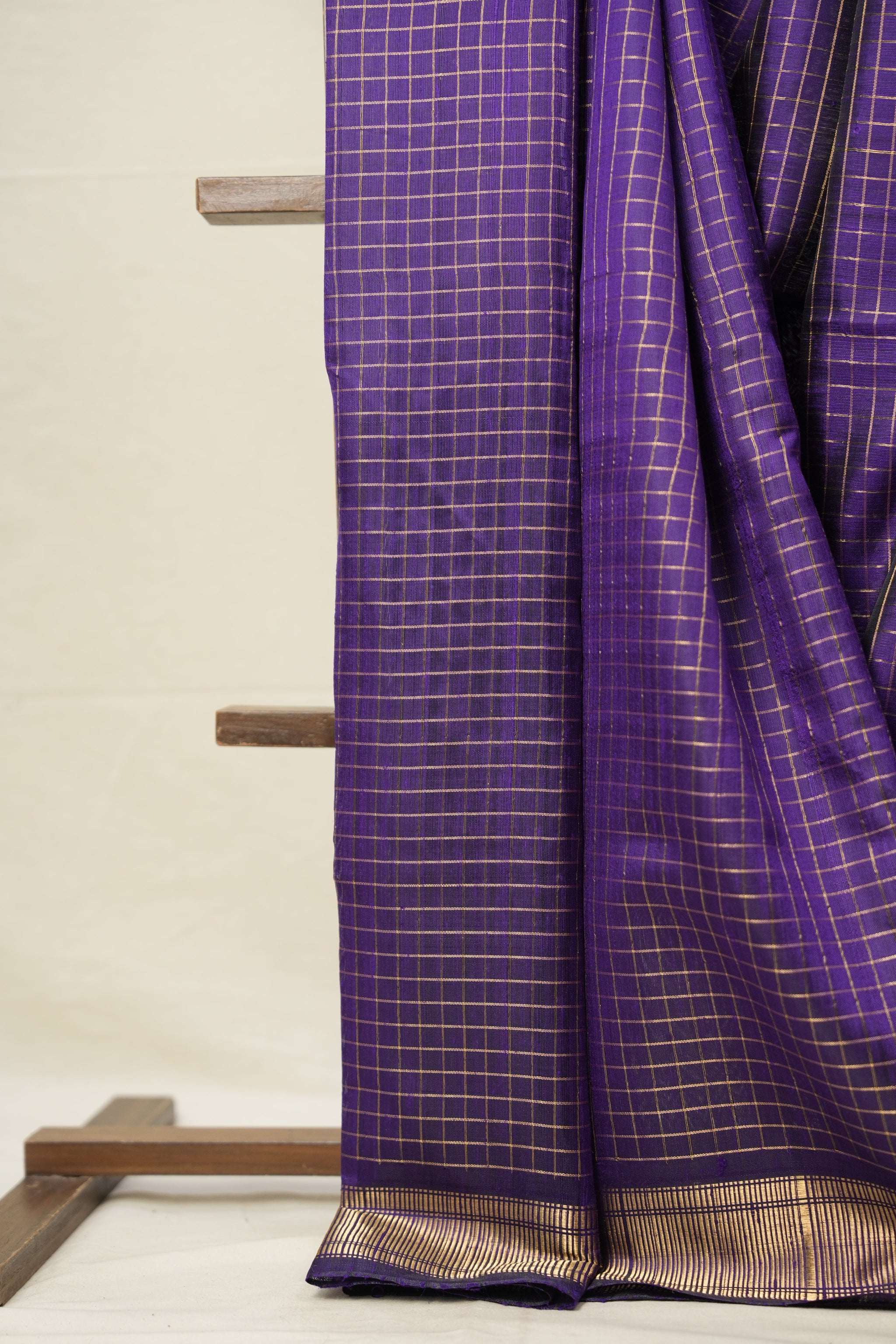 Work - This raw silk saree features a purple base with checks body and a solid gold border, showcasing a rich and elegant look.