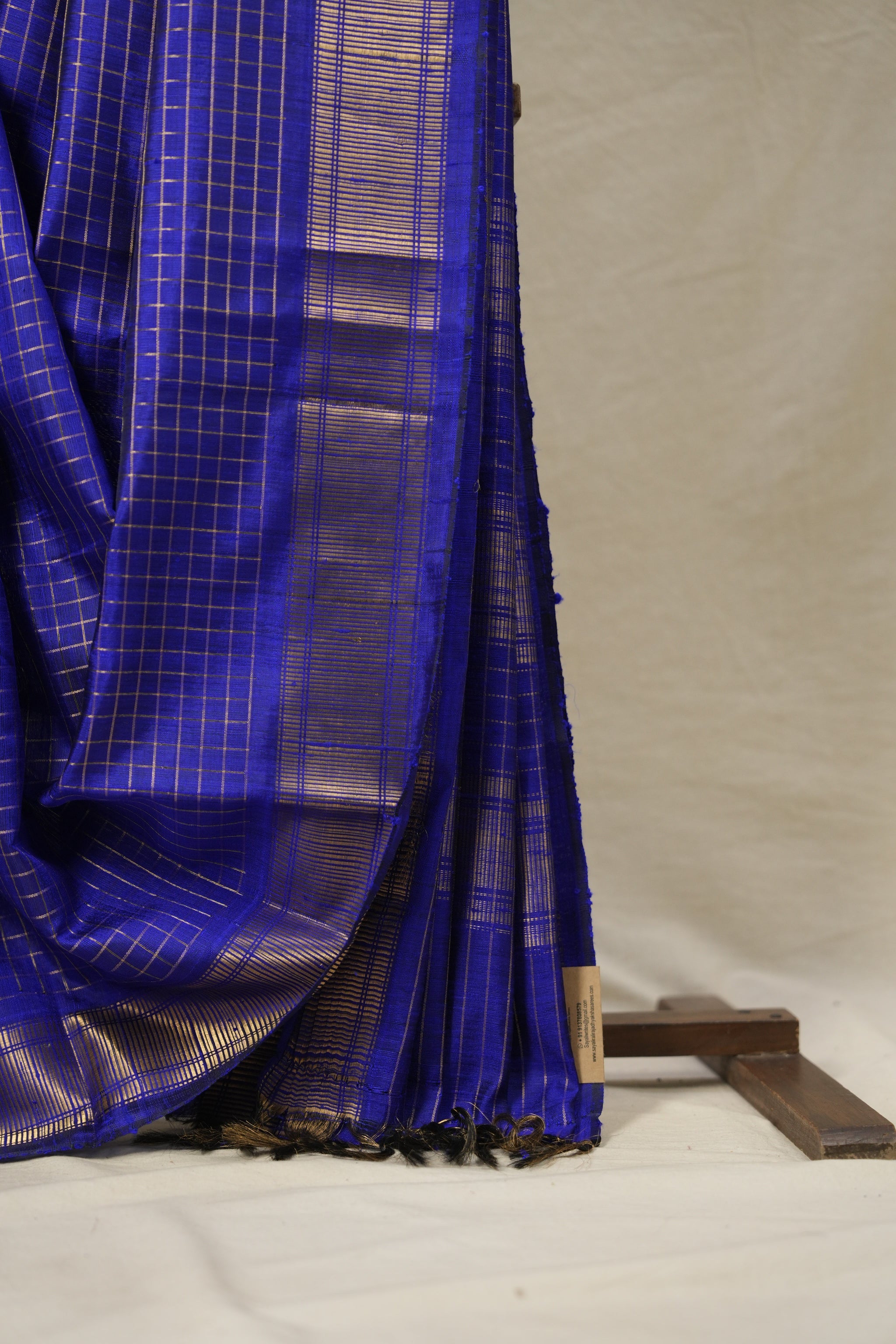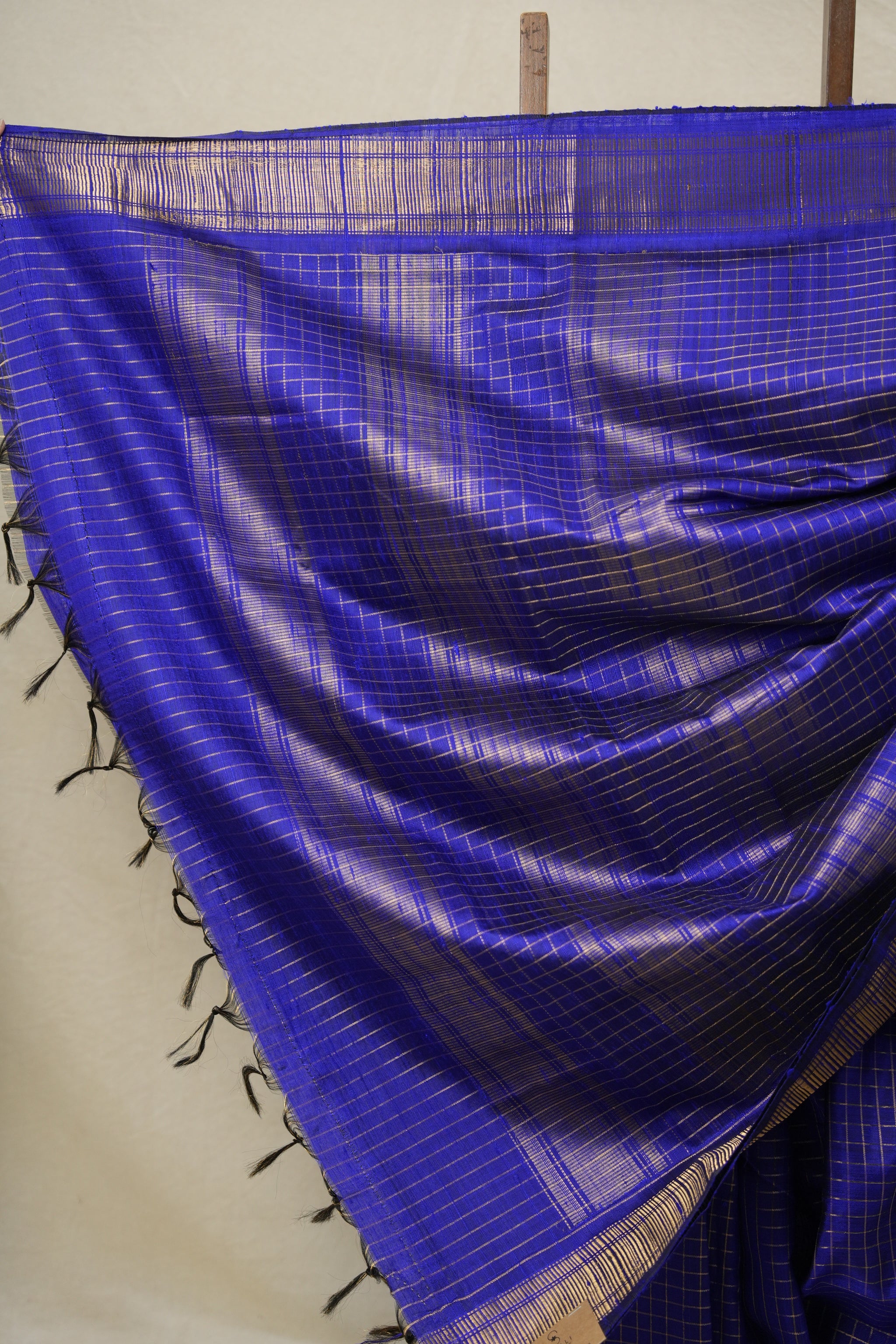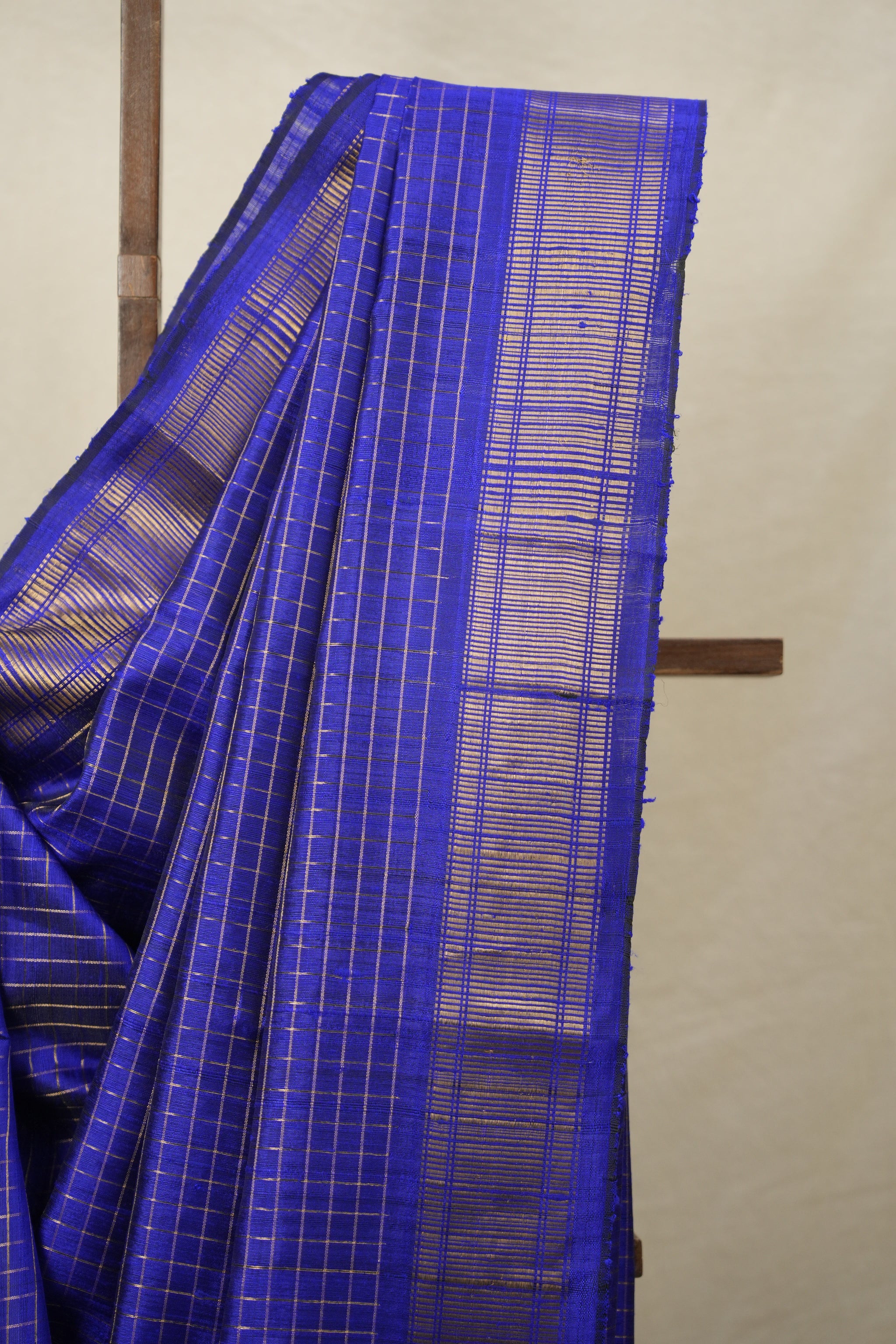 Work - This raw silk saree features a royal blue with checks pattern all over body and a solid border, showcasing a rich and elegant look.