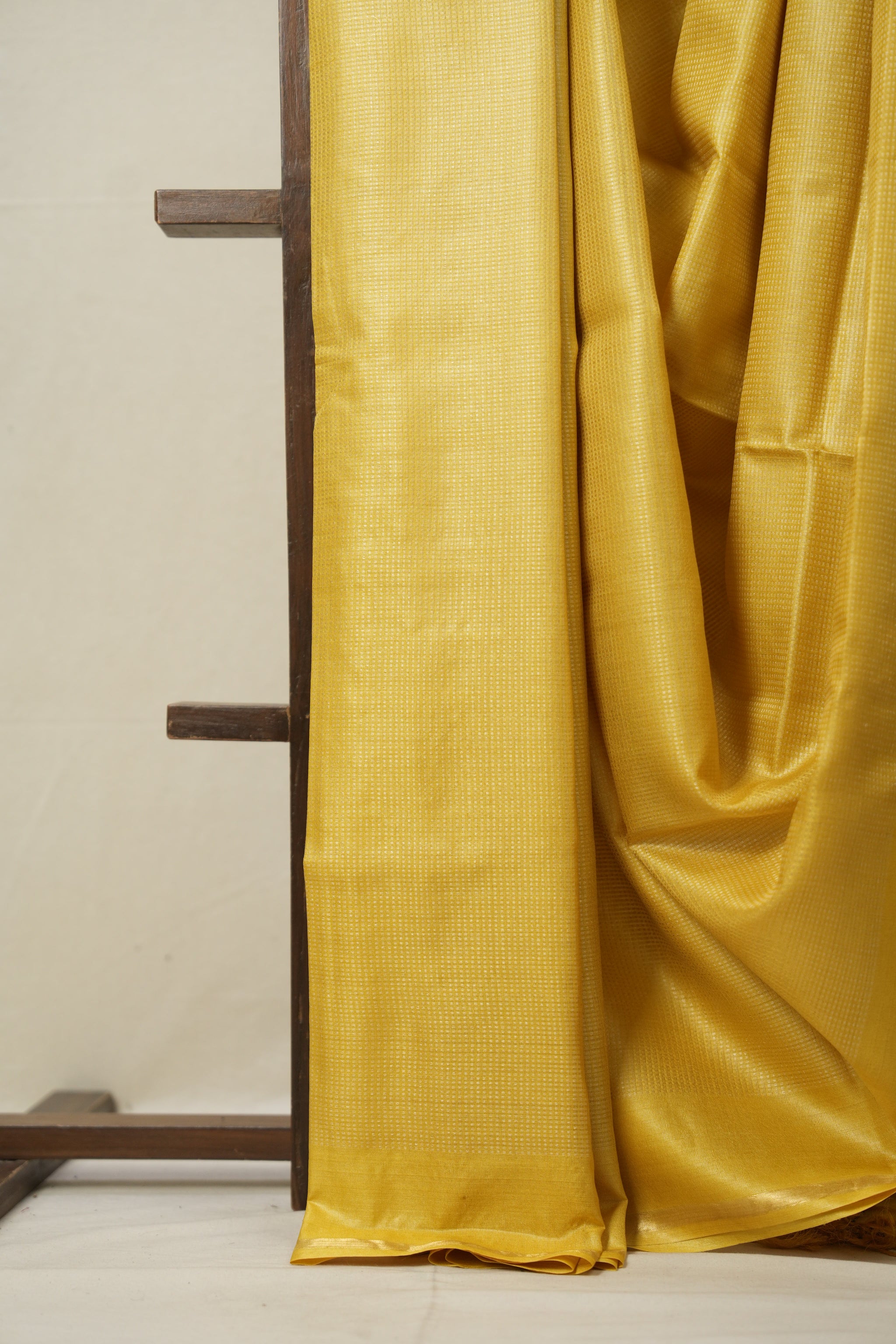 Work -  This is a yellow tussar saree with a self-woven or striped pattern and a subtle, ornate border.