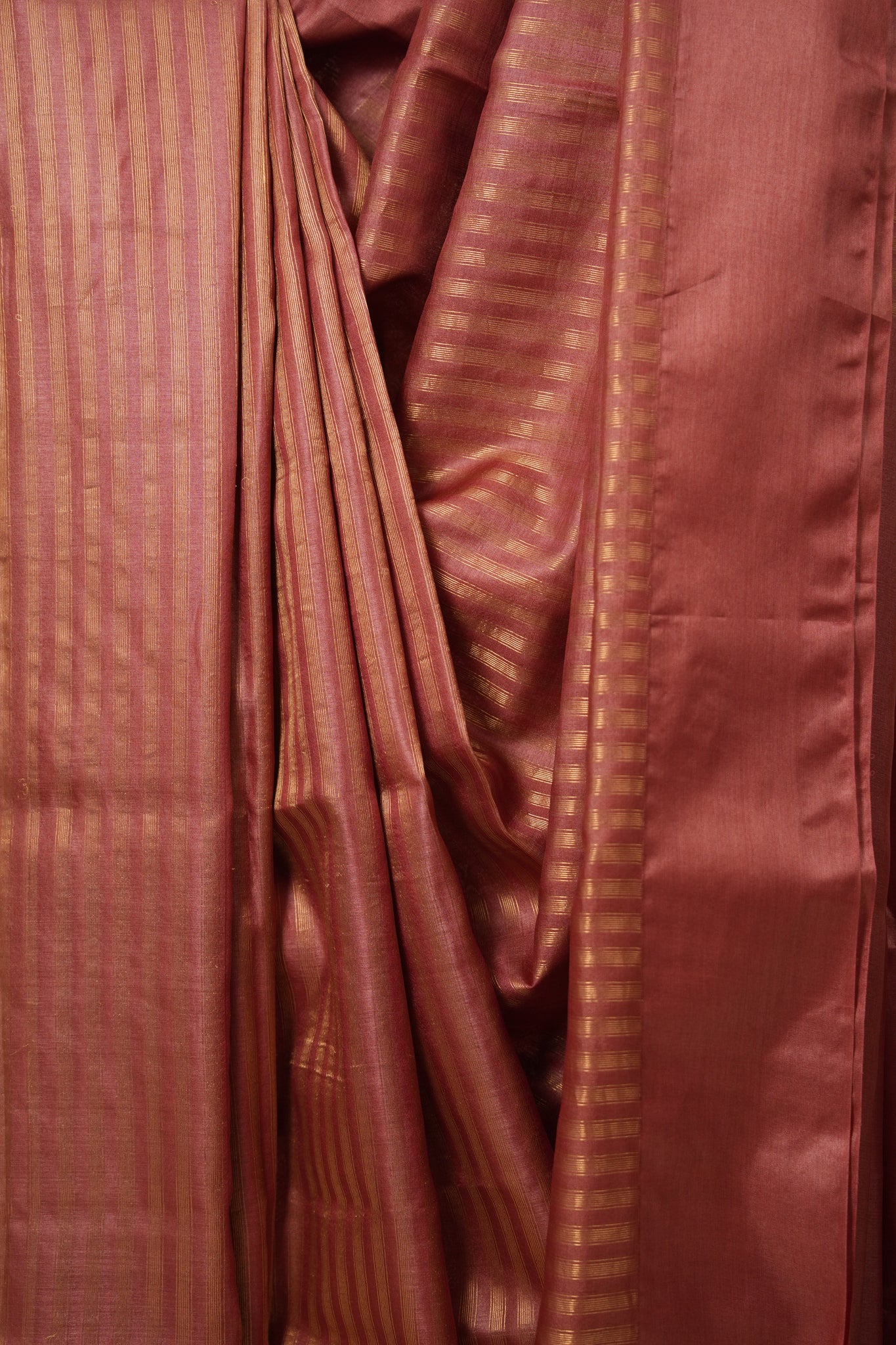 Work - This is a brick red tussar saree with a self-woven or striped pattern and a subtle, ornate border.