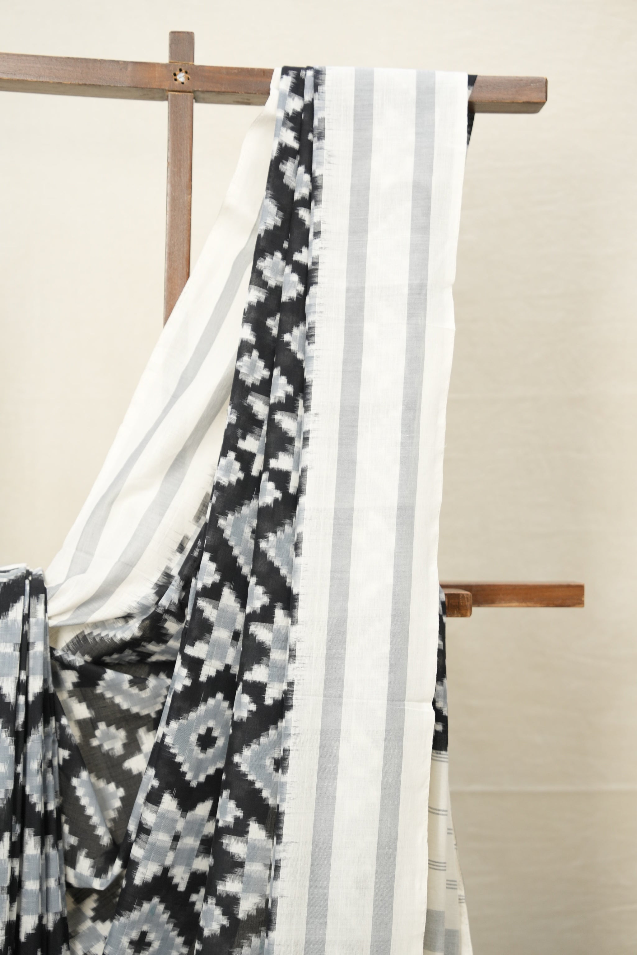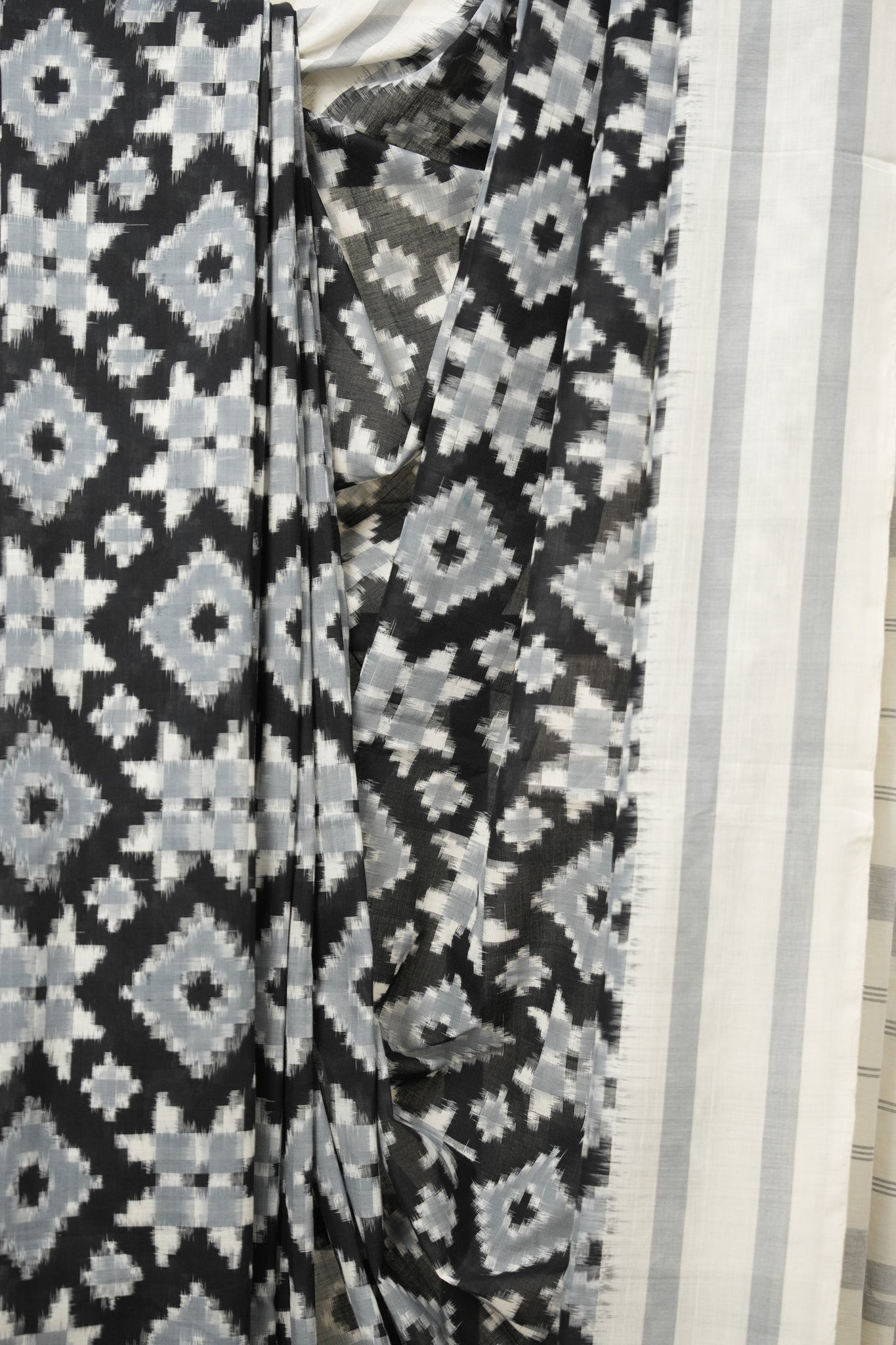 Work - This is a Pochampalli Cotton Ikat saree with grey ,white and black color body, complemented by an ikat patterned border and pallu.