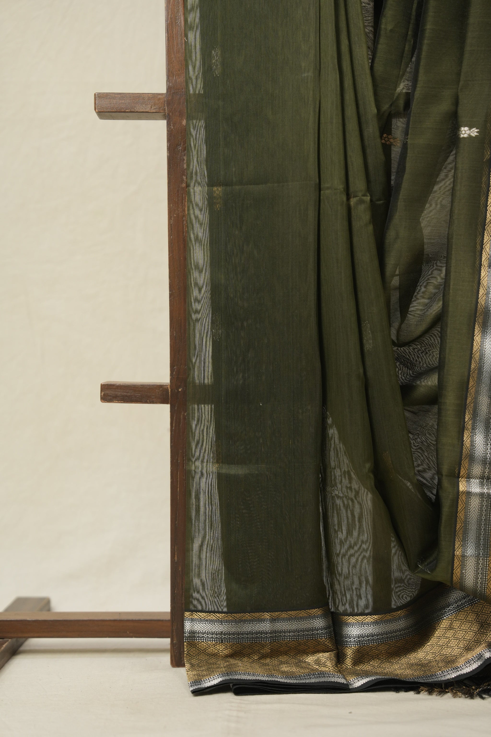 Work - This Maheshwari cotton silk saree features a plain body and gold silver motifs with contrast zari border and pallu with design .