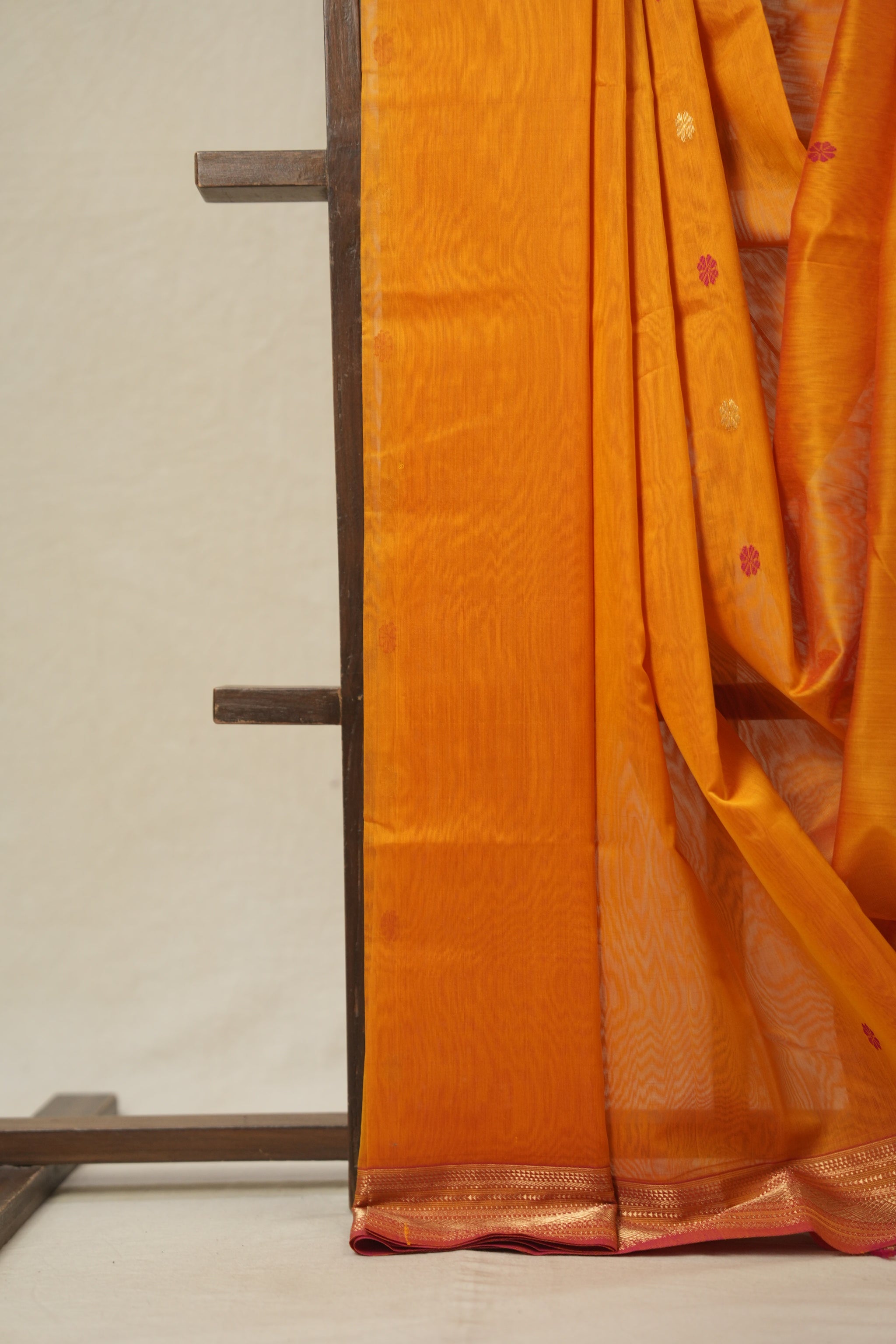 Work - This Maheshwari cotton silk saree features a plain body and buttis with contrast zari border and pallu with plain design .