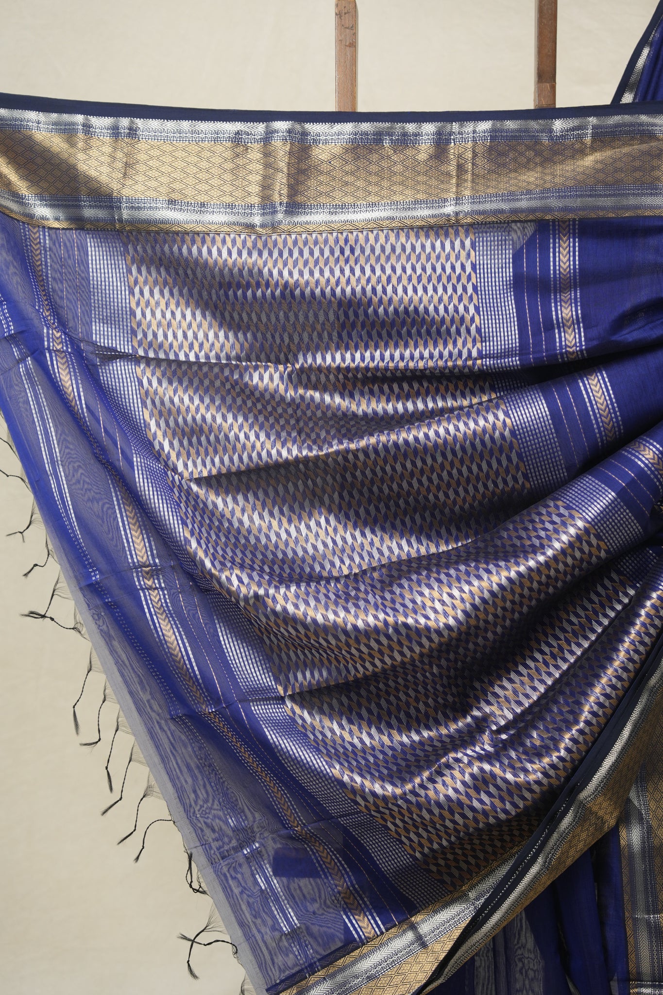 Work - This Maheshwari cotton silk saree features a plain body and gold silver motifs with contrast zari border and pallu with plain design .