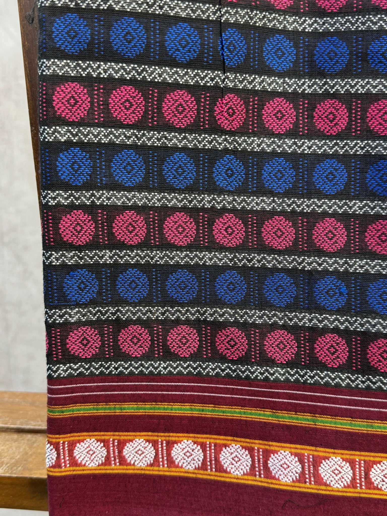 This saree has hathi mor black base with maroon border. Running pallu with beautiful 3 layered tassels. Khun with 72% cotton 28% rayon art silk. No polyester used. This product is powerloom and pattern khun blouse piece.