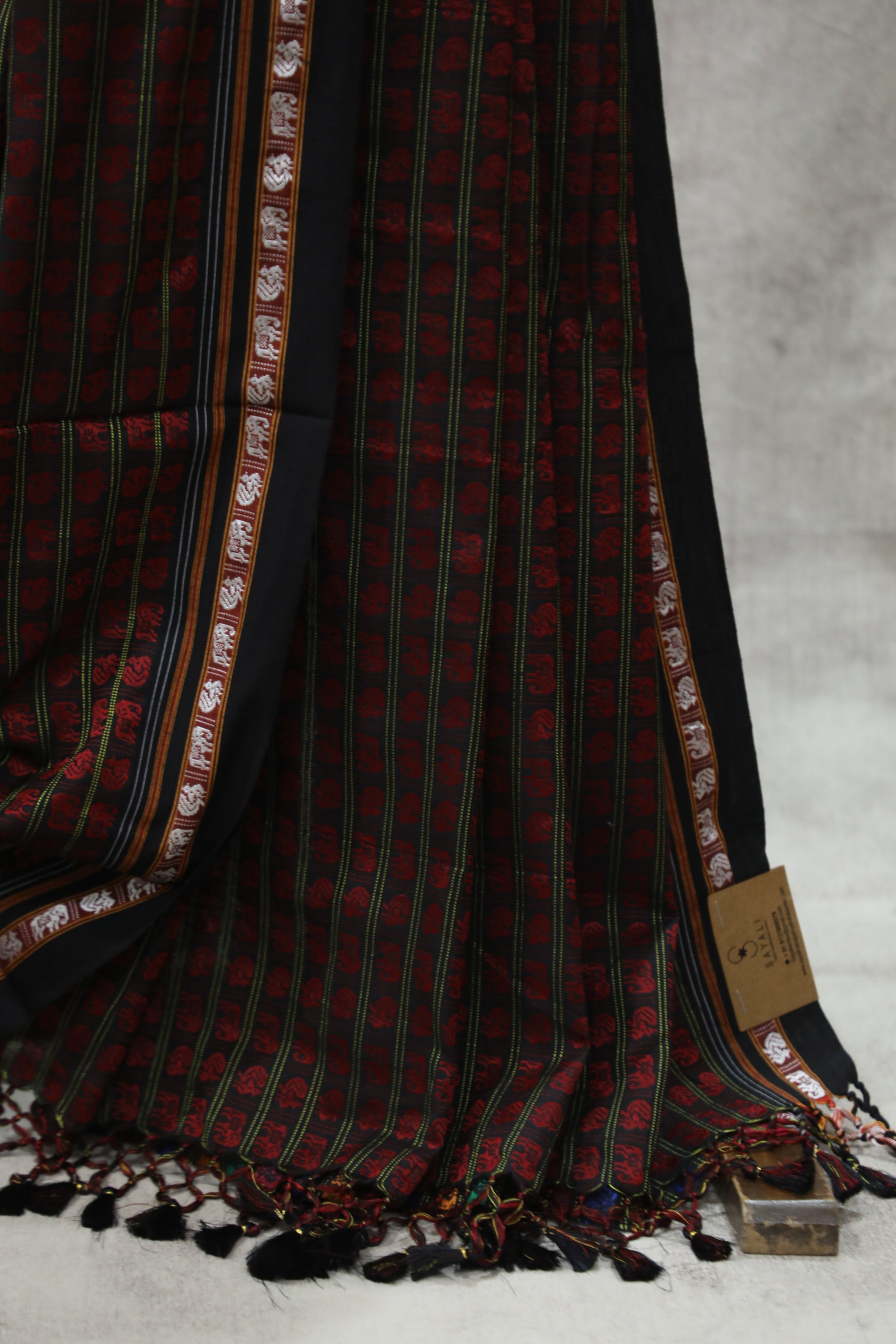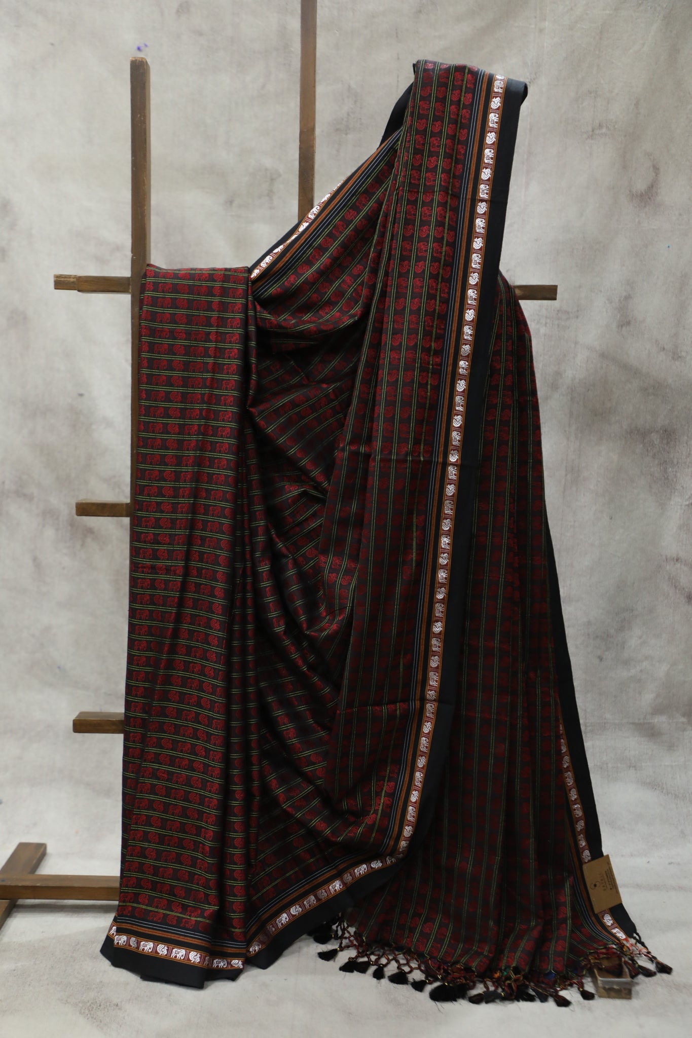 This black coloured hathi mor khun saree with black border. Running pallu with beautiful 3 layered tassels. Khun with 72% cotton 28% rayon art silk. No polyester used. This product is power loom. Khun is a culturally significant fabric in Maharashtra and Karnataka. The traditional Khun sarees are beautiful & lightweight that comes in combinations and innumerable designs, motifs and patterns on the cloth.