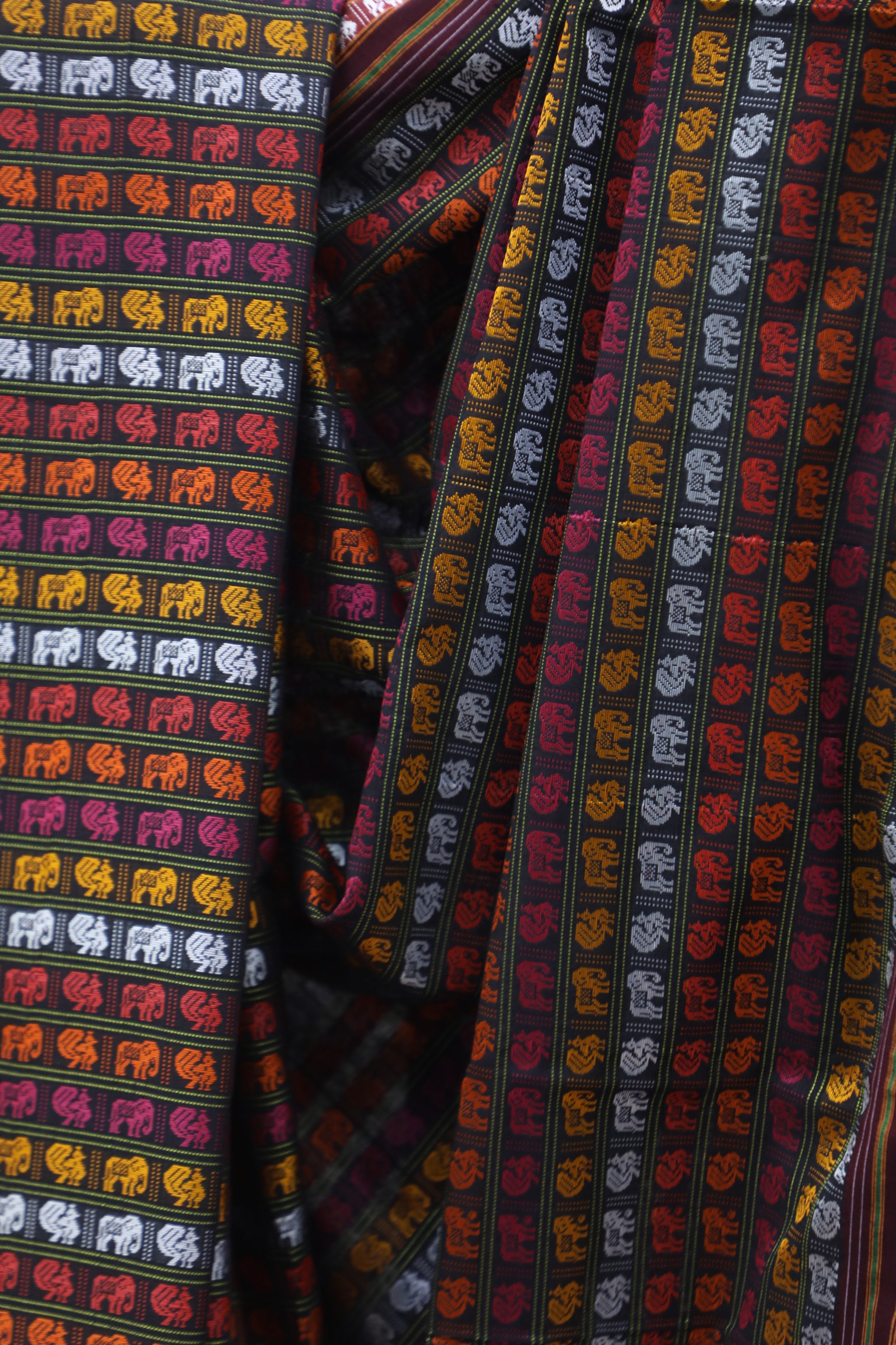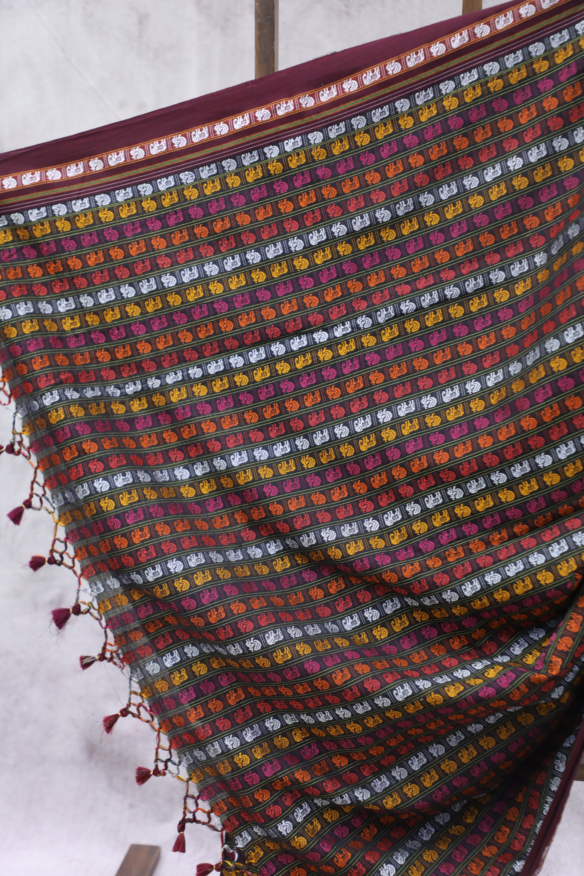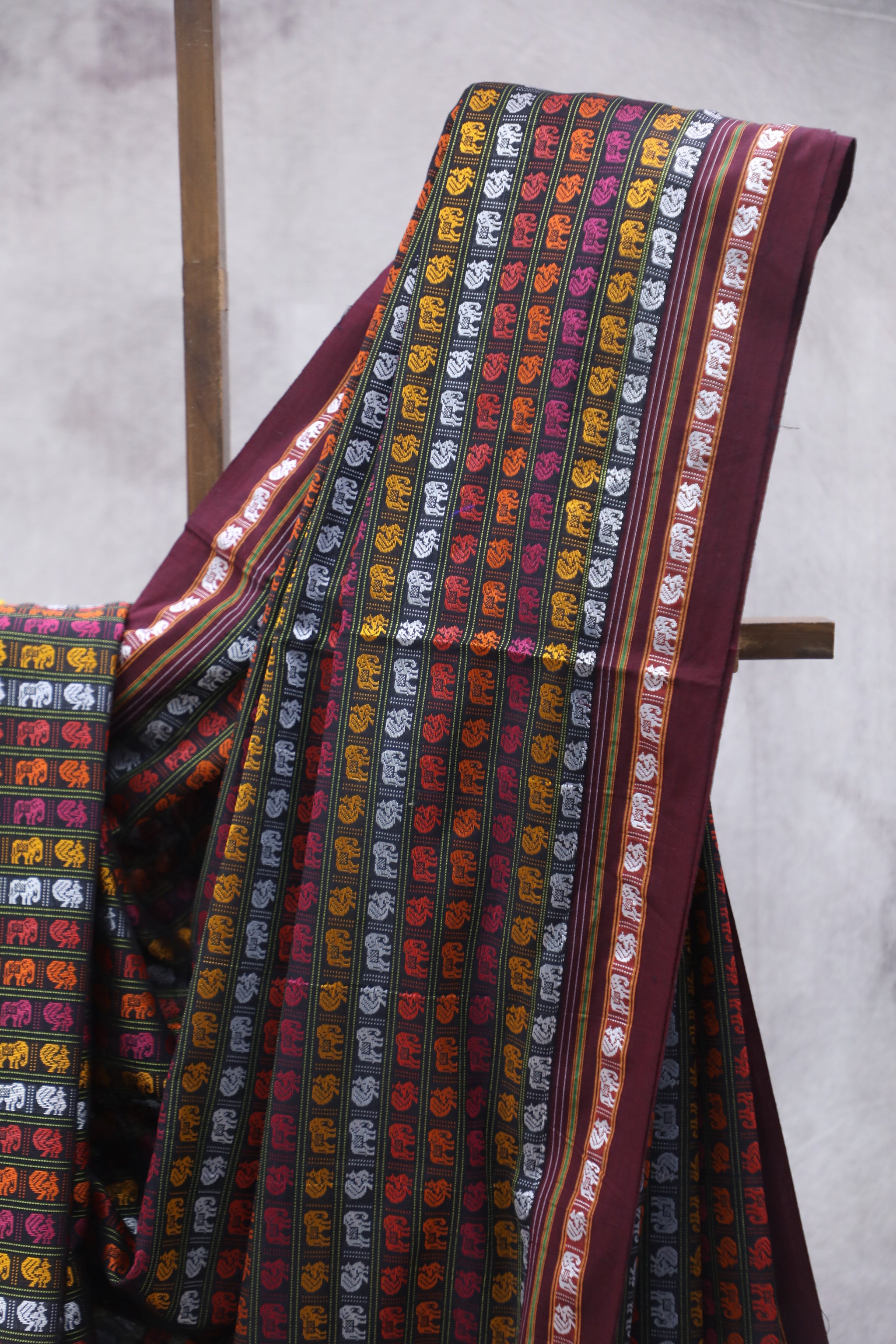 Black HathiMor Khun Saree With Maroon Border-SRBHMKS27EX