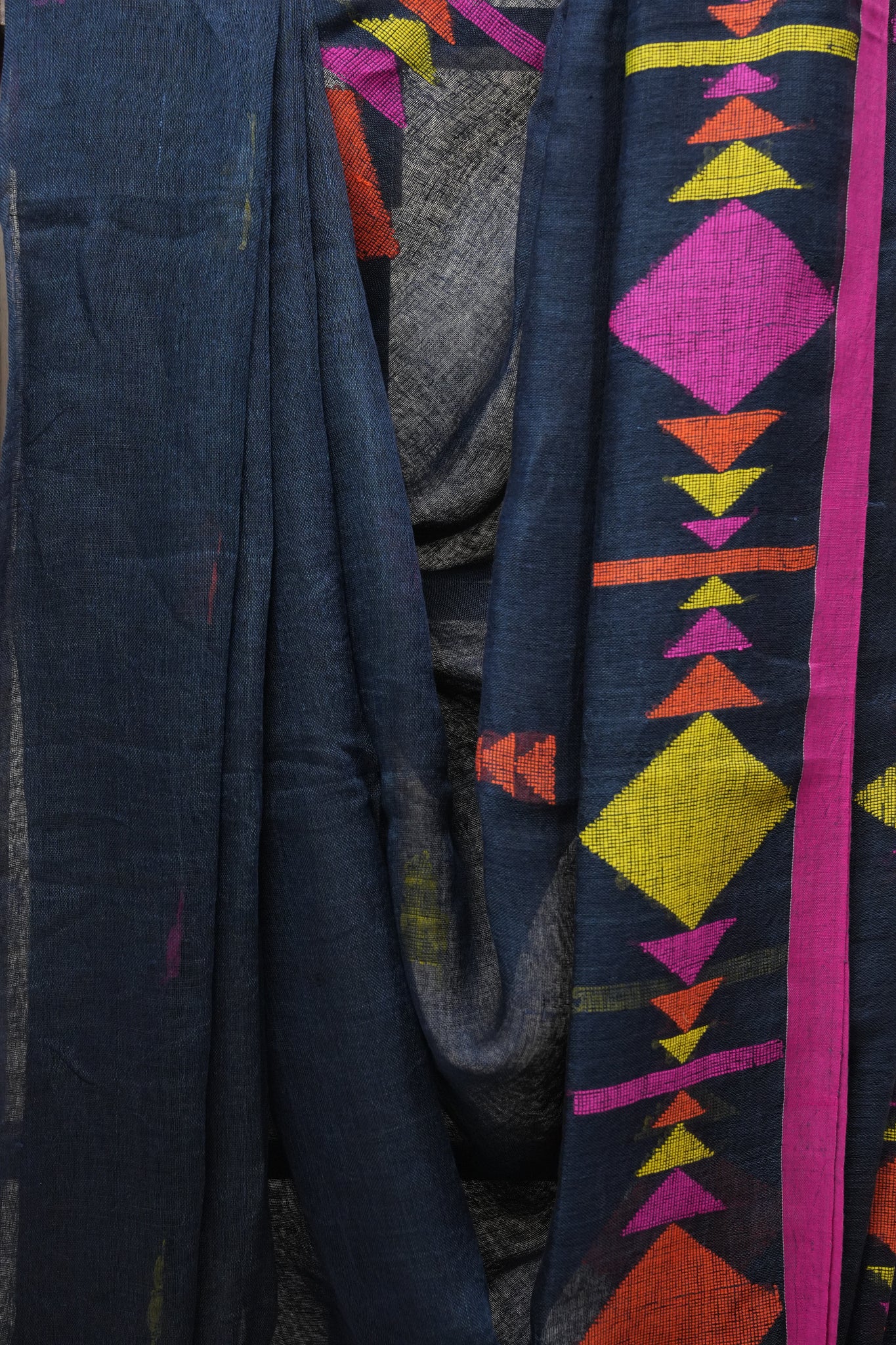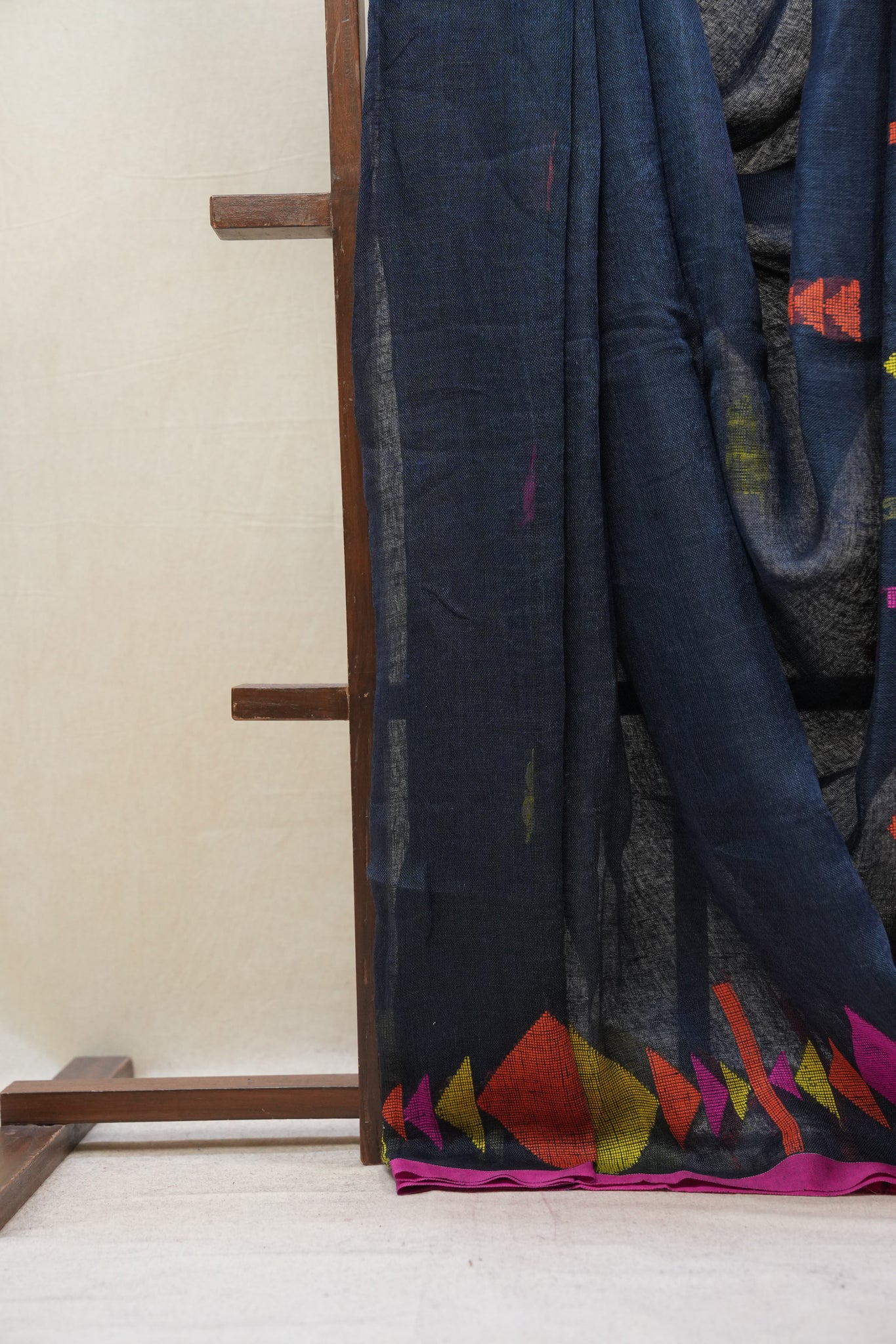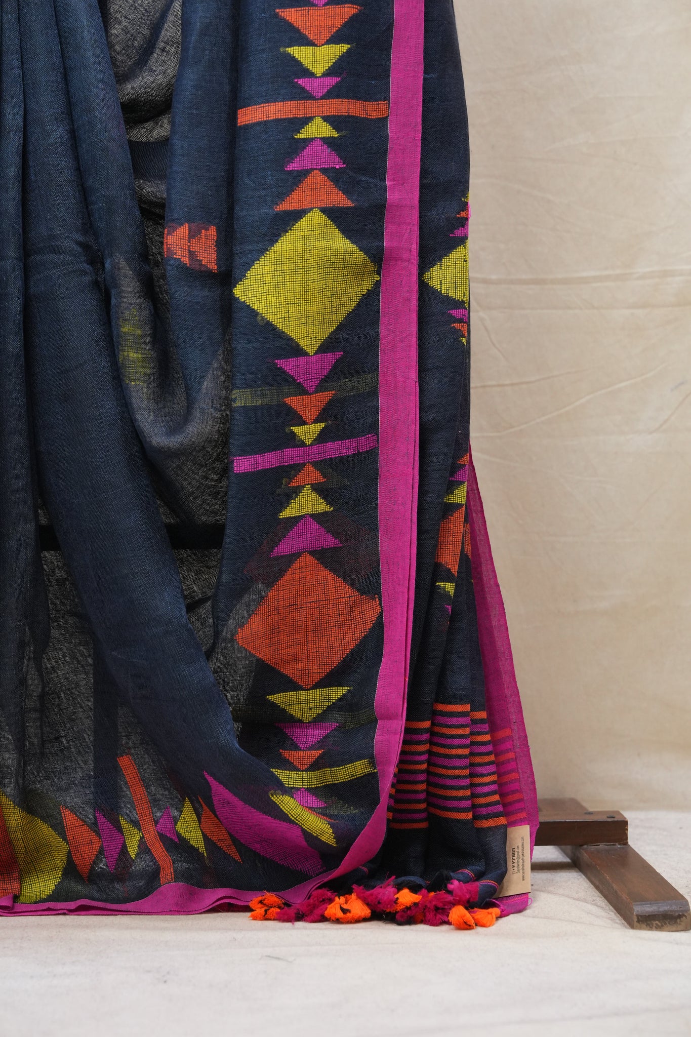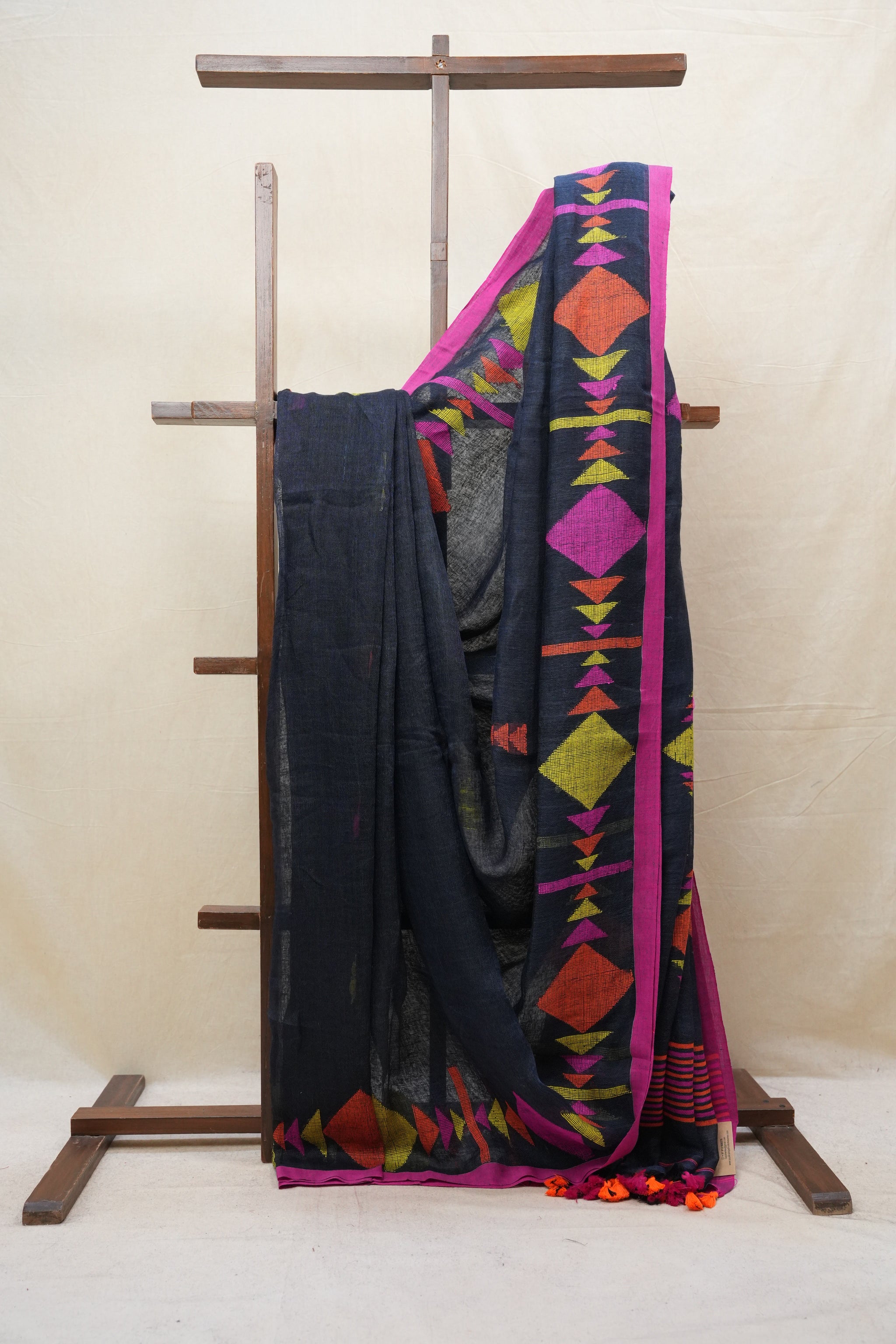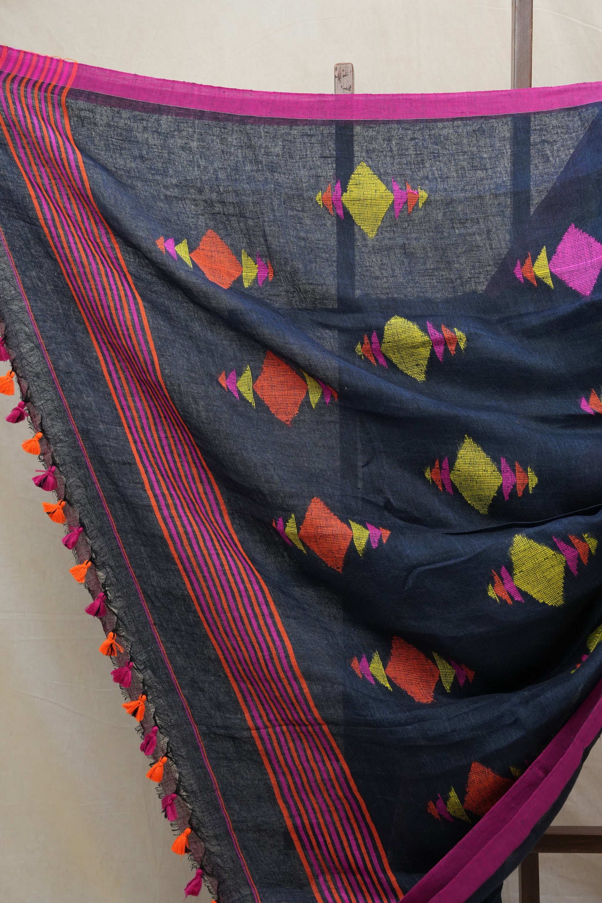 Black Linen Jamdani Saree With Multi Color Tassels - SRBLJS390