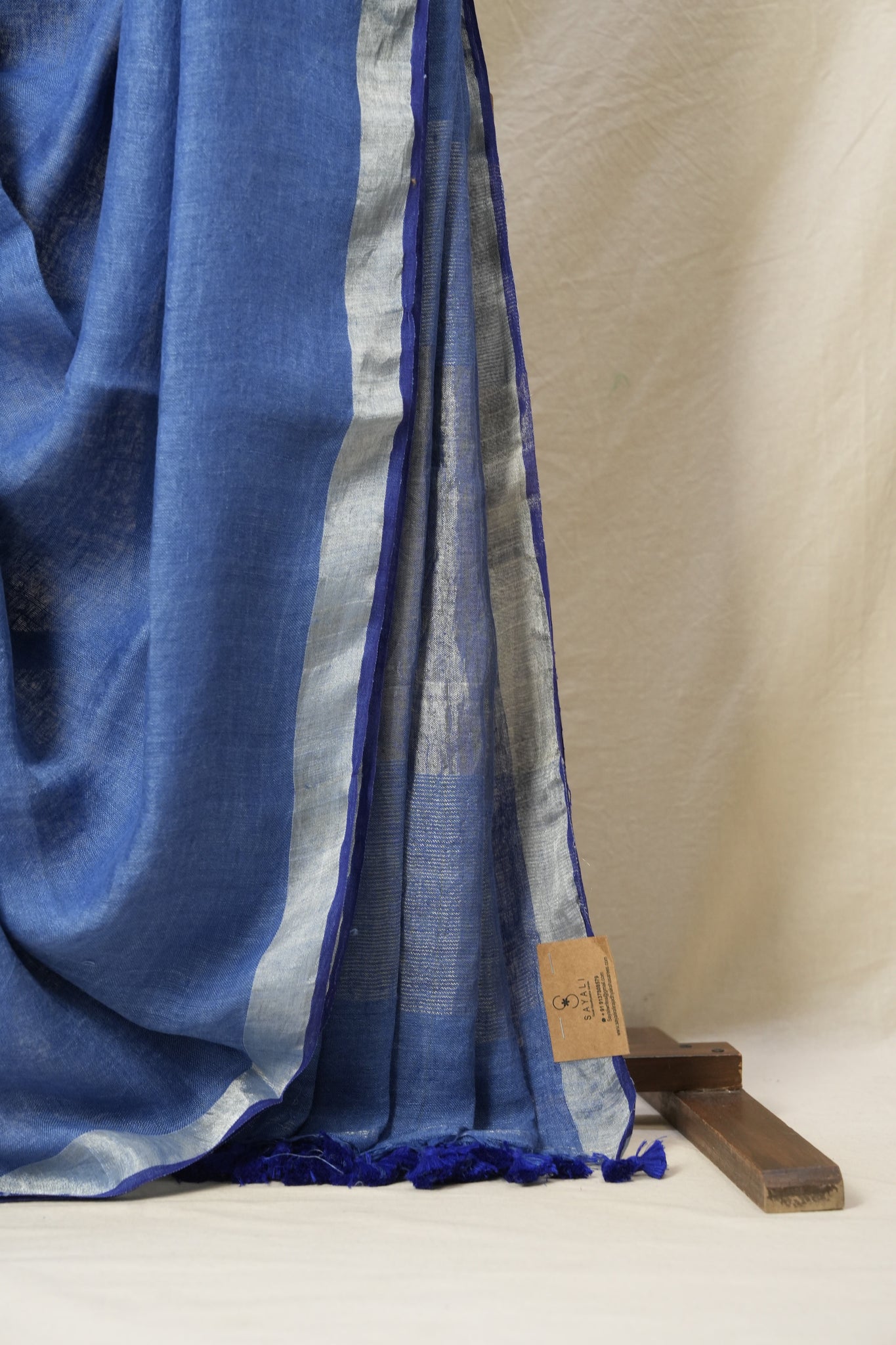 Blue Plain Linen Saree With Dark Blue Tassels-SRBPLS168