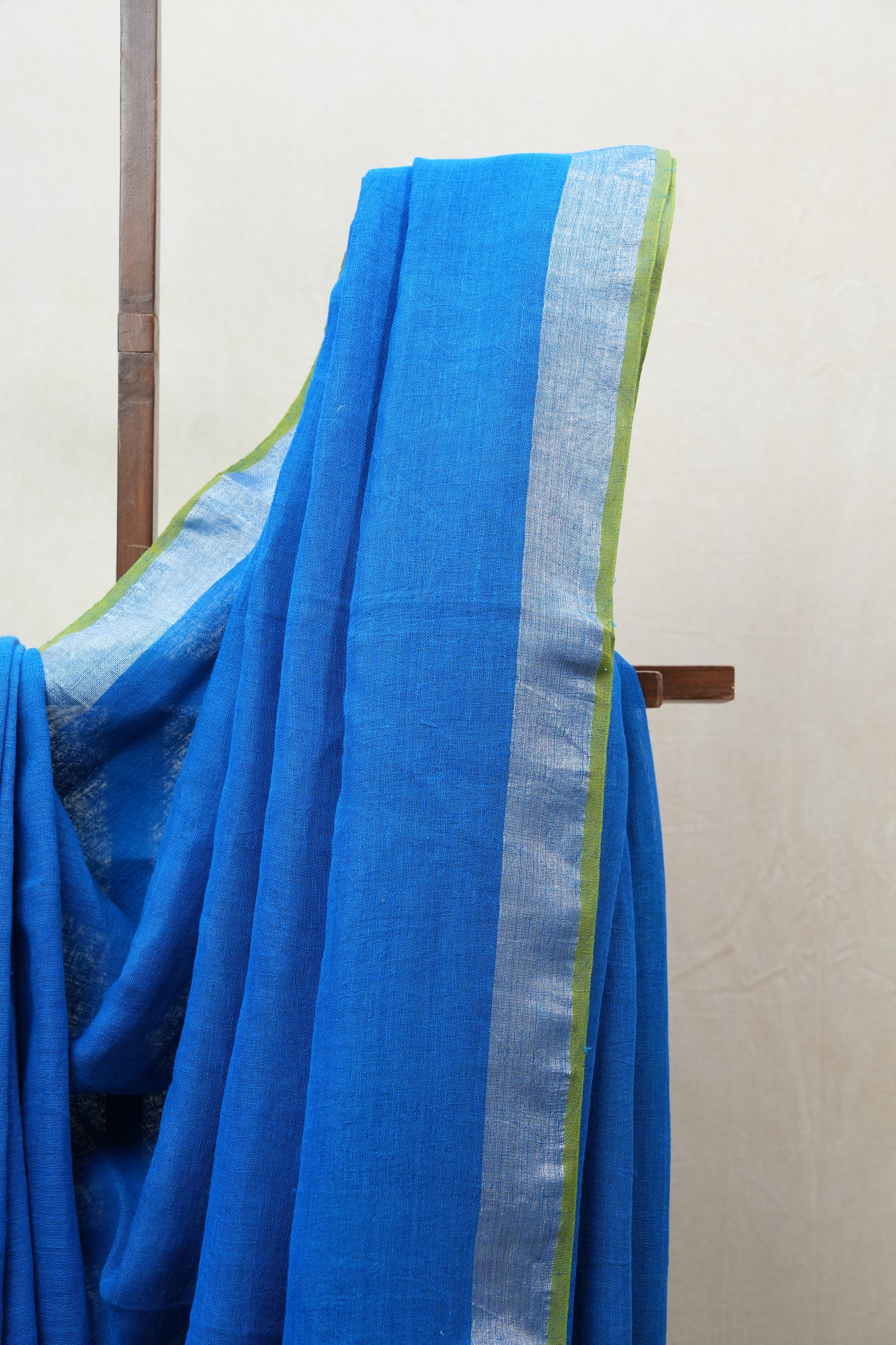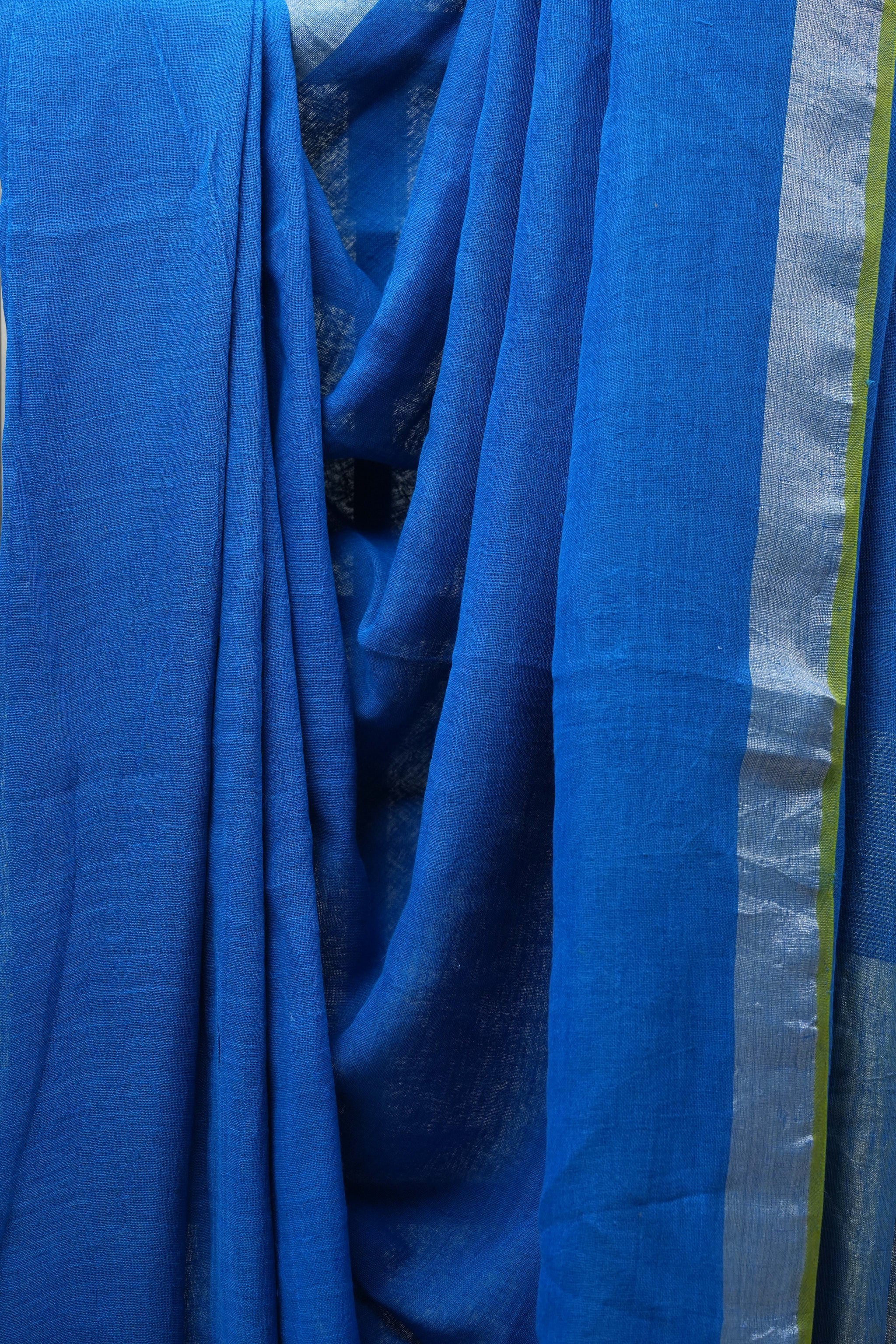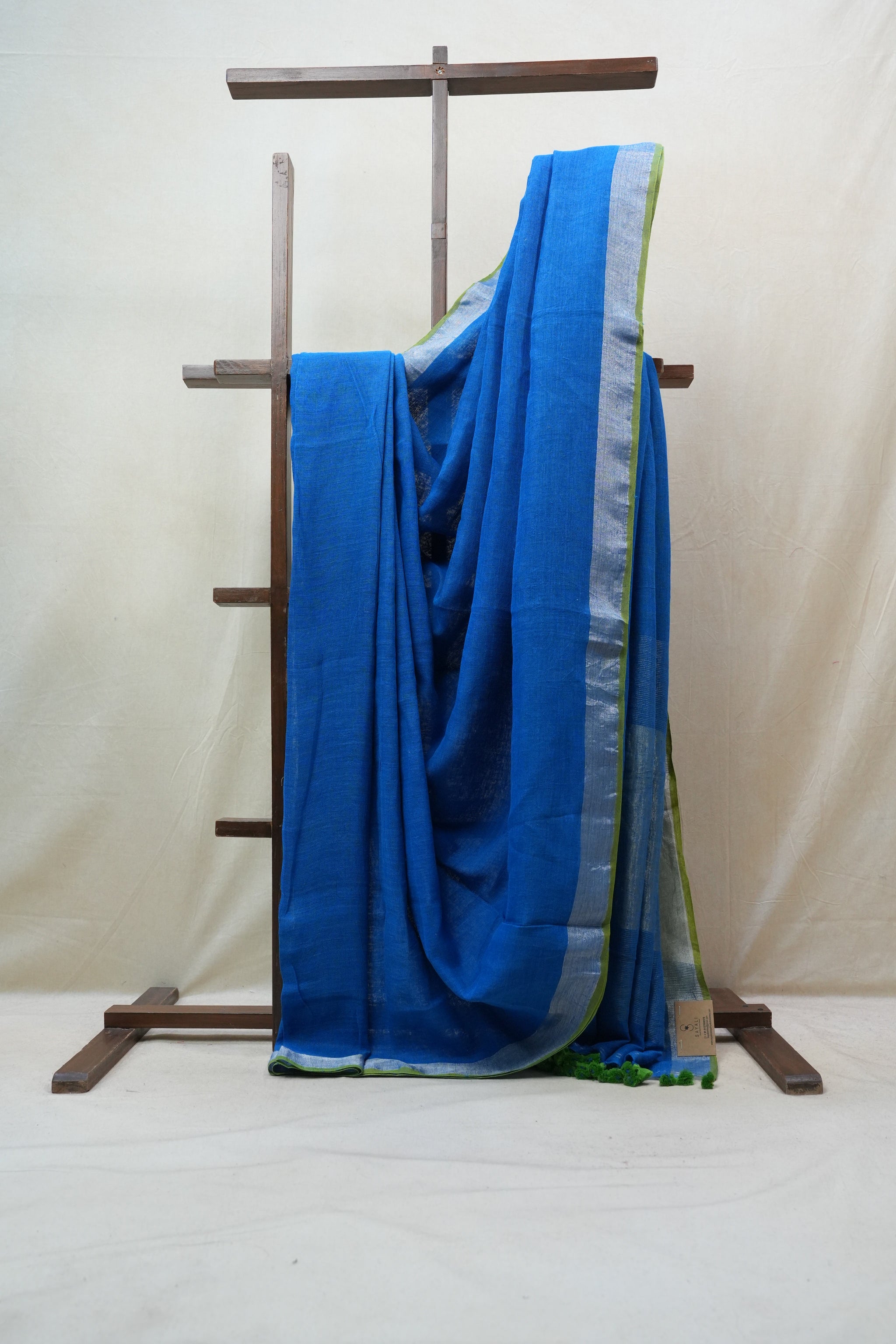 Blue Plain Linen Saree With Green Tassels - SRBPLS272