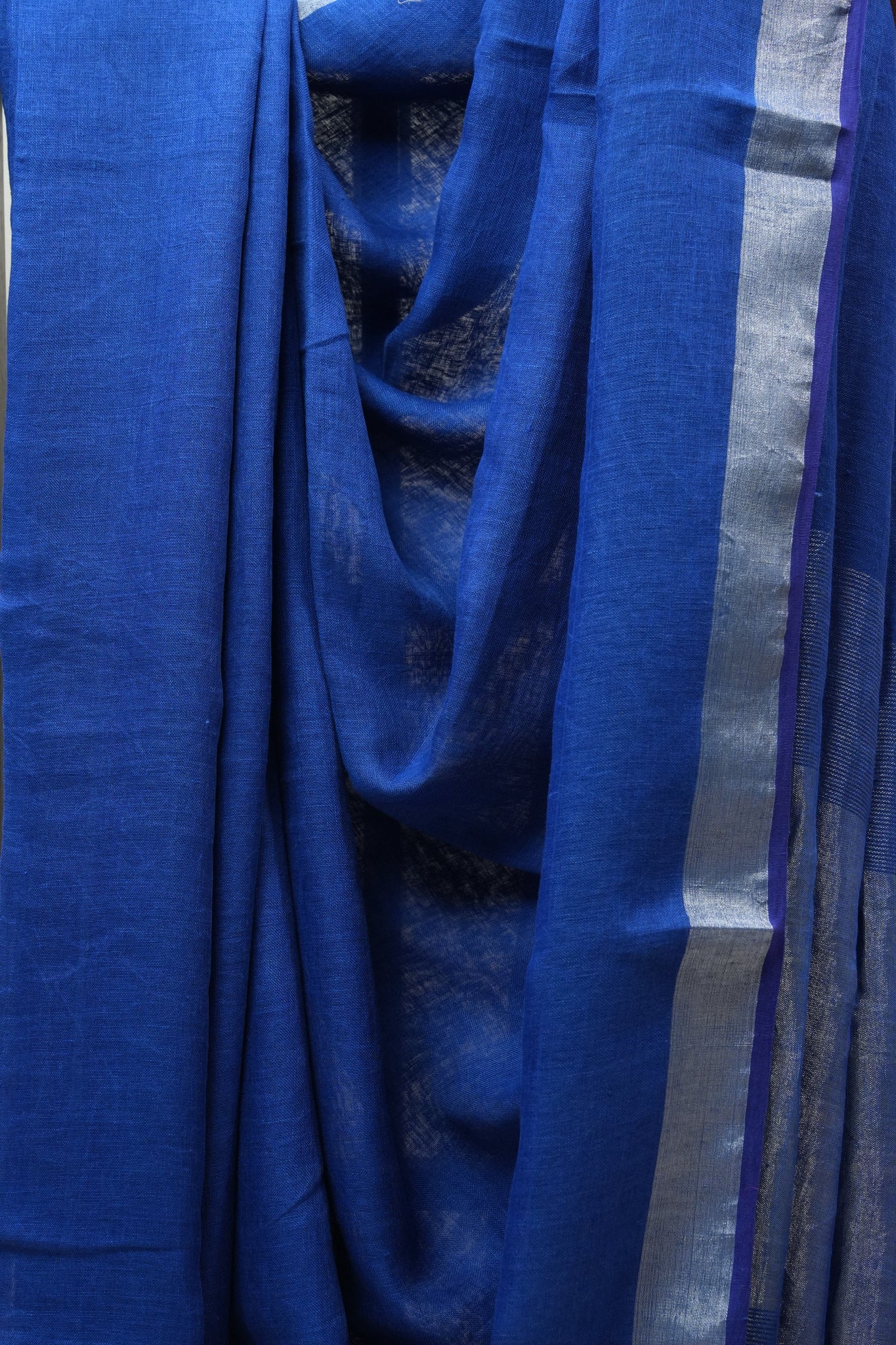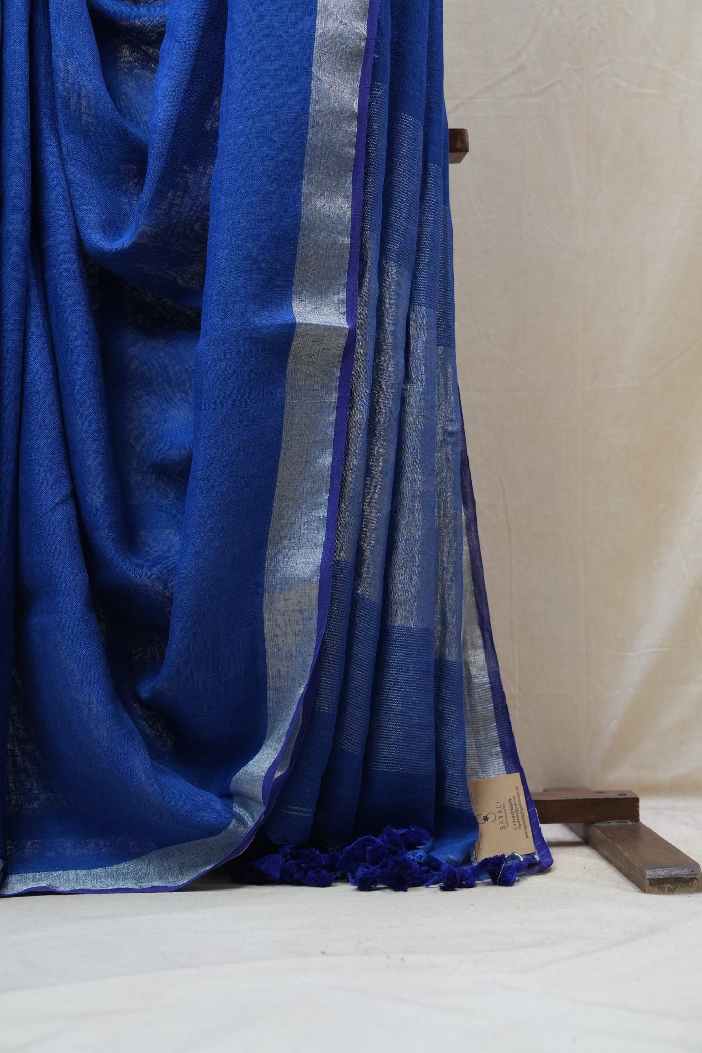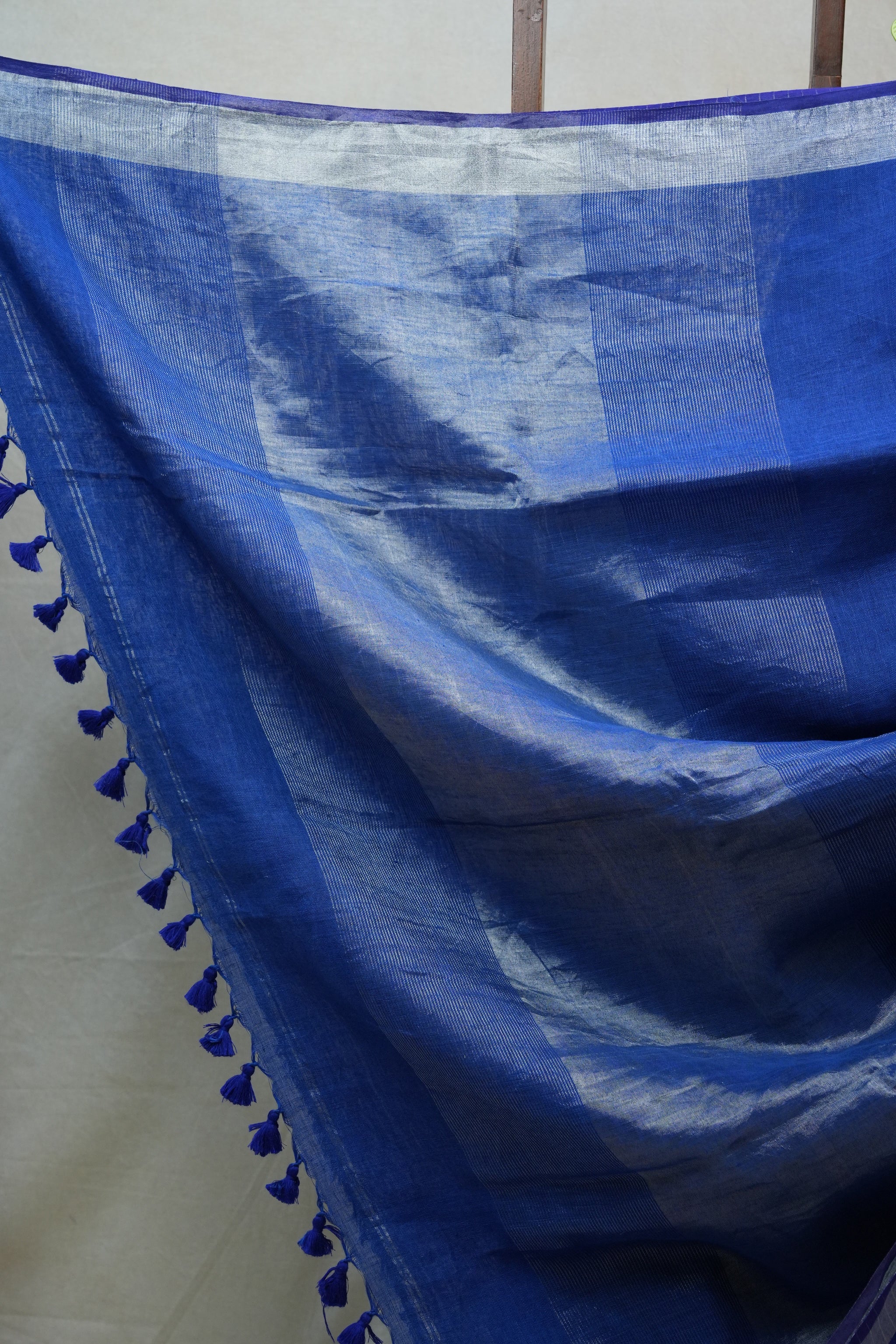Blue Plain Linen Saree With Tassels - SRBPLS271