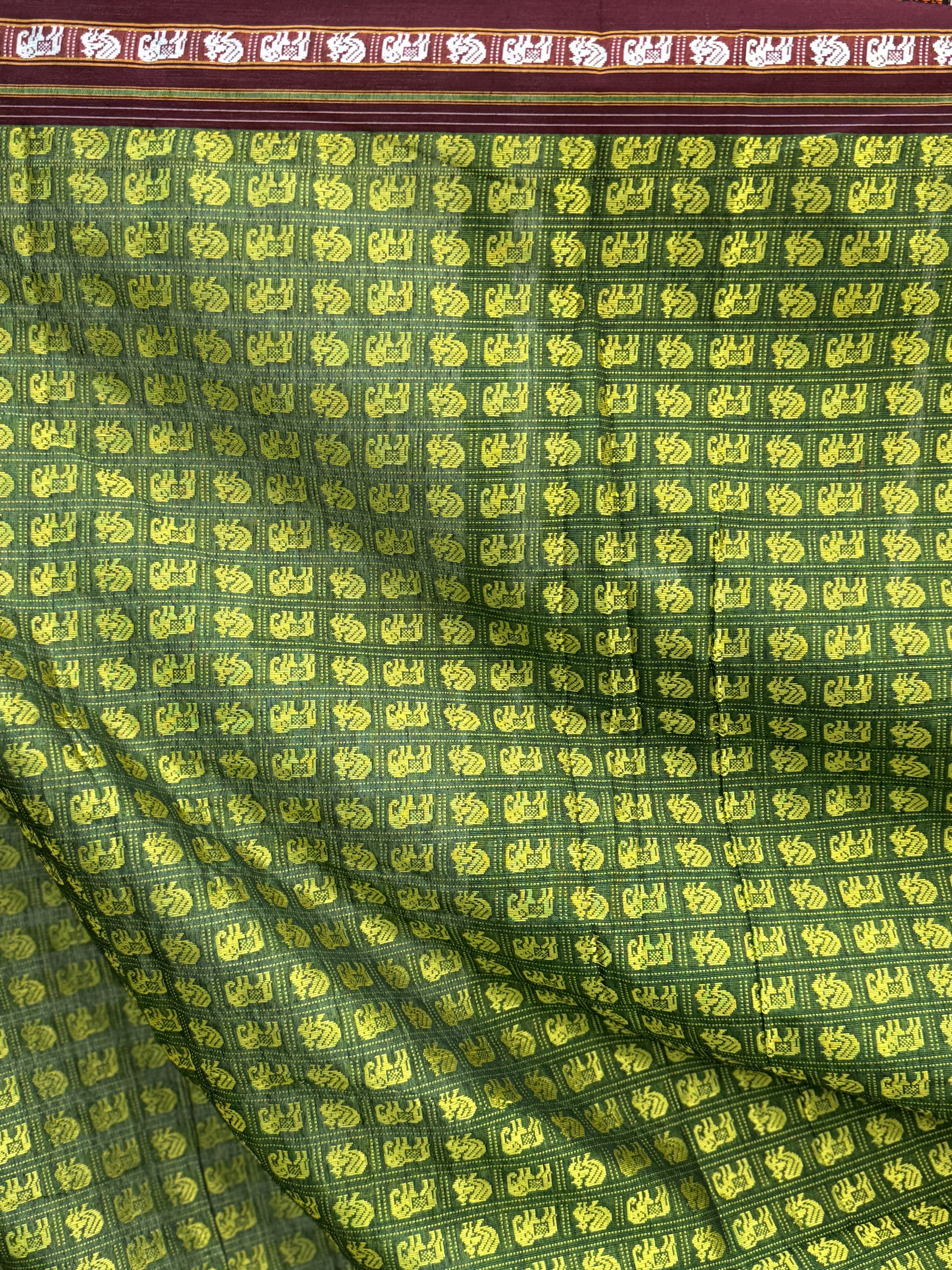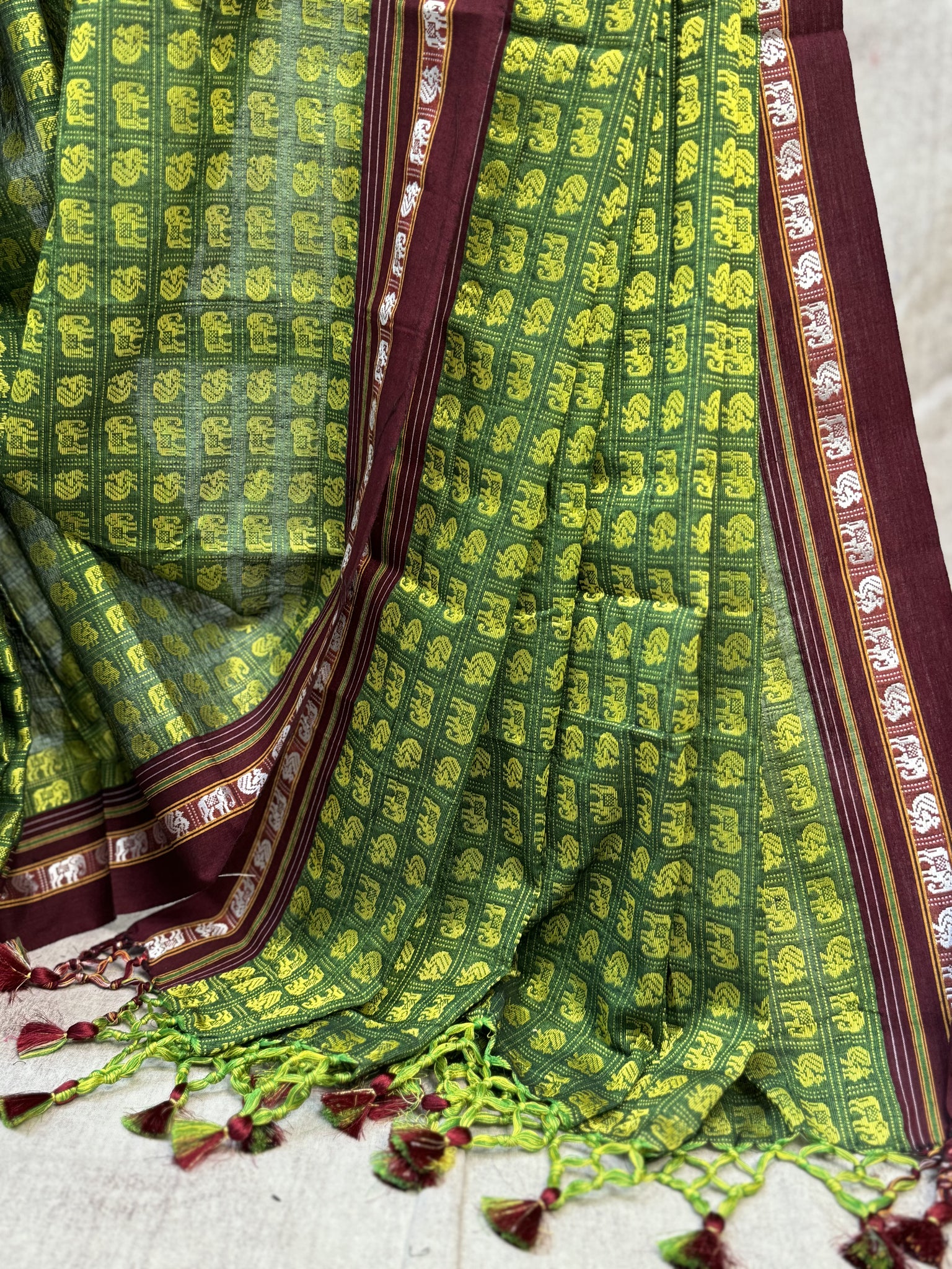 This saree has hathi mor green base with maroon border. Running pallu with beautiful 3 layered tassels. Khun with 72% cotton 28% rayon art silk. No polyester used. This product is powerloom and pattern khun blouse piece.