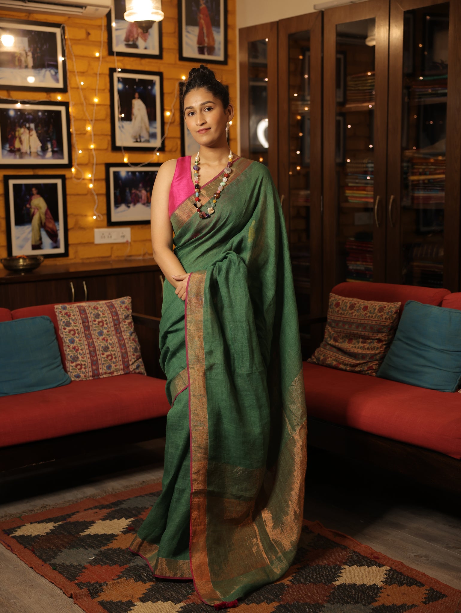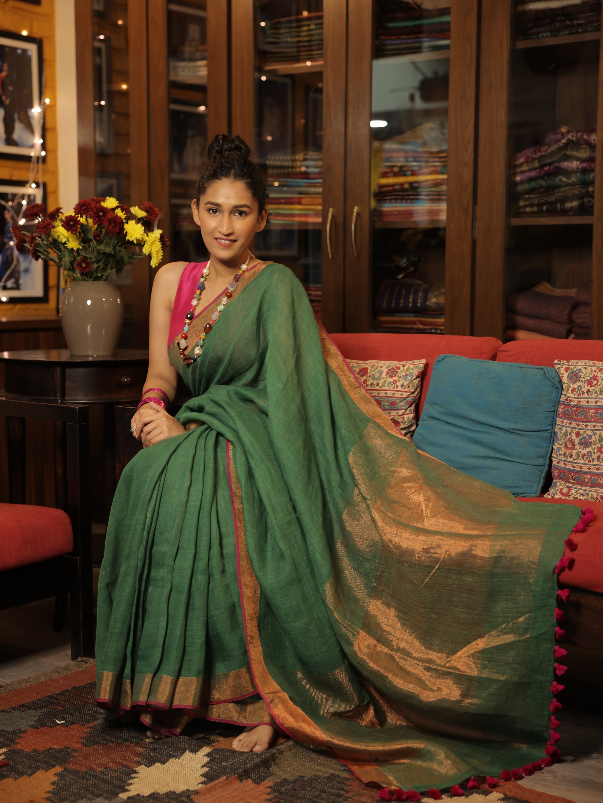Green Plain Linen Saree With Pink Tassels - SRGPLS292