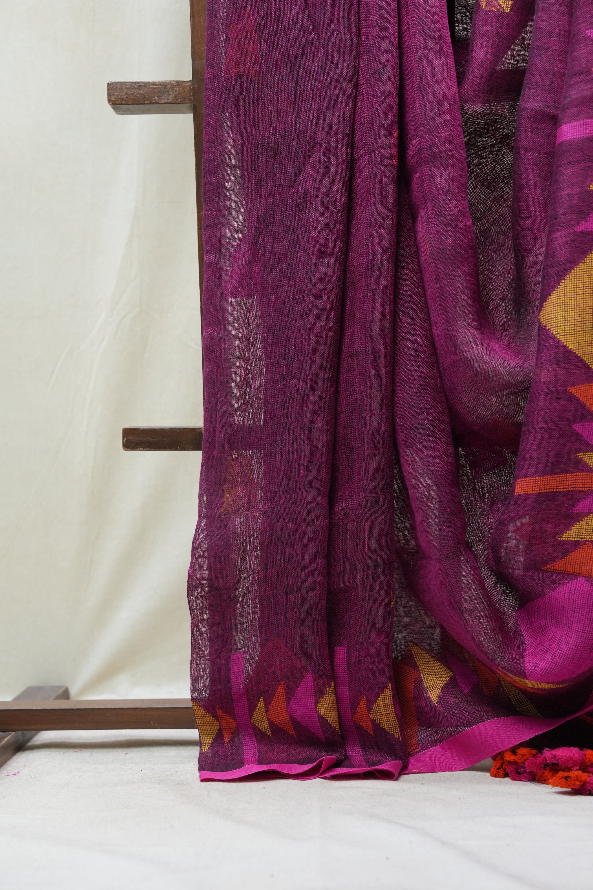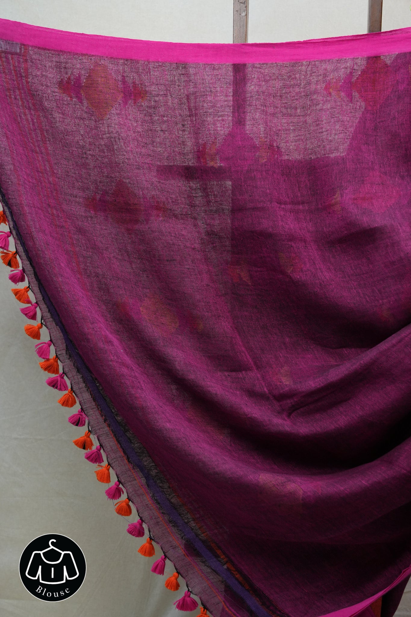 Magenta Linen Jamdani Saree With Tassels - SRMLJS349