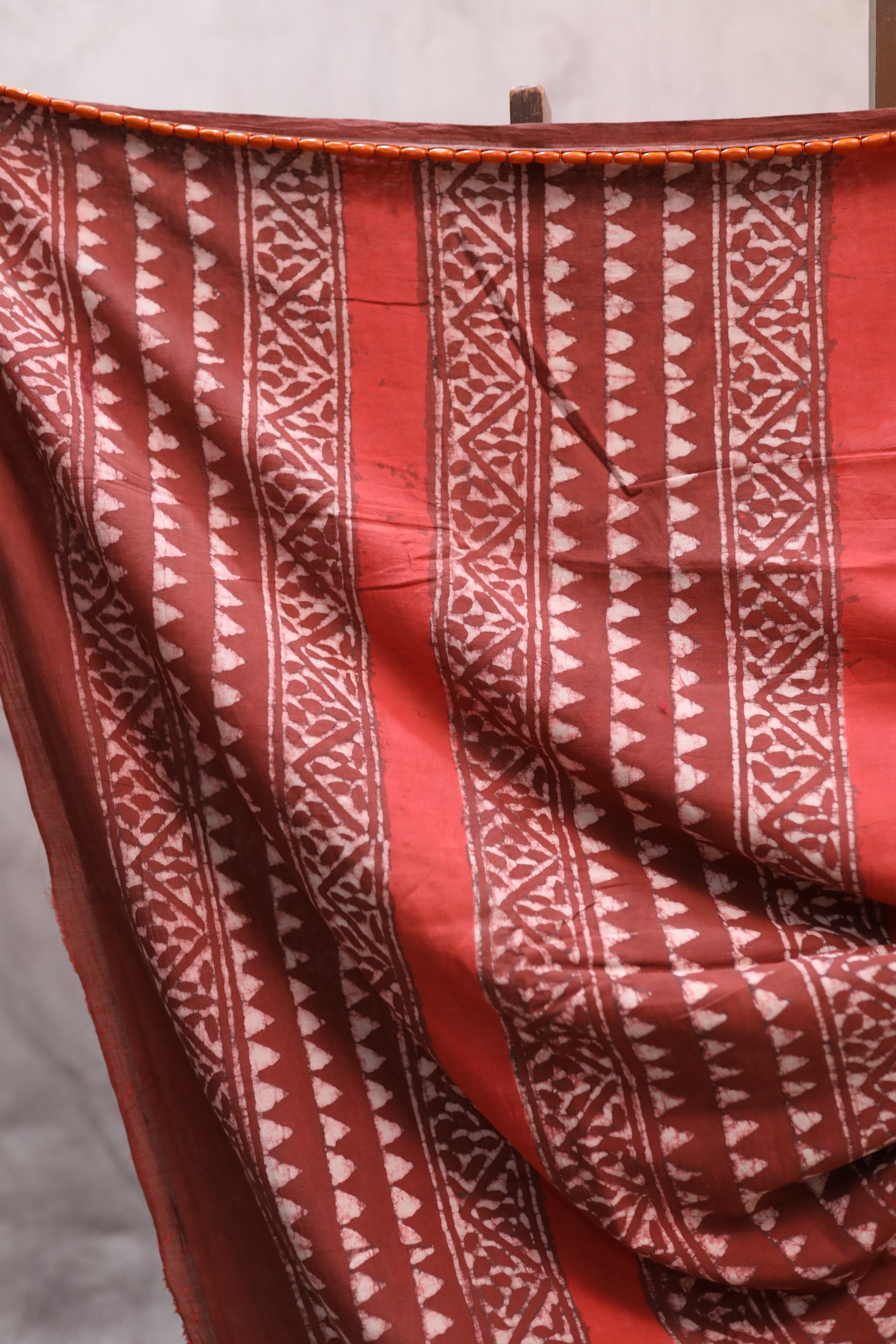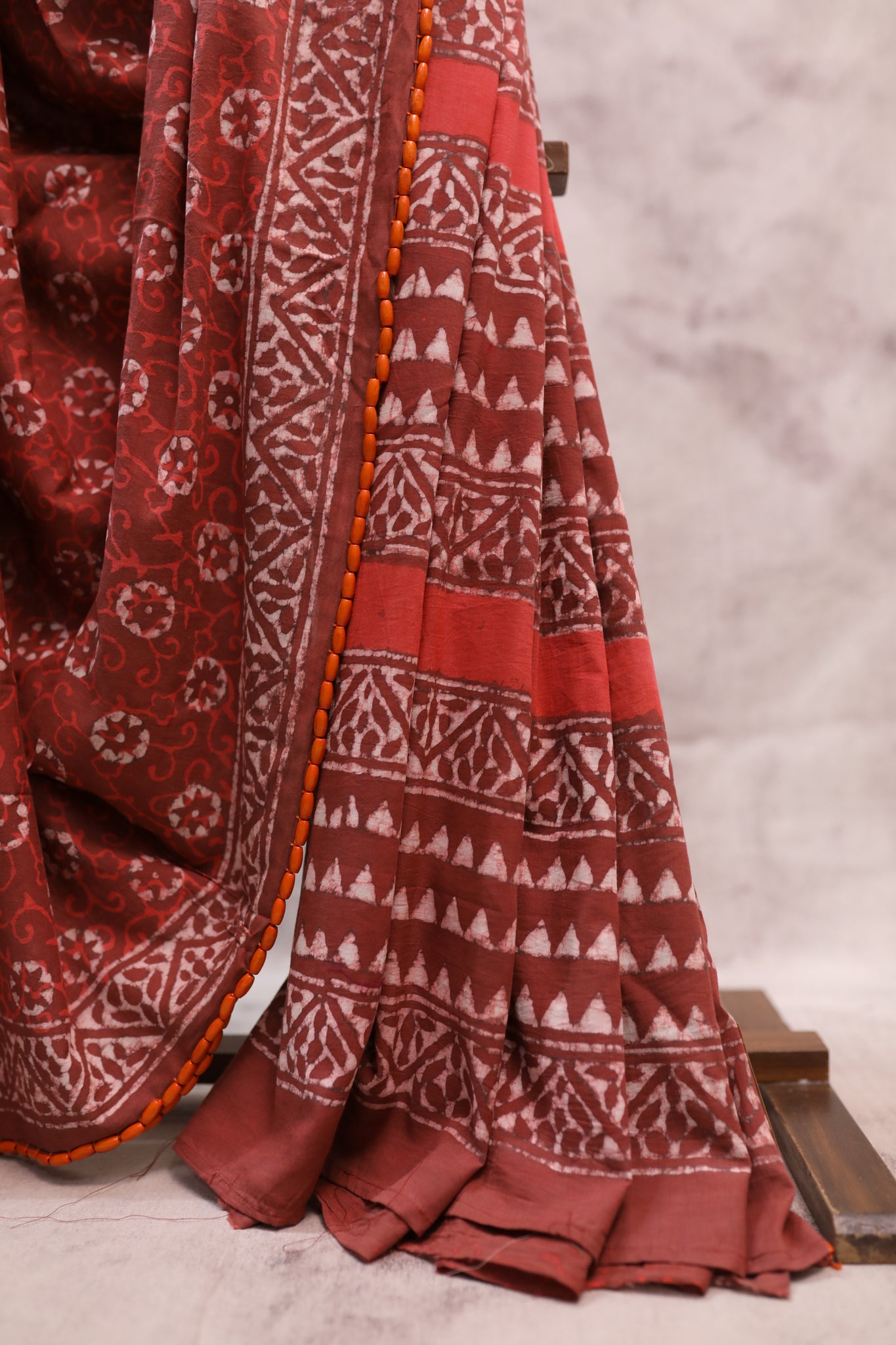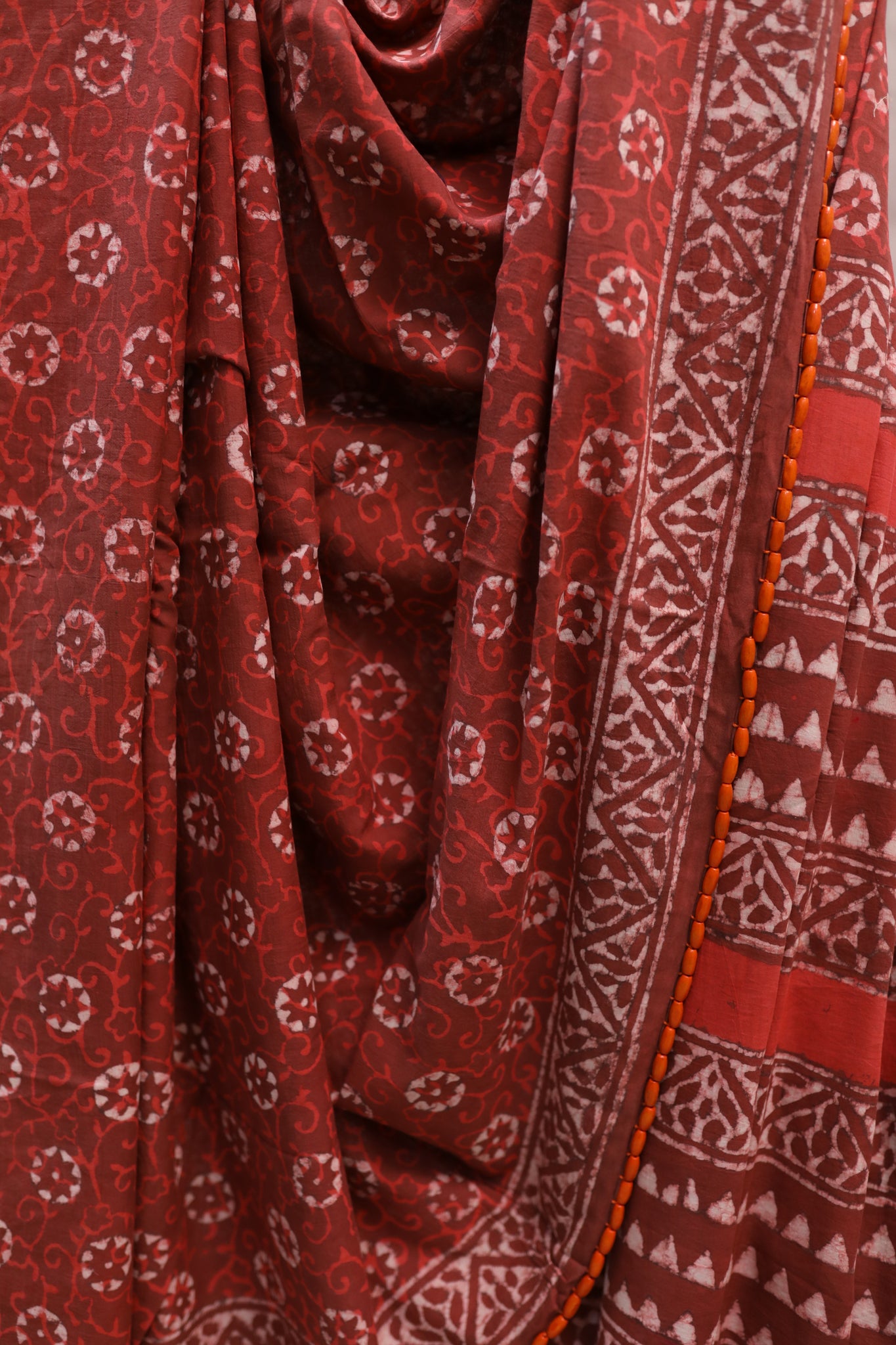 This beautiful maroon handblock printed cotton saree has a contrast printed blouse piece. This saree has attractive print all over. You can try other blouses with this too and for that you can browse through our blouse section. This comfortable cotton saree is a perfect choice for any season and for daily use.