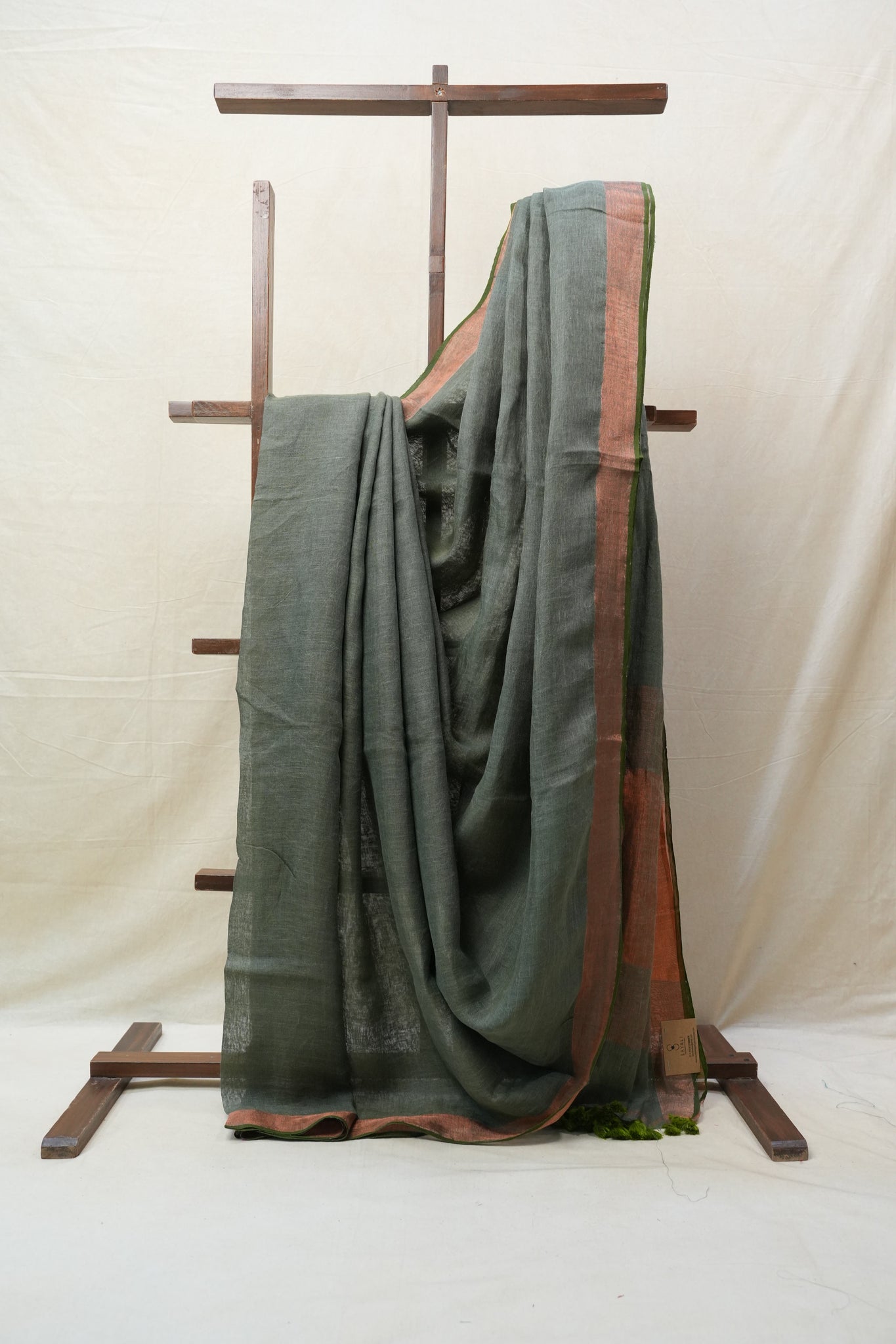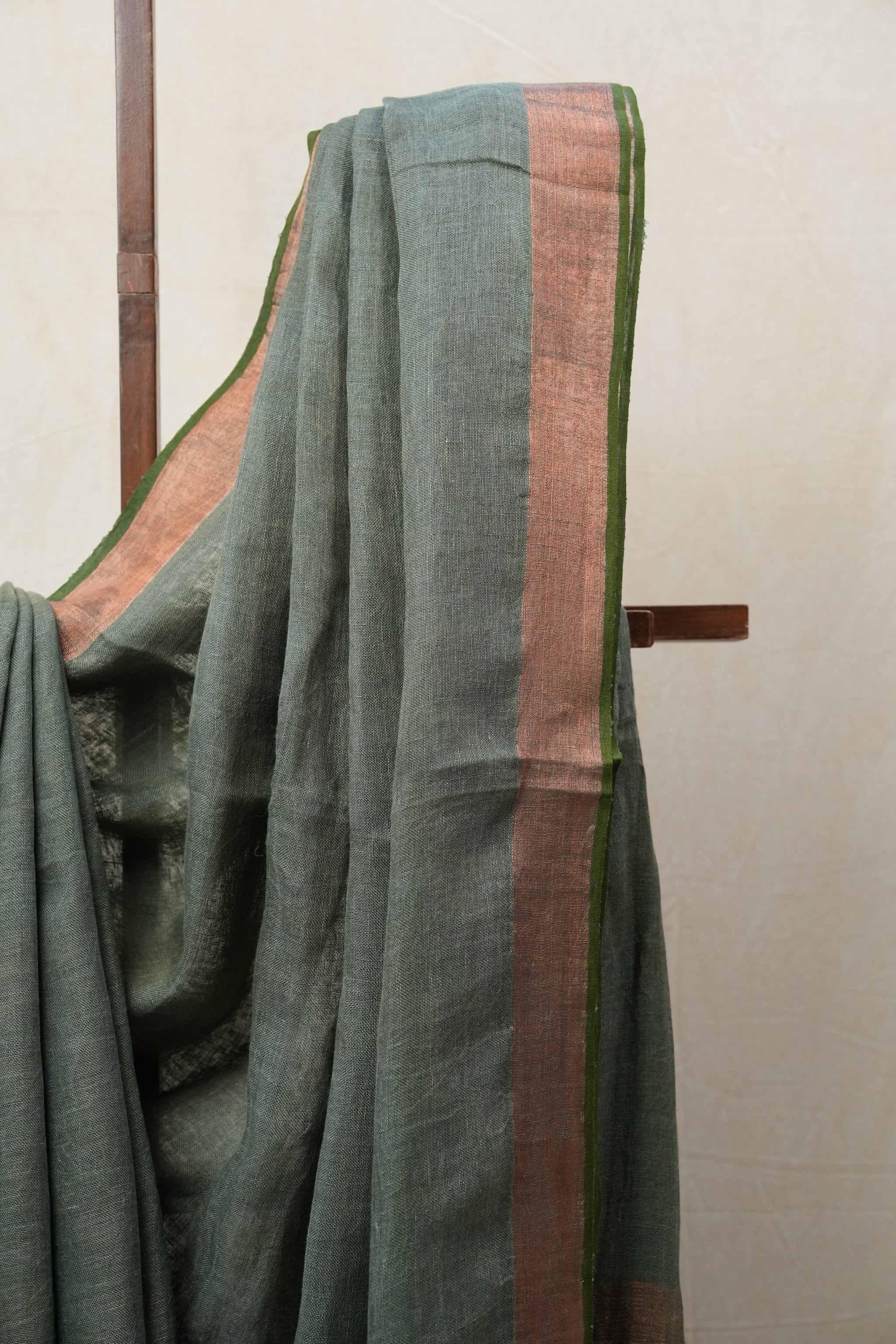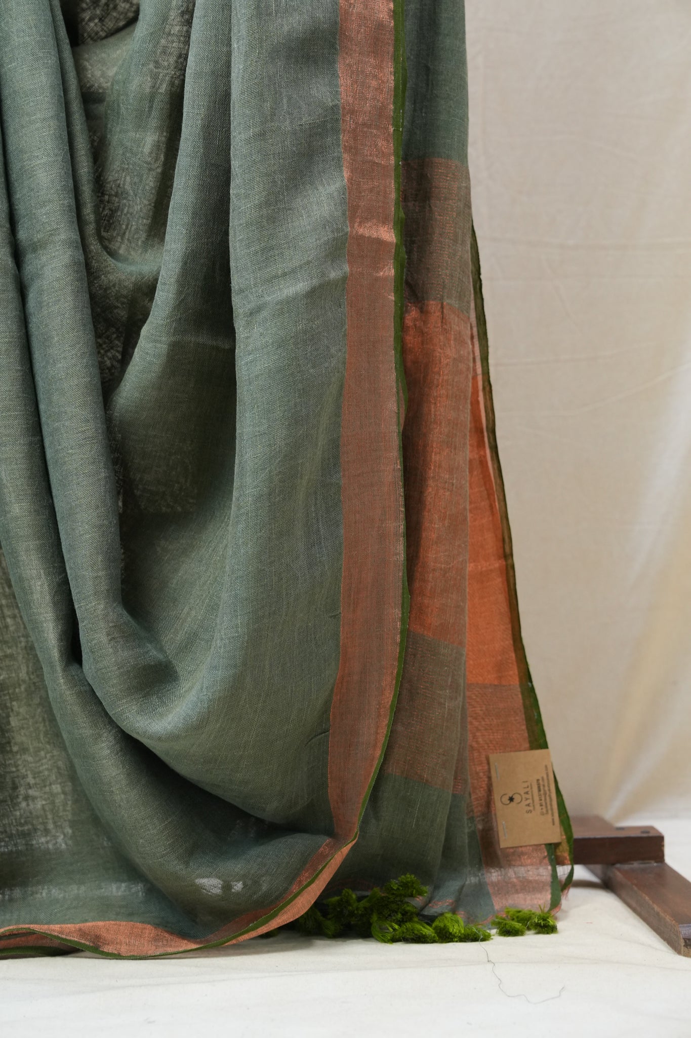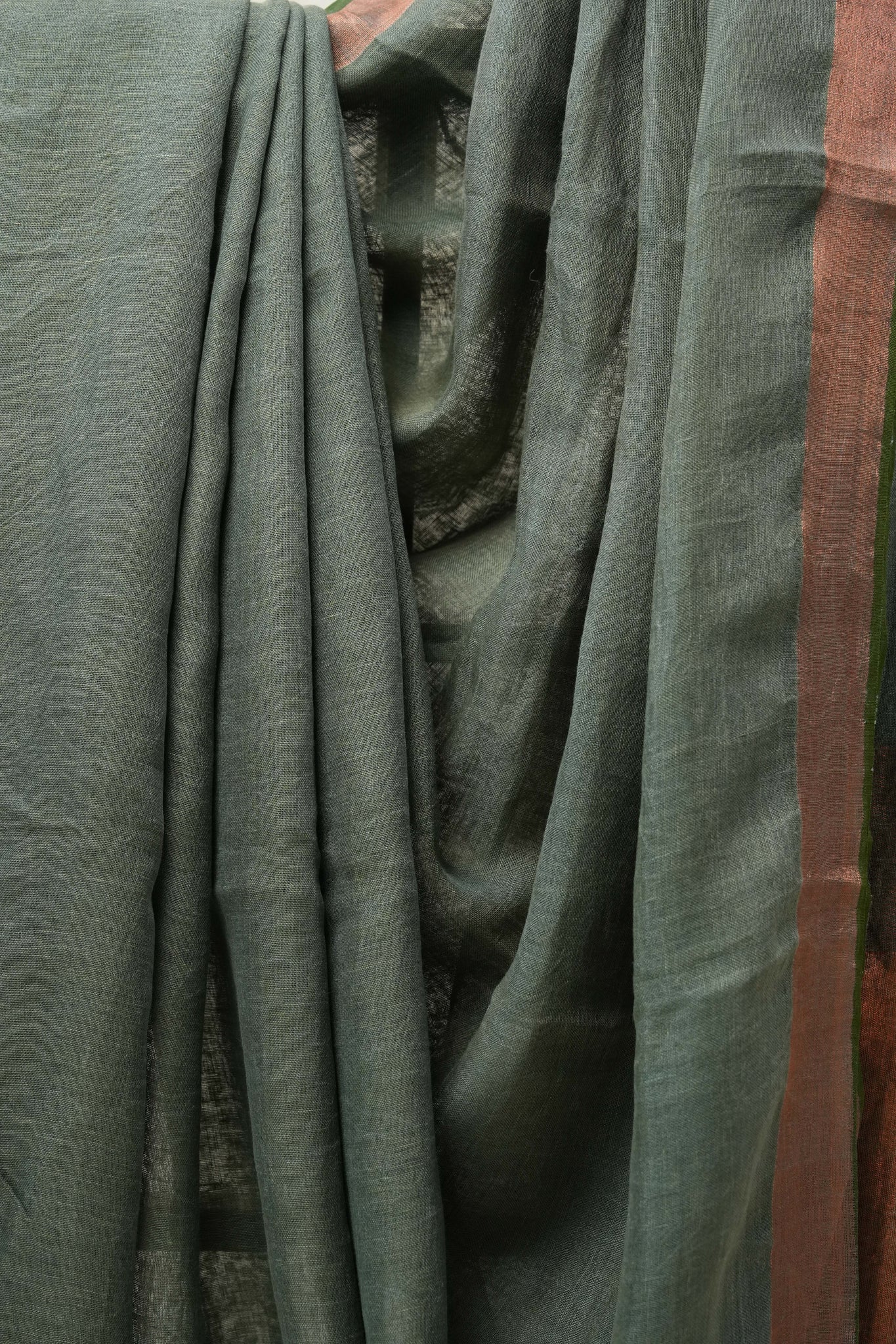 Olive Green Plain Linen Saree With Tassels - SROGPLS277