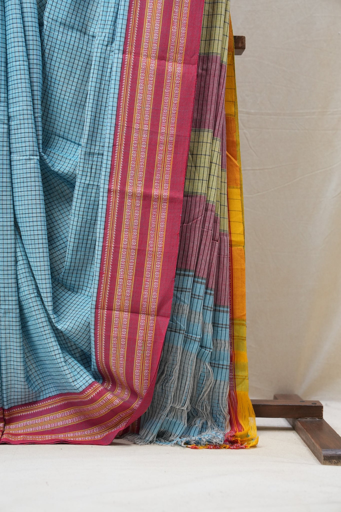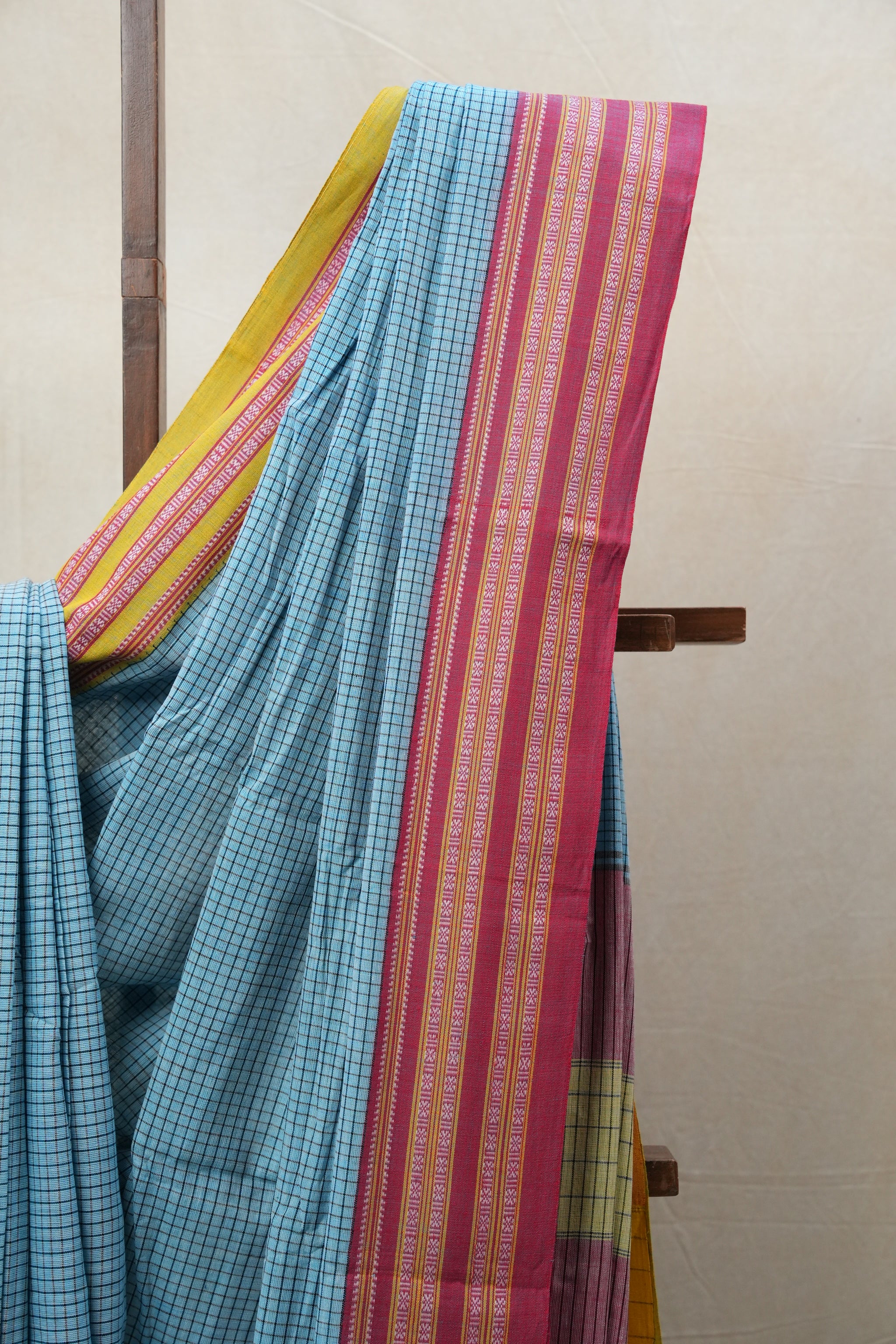 Sky Blue Big Checks Cotton Patteda Anchu Saree - SRSBPAS250