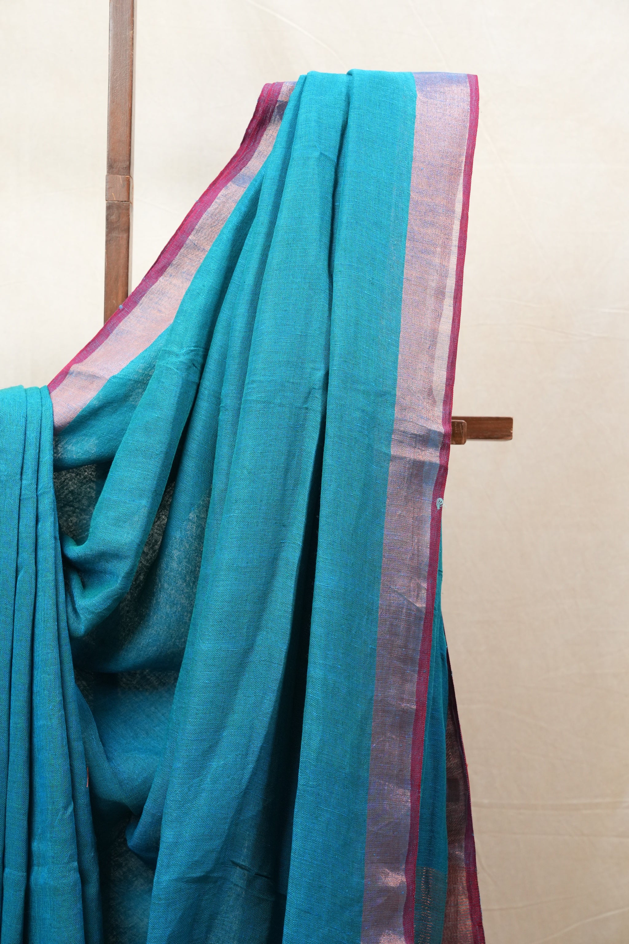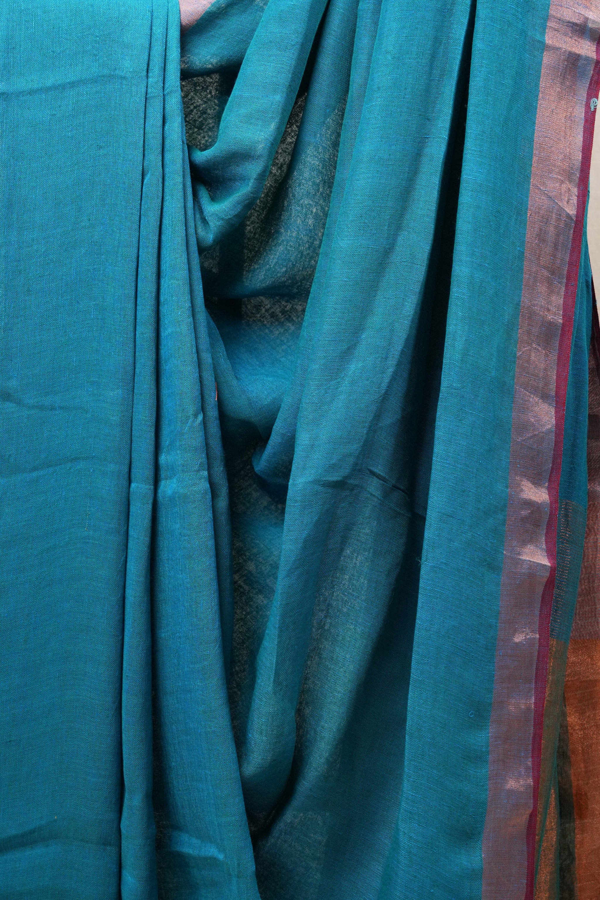 Teal Blue Plain Linen Saree With Green Tassels - SRTBPLS324