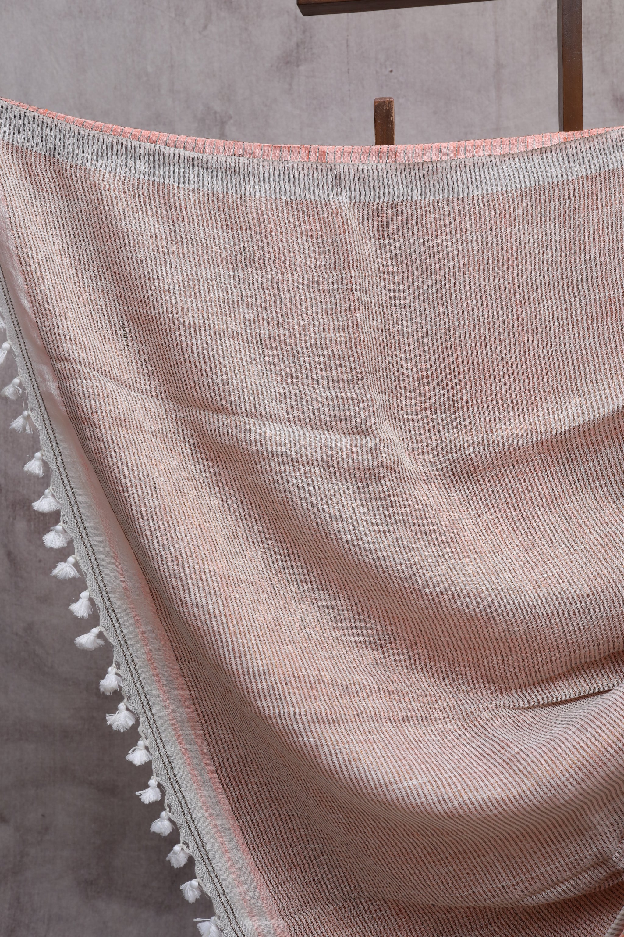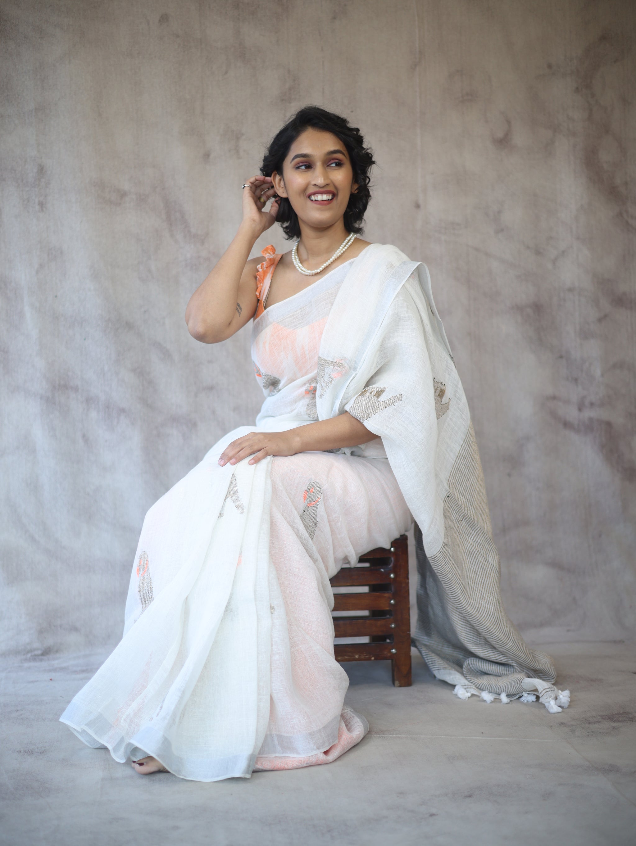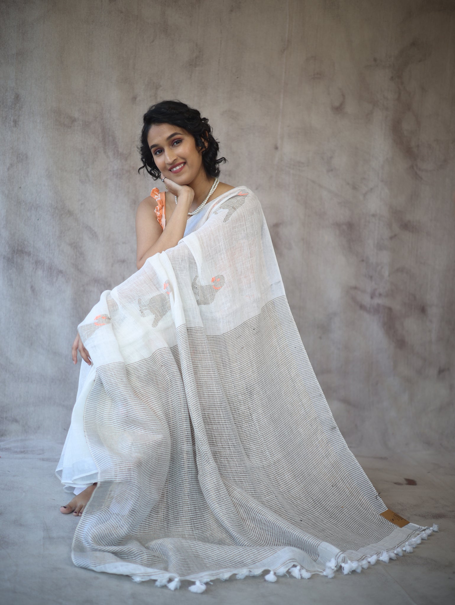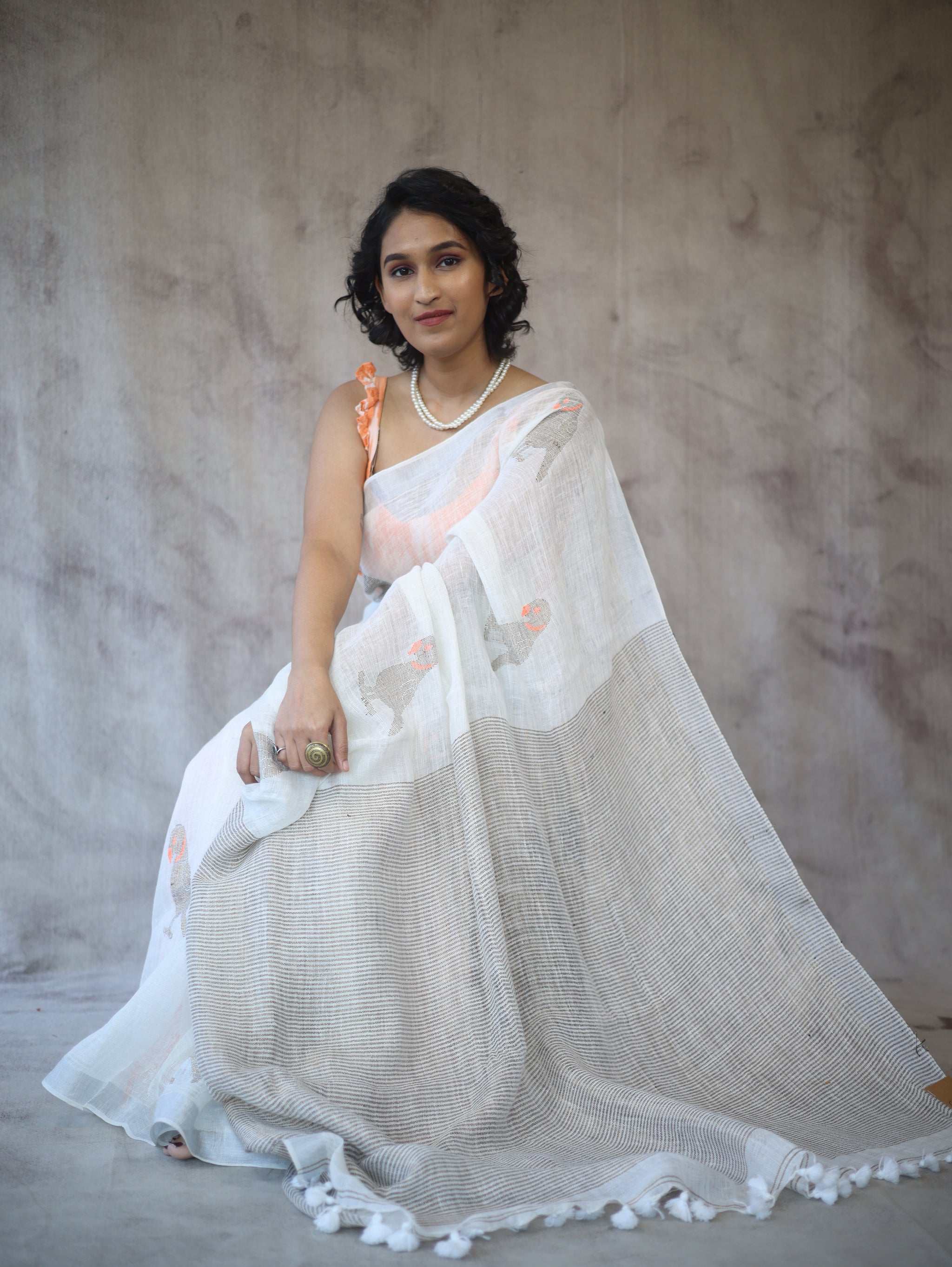 This handloom linen jamdani saree has an all over the jamdani motif. Attractive jamdani weaving pallu with beautiful tassels and running blouse piece. A linen jamdani saree is a graceful and elegant traditional Indian garment made from high-quality linen fabric. Jamdani is a weaving technique that originated in Dhaka, Bangladesh, and is known for its intricate and delicate motifs. The saree features beautiful handwoven designs and patterns.