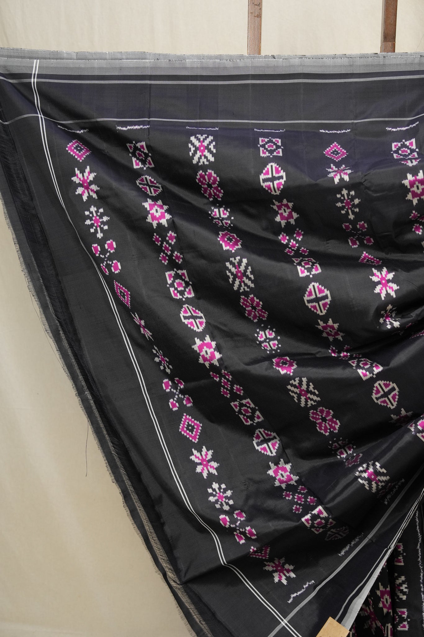 Work - This Pochampally Ikat saree features intricate motifs woven in traditional double ikat technique.