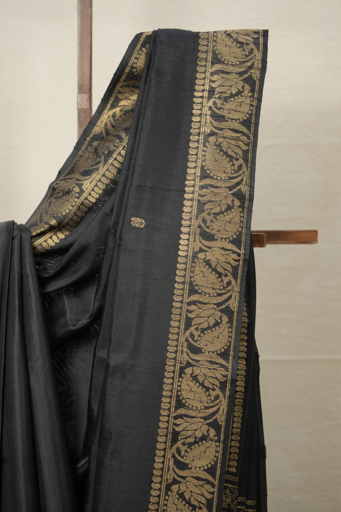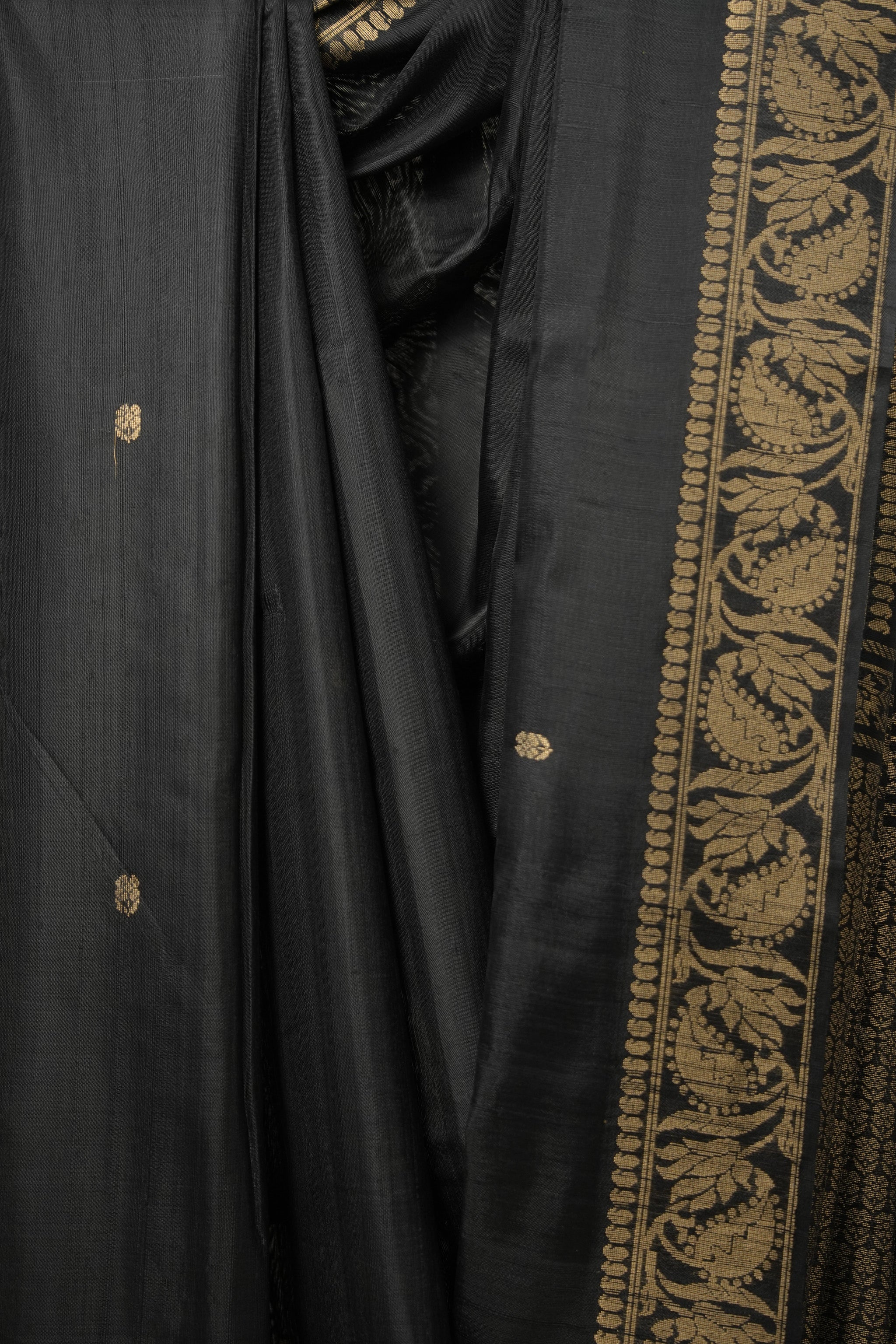 Work - This raw silk saree features a black base with woven motifs and a solid gold border, showcasing a rich and elegant look.