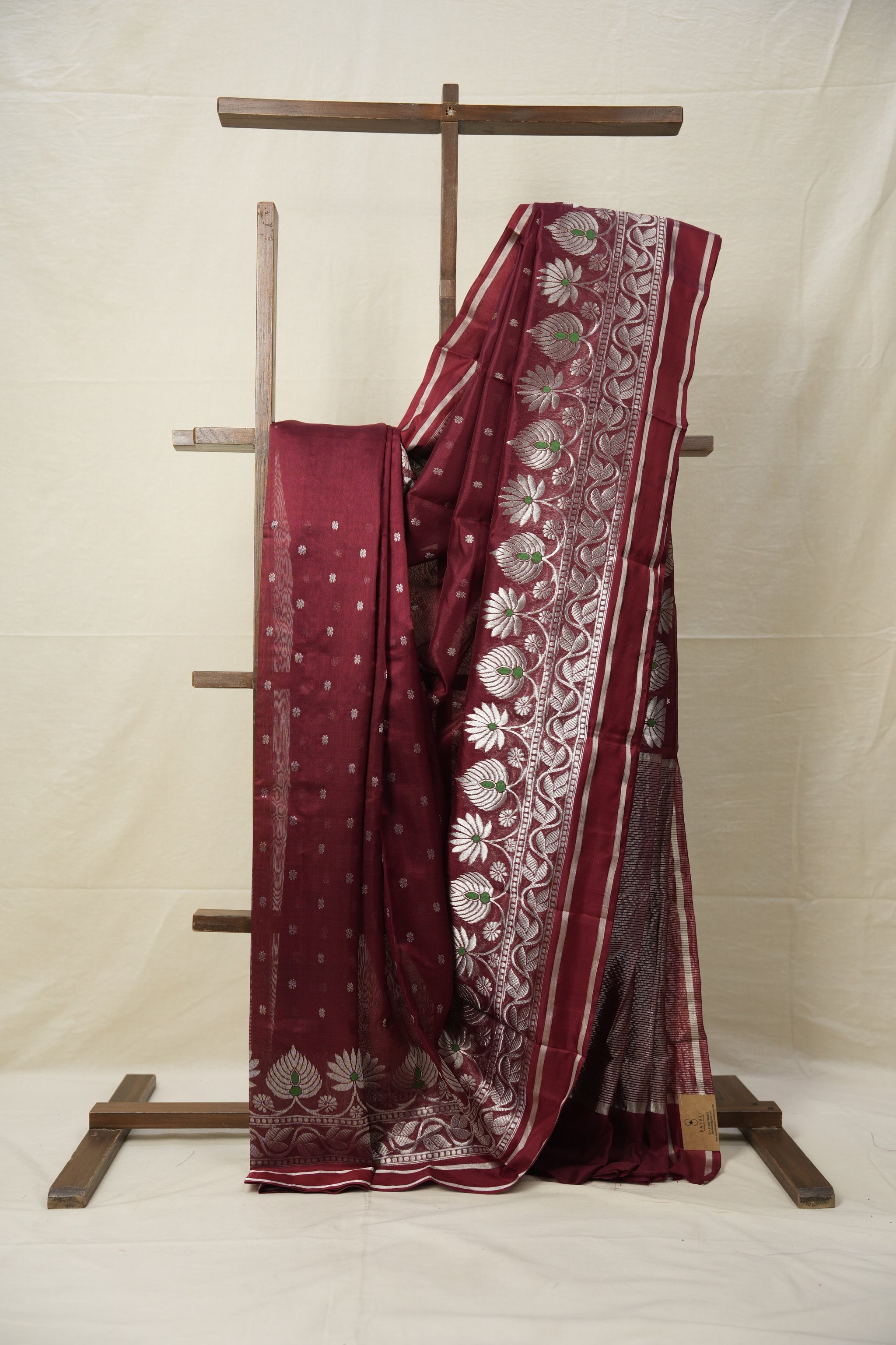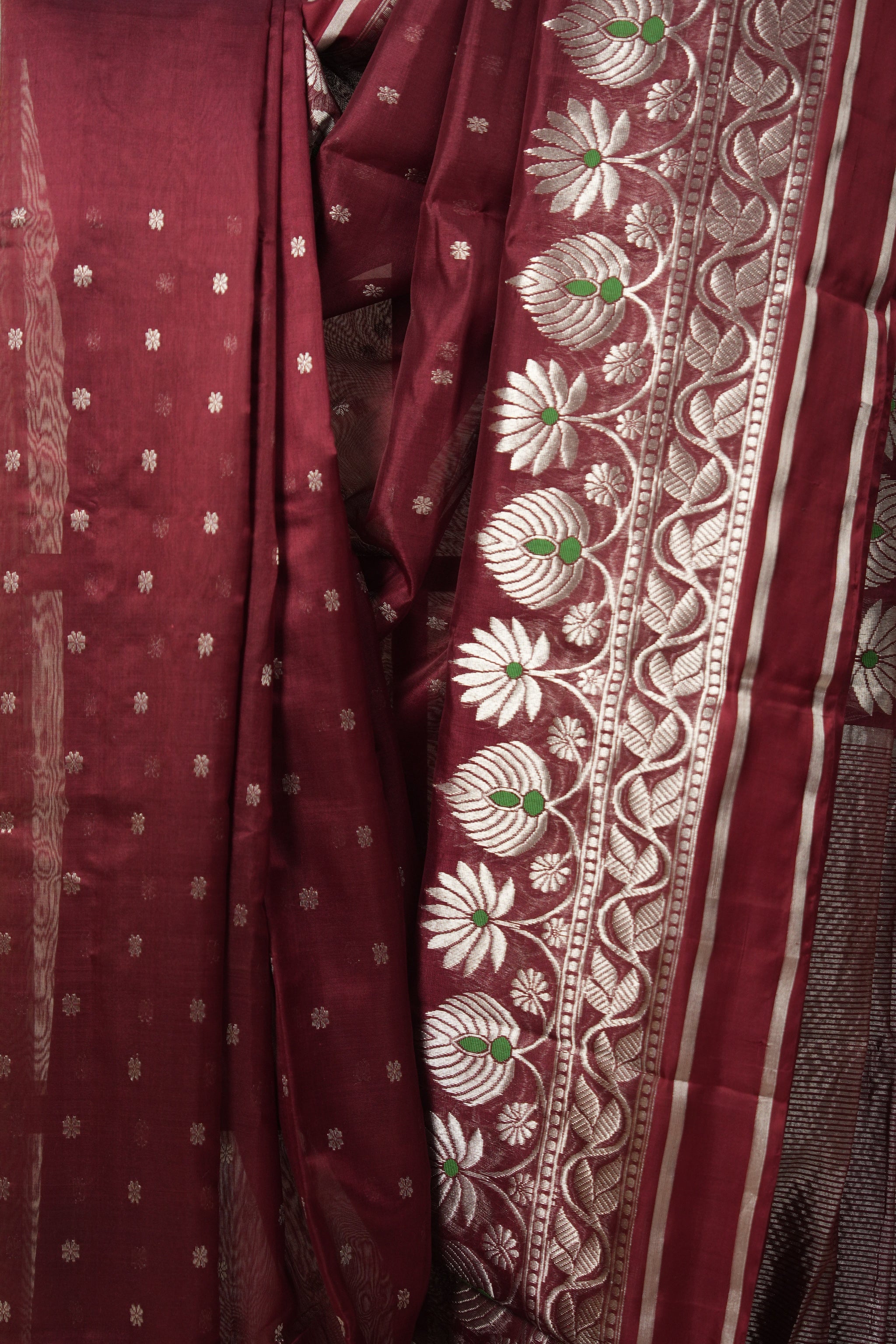 Work - Chanderi silk saree with brown body, silver butti motifs, and elegant zari with plain border.