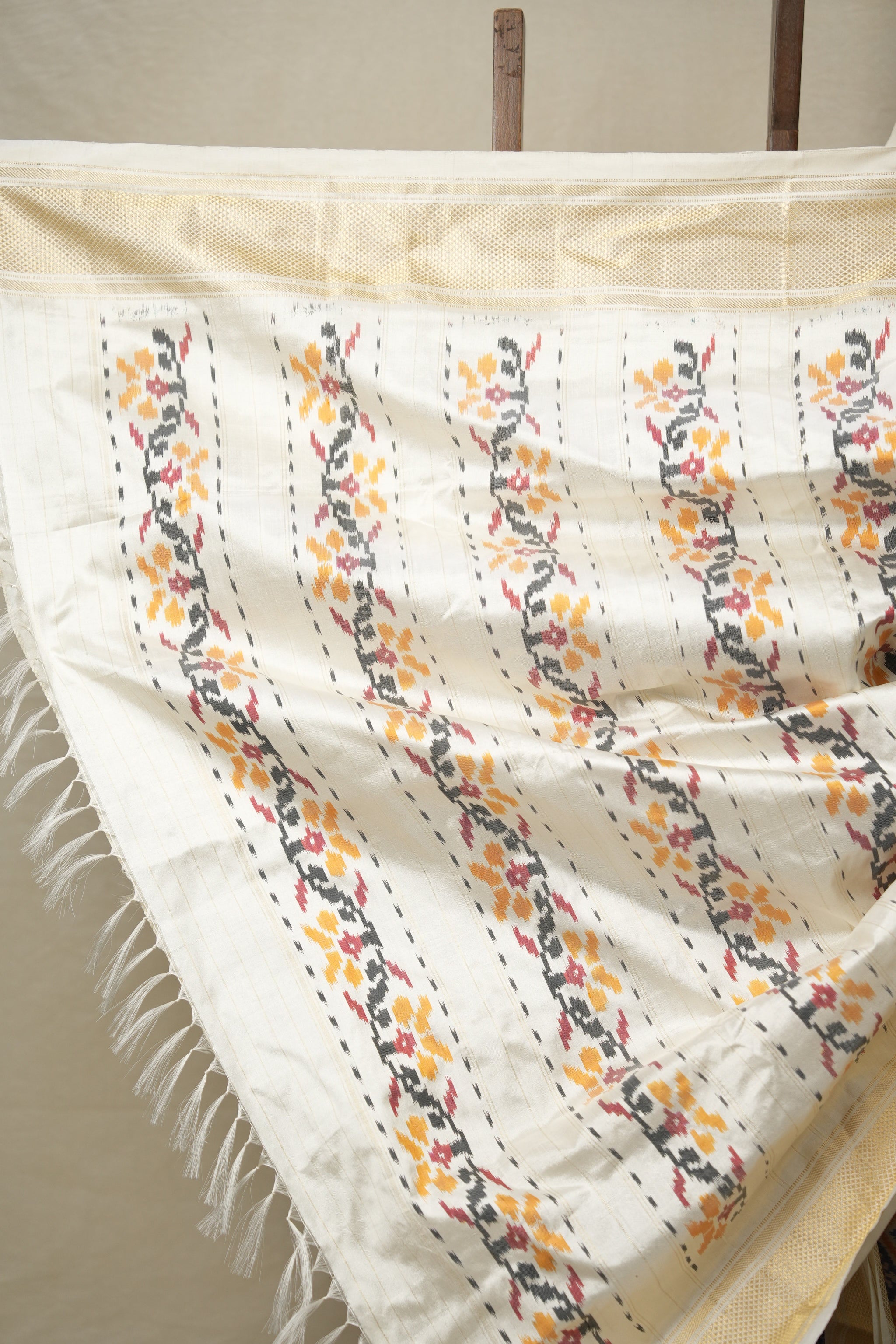 Work - This Pochampalli Ikat saree features plain saree with gold zari kanchi border and ikat pallu.