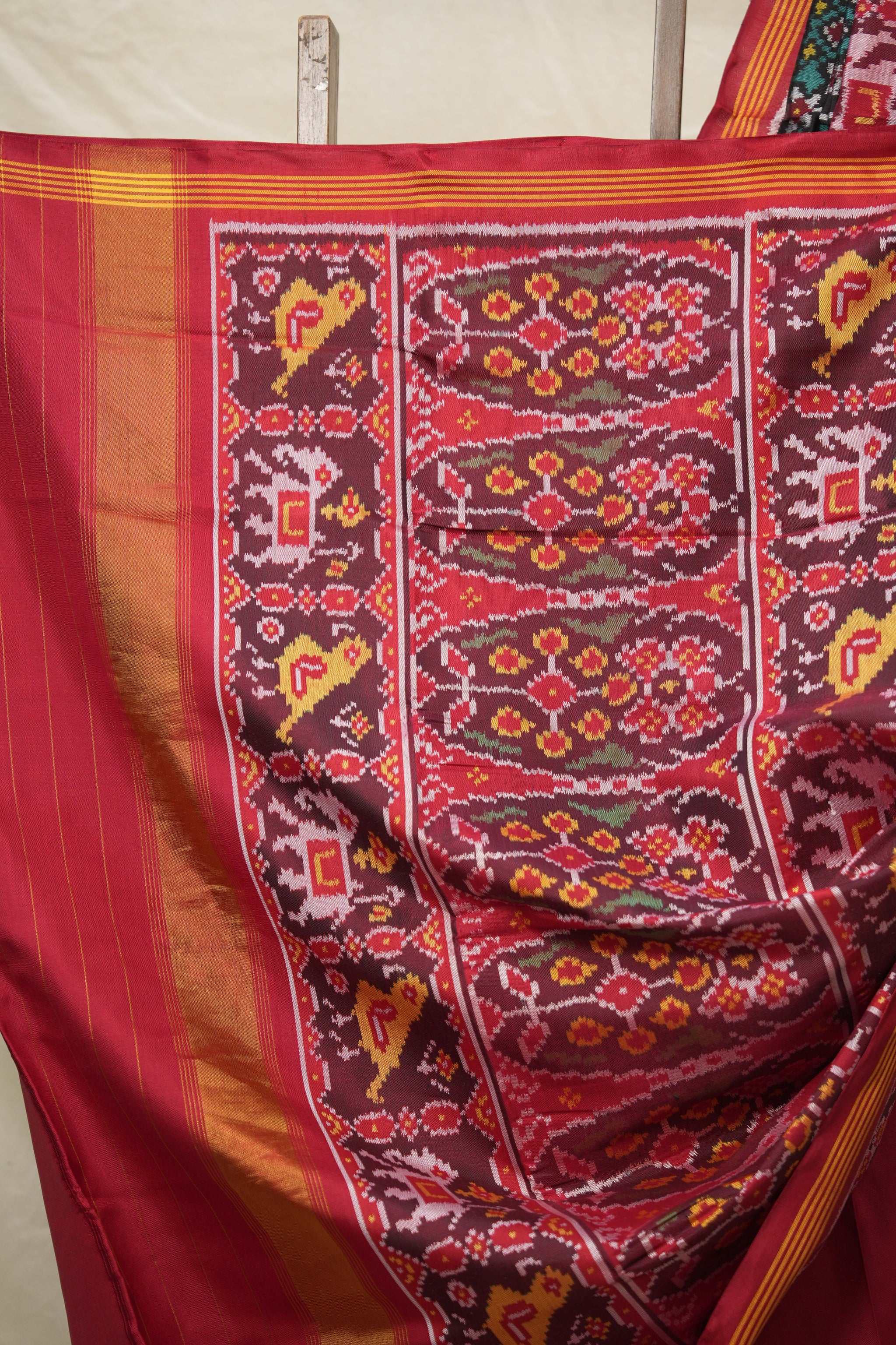 Work - A vibrant patan patola saree with intricately woven geometric design, blending tradition with festive elegance.