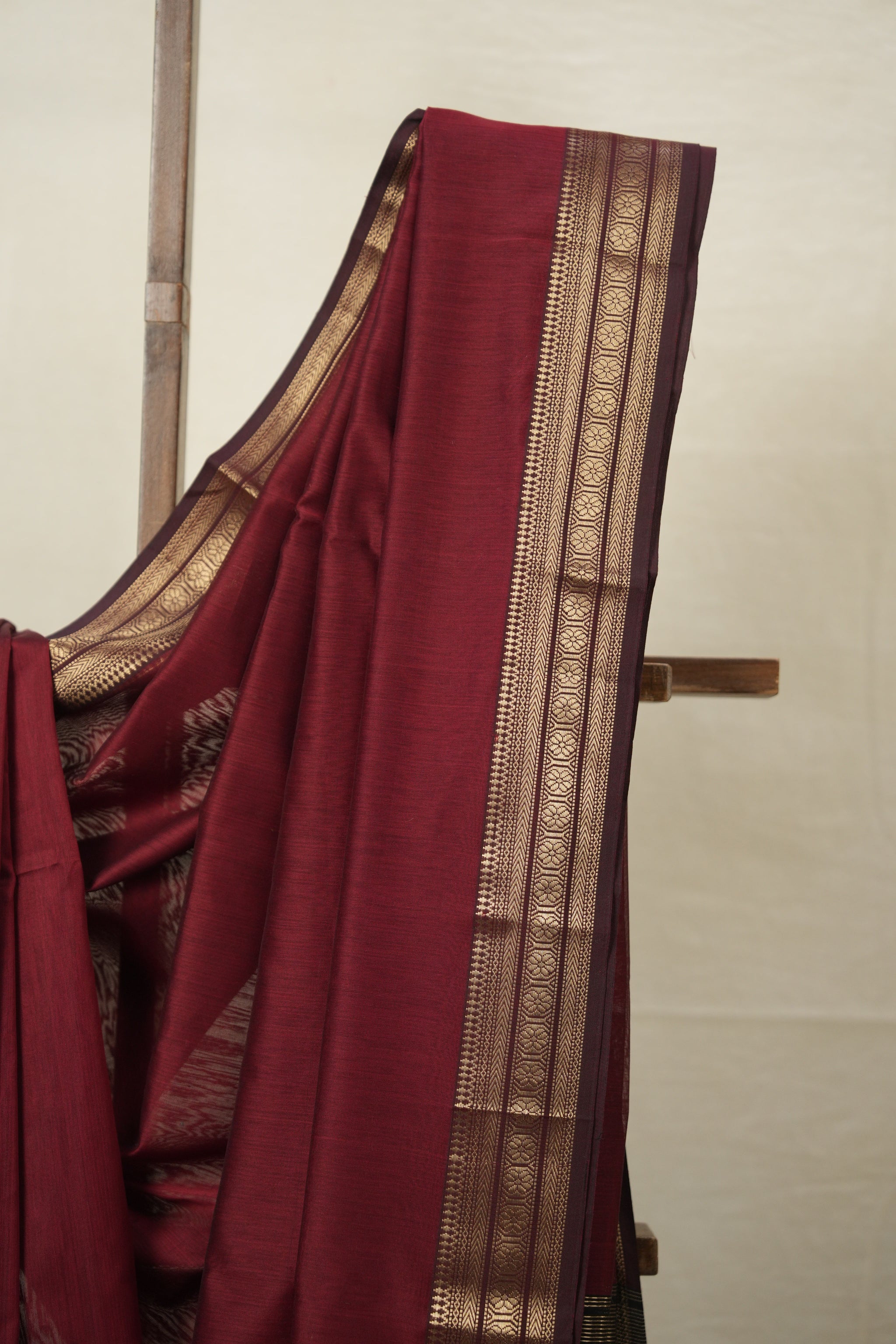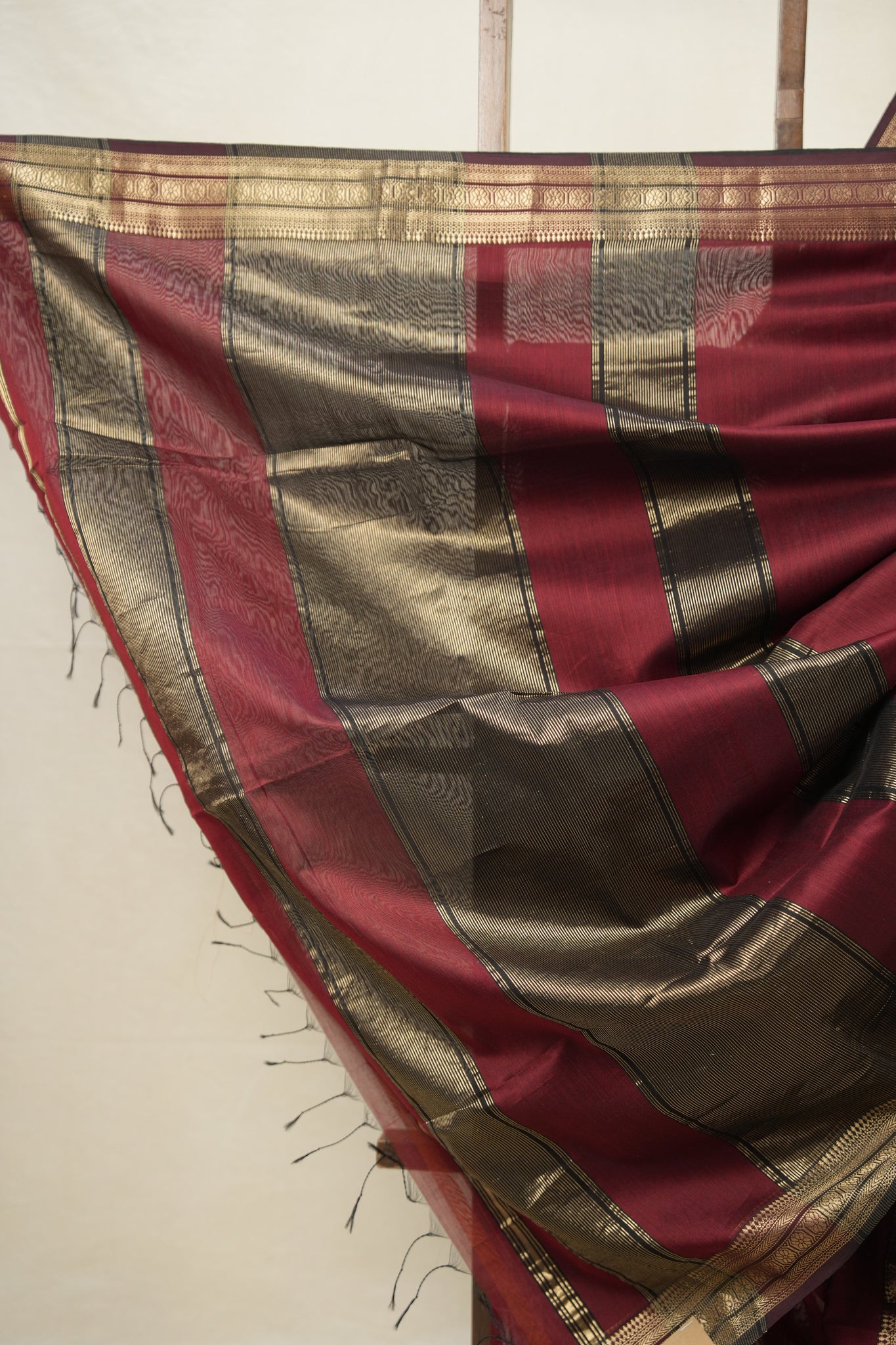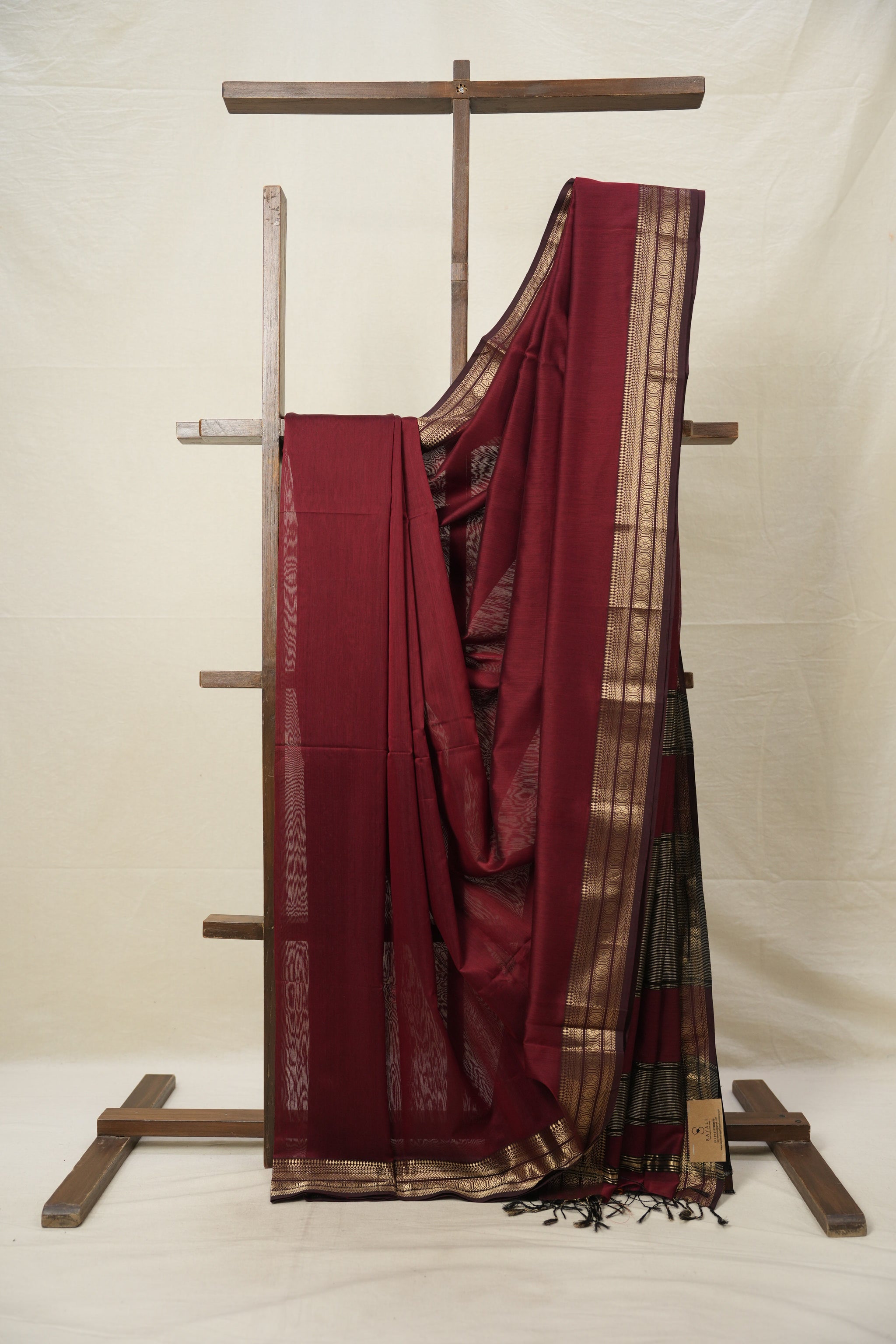 Work - This Maheshwari cotton silk saree features a plain body and zari border and pallu.