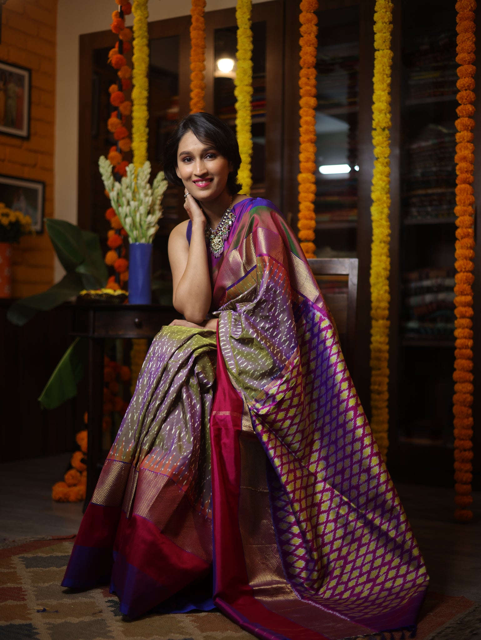 Handloom two tone green ikat saree looks more beautiful with ikat design all over. Elephant pattern makes it look more attractive. This saree has ikat pallu and running blouse piece. This saree can be a unique and special for your special occasions. Pochampalli ikat is a famous ikat from the state of Telangana. This ikat is different from other ikats in form of design and patterns.