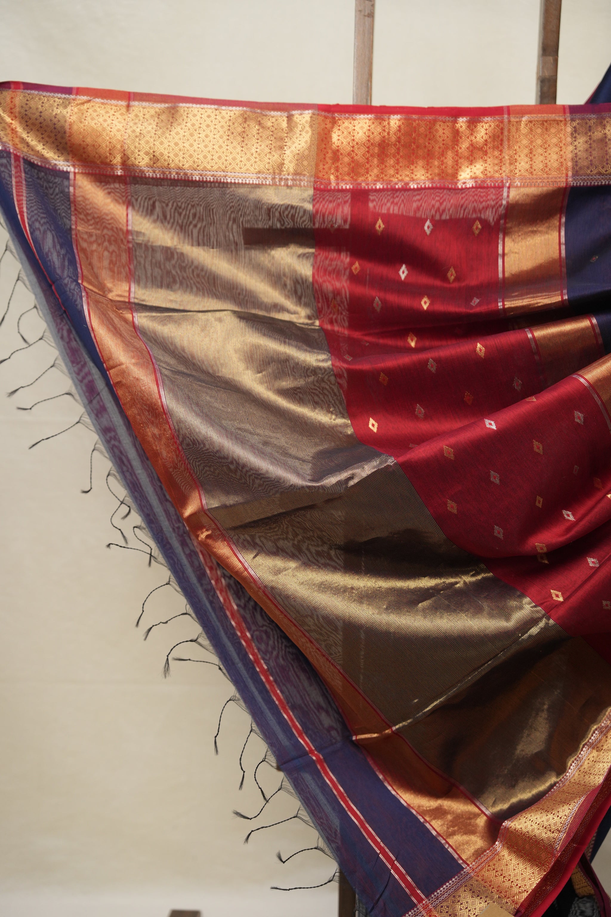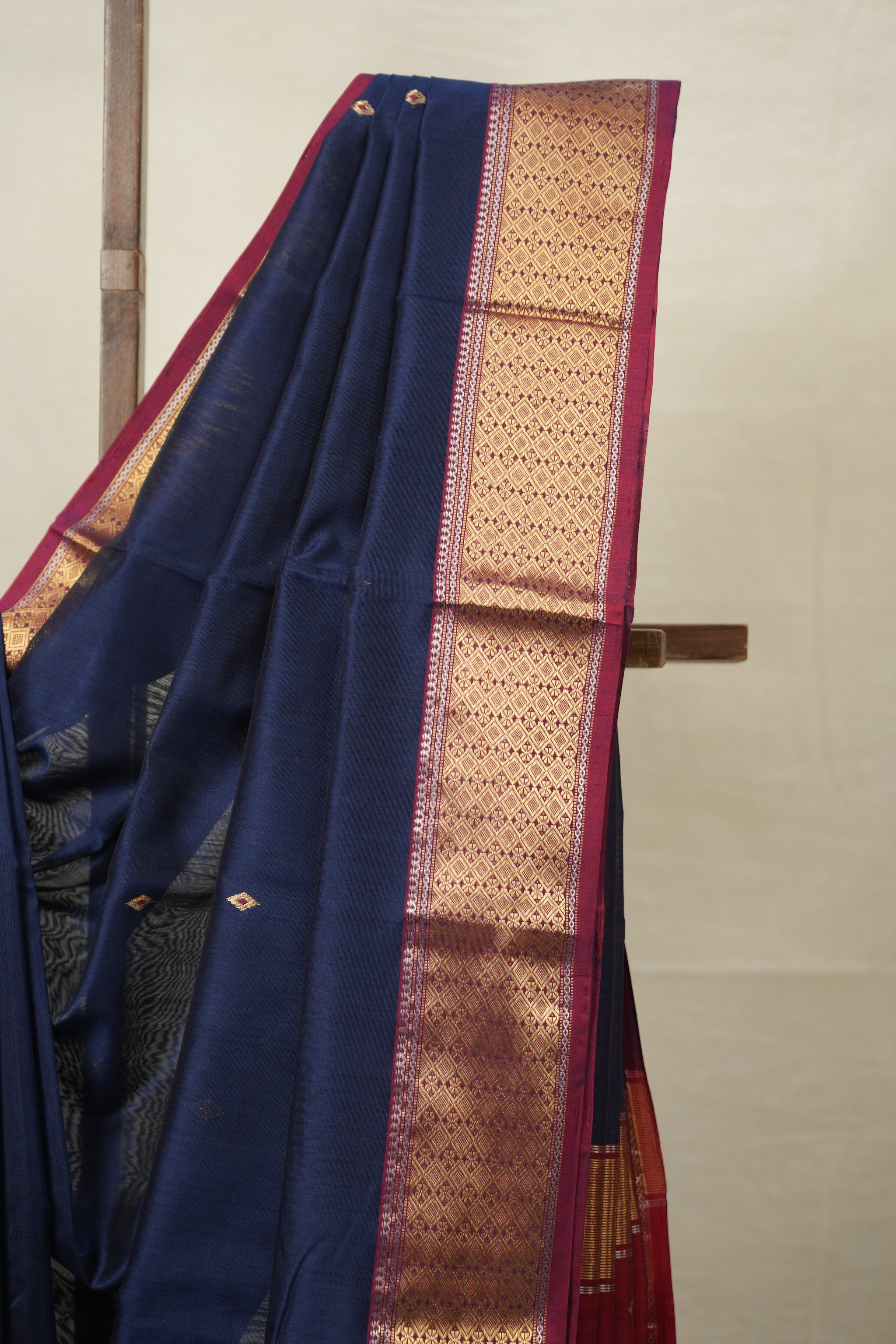 Work - This Maheshwari cotton silk saree features a plain body with butti and contrast gold zari border and pallu.