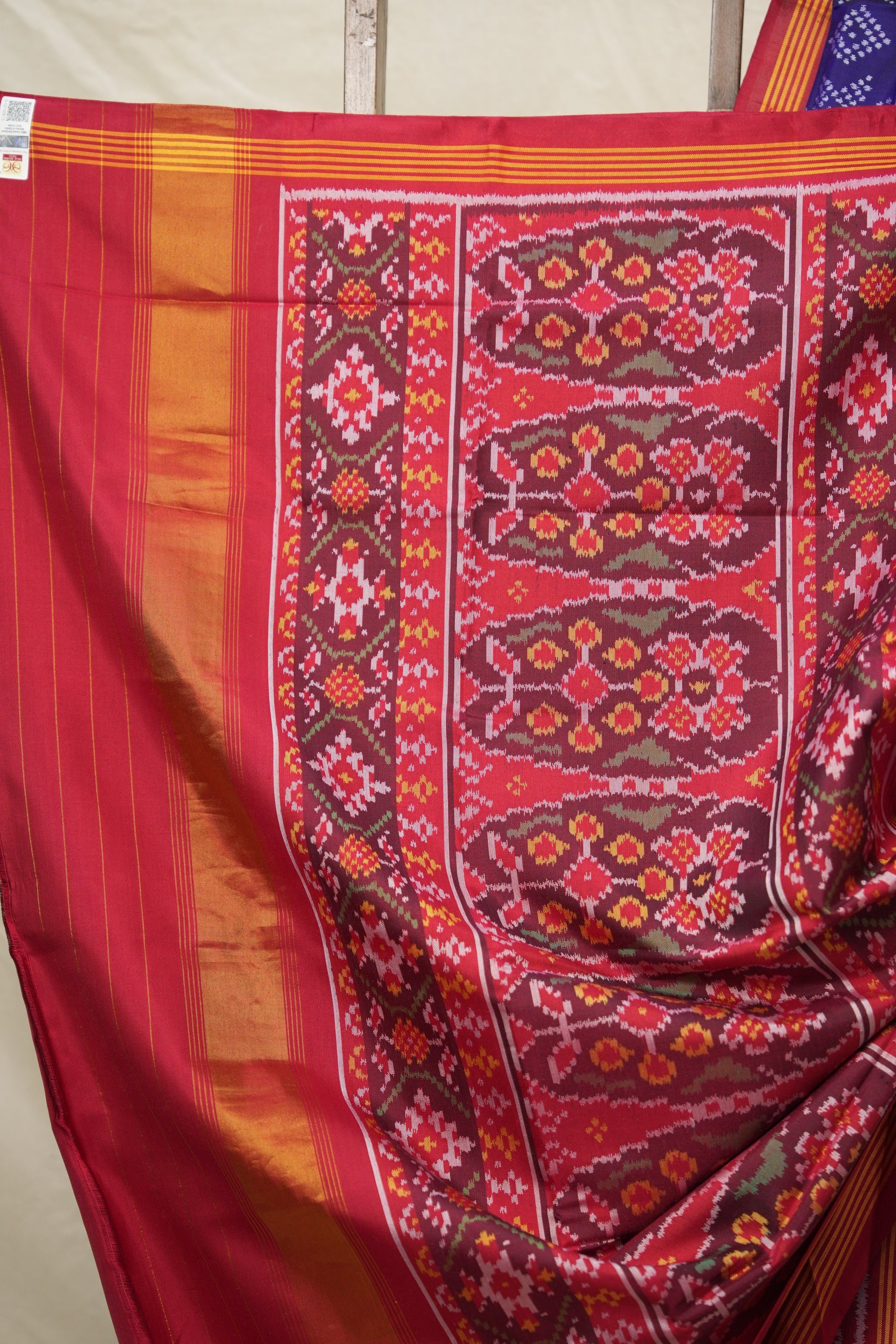 Work - A vibrant patan patola saree with intricately woven geometric design, blending tradition with festive elegance.