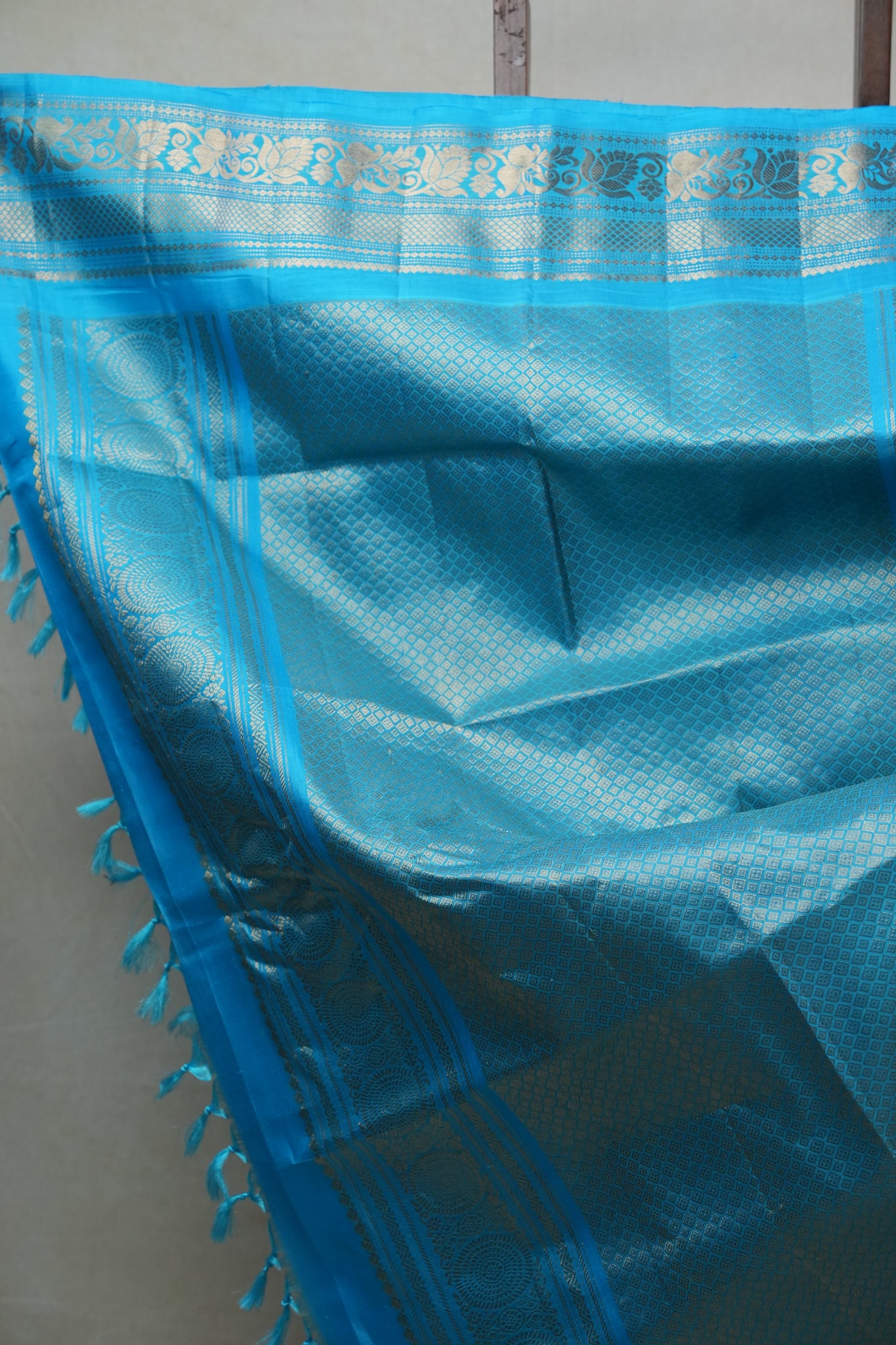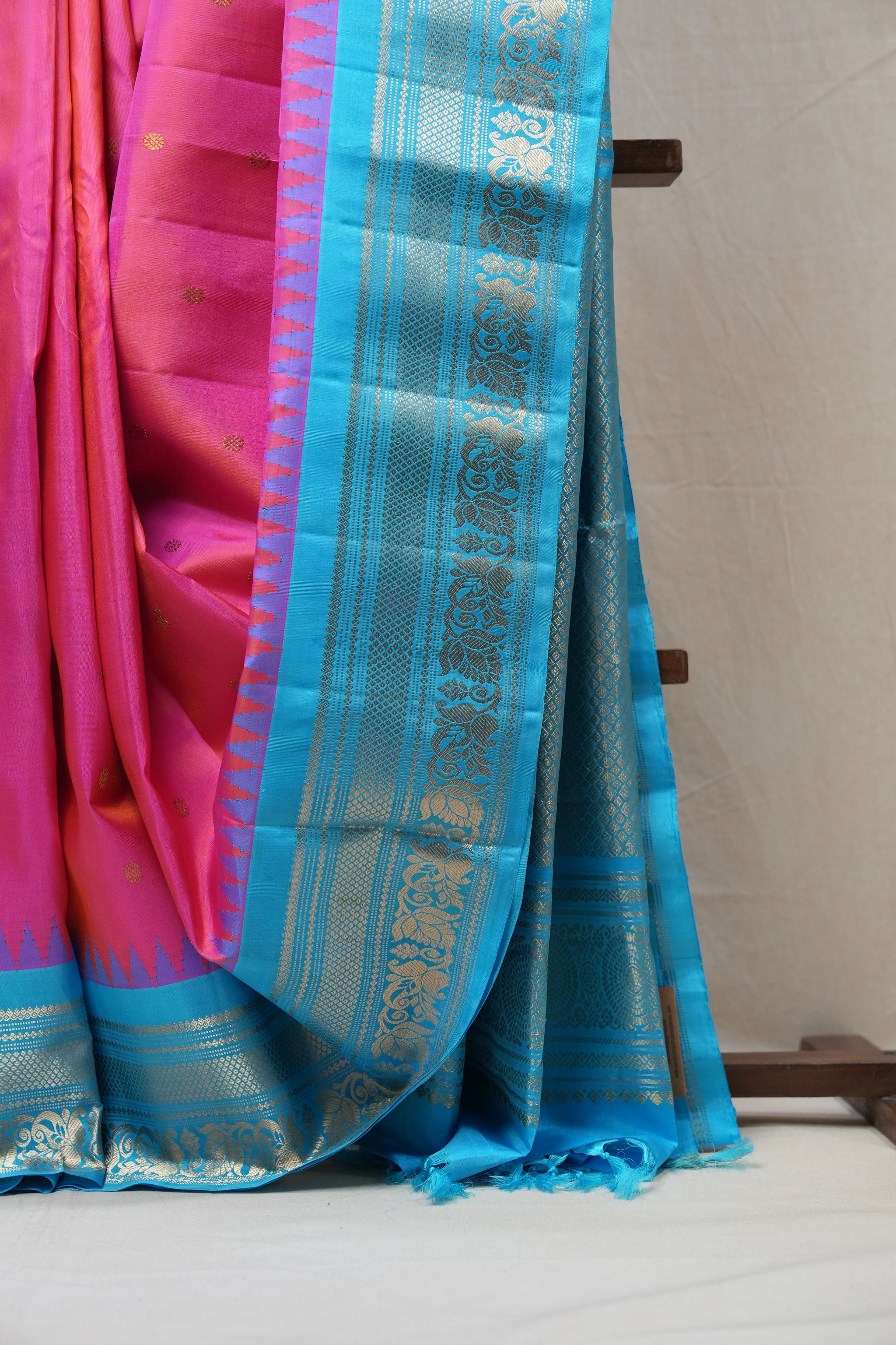 Work - This Gadwal silk saree features a plain pink body adorned with small golden buttas and a contrasting blue border with pallu.