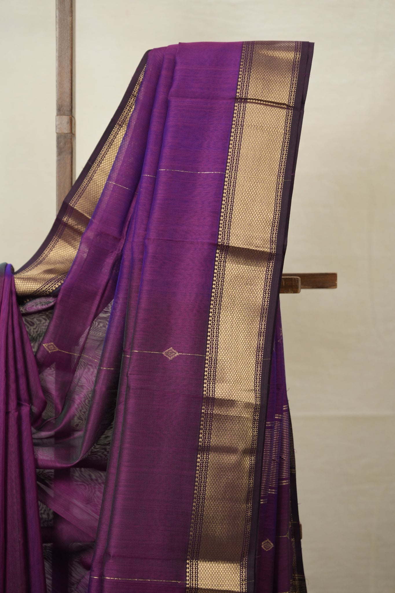 Work - This Maheshwari cotton silk saree features a plain body with butti and contrast gold zari border and pallu.